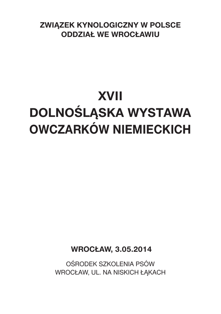 ZWIĄZEK KYNOLOGICZNY W POLSCE ODDZIAŁ WE WROCŁAWIU XVII DOLNOŚLĄSKA WYSTAWA OWCZARKÓW NIEMIECKICH WROCŁAW, 3.05.2014 OŚRODEK SZKOLENIA PSÓW WROCŁAW, UL. NA NISKICH ŁĄKACH WSTĘP Organizatorzy XVII Dolnośląskiej Wystawy Owczarków Niemieckich z radością witają wszystkich Wystawców, Hodowców, Sędziów kynologicznych, zaproszonych Gości oraz Zwiedzających. W tym roku, po raz kolejny zgłoszono na naszą Wystawę bardzo dużą liczbę psów – 164 (w tym 104 owczarki krótkowłose i 60 długowłosych) z całej Polski, a także z zagranicy: Niemiec, Rosji, Słowacji. Oceniać je będą trzej uznani sędziowie SV z Niemiec – Albrecht Woerner, Reinhard Meyer i Wilfried Scheld. Wystawę Owczarków Niemieckich organizujemy po raz siedemnasty, a po raz czwarty na terenie naszego oddziałowego Ośrodka Szkolenia Psów we Wrocławiu. Atrakcyjnie usytuowany nad brzegiem Oławki teren Wystawy i popularność owczarków niemieckich, pozwalają nam mieć nadzieję, że zainteresujemy Wystawą bardzo szerokie grono zwiedzających zarówno z Wroclawia, jak i z okolic. Z całego serca życzymy Wystawcom jak największych sukcesów, Sędziom dobrej atmosfery na ringach i dużo zadowolenia z jakości ocenianych psów, a Gościom miłych wrażeń i przeżyć na Wystawie. Komitet Organizacyjny Wrocław, maj 2014 Serdecznie dziękujemy Sponsorom i Fundatorom nagród za uatrakcyjnienie Wystawy, Zarządowi Oddziału we Wrocławiu za umożliwienie jej organizacji, a wszystkim, którzy w jakikolwiek sposób włączyli się w jej przygotowanie za przychylność i bezinteresowną pomoc. Komitet Organizacyjny PROGRAM WYSTAWY od godz. 730 do 900 – godz. 900 – od godz. 1300 do 1330 – godz. 1700 – przyjmowanie psów na Wystawę otwarcie Wystawy i rozpoczęcie sędziowania psów na ringach przerwa w sędziowaniu zamknięcie Wystawy OBSADA SĘDZIOWSKA RING I: Reinhard Meyer (D-SV) – owczarki niemieckie krótkowłose, psy (41) RING II: Albrecht Woerner (D-SV) –owczarki niemieckie krótkowłose, suki (63) RING III: Wilfried Scheld (D-SV) –owczarki niemieckie długowłose, psy i suki (60) KOMITET ORGANIZACYJNY Przewodniczący – Gospodarz – – Sekretarz – Spiker – Członkowie – Obsługa ringów – Dokumentacja – Iwona Magdziarska Janusz Arnold (kierownik Sekcji) Eugeniusz Skórzewski (gospodarz terenu) Jolanta Wajdzik Aleksander Skrzyński członkowie Sekcji Owczarka Niemieckiego O/Wrocław Mariusz Śliwiński Jolanta Wajdzik KLASY WYSTAWOWE Klasa młodszych szczeniąt – psy i suki w wielu od 4 do 6 miesięcy Klasa szczeniąt – psy i suki w wieku od 6 do 9 miesięcy Klasa młodzików – psy i suki w wieku od 9 do 12 miesięcy Klasa młodzieży – psy i suki w wieku od 12 do 18 miesięcy Klasa juniorów – psy i suki w wieku od 18 do 24 miesięcy Klasa otwarta – psy i suki w wieku powyżej 24 miesięcy Klasa użytkowa – psy i suki w wieku powyżej 24 miesięcy z wyszkoleniem obrończym Klas championów – psy i suki z zatwierdzonym tytułem championa wystawowego Klasa weteranów – psy i suki w wieku powyżej 8 lat OCENY W klasie młodszych szczeniąt, szczeniąt i młodzików: wybitnie obiecująca, obiecująca, mało obiecująca W pozostałych klasach: doskonała, bardzo dobra, dobra, dostateczna, dyskwalifikująca, nie do oceny TYTUŁY Zwycięzca Młodzieży – tytuł przyznawany według uznania sędziego w klasie młodzieży psu i suce z oceną doskonałą I lokatą w każdej rasie oddzielnie (łącznie maksimum 4 tytuły). Zwycięzca – tytuł przyznawany w klasie użytkowej psu i suce z oceną doskonałą I lokatą w każdej rasie oddzielnie (łącznie maksimum 4 tytuły). CWC – wniosek na Wystawowego Championa Polski. Mogą go otrzymać według uznania sędziego psy i suki z oceną doskonałą I lokatą w klasach: juniorów, otwartej, użytkowej i championów. OBJAŚNIENIA WAŻNIEJSZYCH SKRÓTÓW Champ.PL Mł.Champ.PL Zw.Św. Zw.Mł. IPO, SchH PKR SZ, RKF, SUCHNO Kkl. nr rej. O M Hod. Wł. – – – – – – – – – – – – – Champion Polski Młodzieżowy Champion Polski Zwycięzca Świata Zwycięzca Młodzieży wyszkolenie obrończe w różnych krajach Polska Księga Rodowodowa numery rodowodów z innych krajów Körung numer rejestracyjny ojciec matka hodowca właściciel NAGRODY GŁÓWNY SPONSOR WYSTAWY Hodowla owczarków niemieckich długowłosych „Andomi Poland” Dorota Pikulska, ul. Polna 7, 55-095 Mirków, tel. 606 122 182 KARMA Interquell GmbH Südliche Hauptstr.38 86517 Wehringen Koordynator ds. hodowli, Mateusz Wilk tel. 509 727 828 Karma Happy Dog Super Premium – 15 kg karmy za l lokatę w klasach: młodzieży, juniorów i użytkowej – 4 kg karmy za II i III lokatę w klasach: młodzieży, juniorów i użytkowej – 1 kg karmy za IV i następne lokaty w klasach: młodzieży, juniorów i użytkowej – 4 kg karmy za l i II lokatę w klasach: otwartej, championów i weteranów – 1 kg karmy za III i następne lokaty w klasie otwartej ATRAKCYJNE ZESTAWY VIP Royal Canin Polska sp. z o.o. ul. Grabska 10 32-005 Niepołomice Kontakt do dystrybucji w Poznaniu: tel. 616 241 692 – dla wszystkich wystawionych psów i suk krótkowłosych i długowłosych w klasach: młodszych szczeniąt, szczeniąt i młodzików – – – NAGRODY SPECJALNE Firma DINGO dla zwycięzcy klasy użytkowej psa krótkowłosego i długowłosego rękaw do ćwiczeń obrony Hodowla owczarków niemieckich „z Byczyńskiej Doliny”, Bogusław Jagieła, ul. Miechowa 45, 46-220 Byczyna, tel. 502 424 801 dla zwycięzcy klasy użytkowej suki krótkowłosej i długowłosej kojec porodowy Hodowle „vom Haus Tchorz” & „Wolf-Gang” puchar przechodni im. Mariana Taurogińskiego dla najlepszego w klasie użytkowej psa krótkowłosego z Oddziału we Wrocławiu PUCHARY I NAGRODY INDYWIDUALNE – Zarząd Oddziału we Wrocławiu – Hodowla „Kas-Kat”, Janusz Bułka i Małgorzata Cisło – Hodowla „Wilczy Szaniec”, Zdzisław Godlewski – Hodowla „Dobrzy