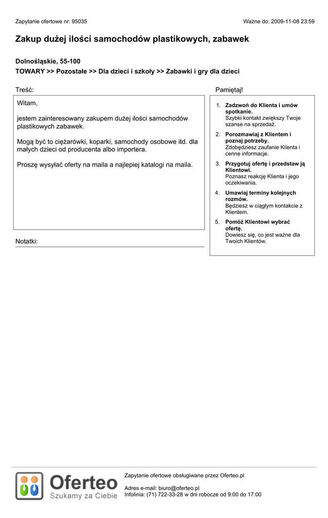 Zapytanie ofertowe nr: 95035 Ważne do: 2009-11-08 23:59 Zakup dużej ilości samochodów plastikowych, zabawek Dolnośląskie, 55-100 TOWARY >> Pozostałe >> Dla dzieci i szkoły >> Zabawki i gry dla dzieci Treść: Pamiętaj! Witam, 1. Zadzwoń do Klienta i umów spotkanie. Szybki kontakt zwiększy Twoje szanse na sprzedaż. jestem zainteresowany zakupem dużej ilości samochodów plastikowych zabawek. Mogą być to ciężarówki, koparki, samochody osobowe itd. dla małych dzieci od producenta albo importera. Proszę wysyłać oferty na maila a najlepiej katalogi na maila. Notatki: 2. Porozmawiaj z Klientem i poznaj potrzeby. Zdobędziesz zaufanie Klienta i cenne informacje. 3. Przygotuj ofertę i przedstaw ją Klientowi. Poznasz reakcję Klienta i jego oczekiwania. 4. Umawiaj terminy kolejnych rozmów. Będziesz w ciągłym kontakcie z Klientem. 5. Pomóż Klientowi wybrać ofertę. Dowiesz się, co jest ważne dla Twoich Klientów. Zapytanie ofertowe obsługiwane przez Oferteo.pl Adres e-mail: [email protected] Infolinia: (71) 722-33-28 w dni robocze od 9:00 do 17:00