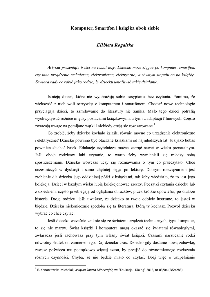 Komputer, Smartfon i książka obok siebie Elżbieta Rogalska Artykuł prezentuje treści na temat tezy: Dziecko może sięgać po komputer, smartfon, czy inne urządzenie techniczne, elektroniczne, elektryczne, w równym stopniu co po książkę. Zawiera rady co robić jako rodzic, by dziecku umożliwić takie działanie. Istnieją dzieci, które nie wyobrażają sobie zasypiania bez czytania. Pomimo, że większość z nich woli rozrywkę z komputerem i smartfonem. Chociaż nowe technologie przyciągają dzieci, to zamiłowanie do literatury nie zanika. Mało tego dzieci potrafią wychwytywać różnice między postaciami książkowymi, a tymi z adaptacji filmowych. Często zwracają uwagę na pomijane wątki i niekiedy czują się rozczarowane.1 Co zrobić, żeby dziecko kochało książki równie mocno co urządzenia elektroniczne i elektryczne? Dziecko powinno być otaczane książkami od najmłodszych lat. Już jako bobas powinien słuchać bajek. Edukację czytelniczą można zacząć nawet w wieku prenatalnym. Jeśli oboje rodziców lubi czytanie, to warto żeby wymieniali się miedzy sobą spostrzeżeniami. Dziecko wówczas uczy się rozmawiania o tym co przeczytało. Chce uczestniczyć w dyskusji i samo chętniej sięga po lekturę. Dobrym rozwiązaniem jest zrobienie dla dziecka jego oddzielnej półki z książkami, tak żeby wiedziało, że to jest jego kolekcja. Dzieci w każdym wieku lubią kolekcjonować rzeczy. Początki czytania dziecku lub z dzieckiem, często przebiegają od oglądania obrazków, przez krótkie opowieści, po dłuższe historie. Drogi rodzicu, jeśli uważasz, że dziecko to twoje odbicie lustrzane, to jesteś w błędzie. Dziecku niekoniecznie spodoba się ta literaturą, którą ty kochasz. Pozwól dziecku wybrać co chce czytać. Jeśli dziecko wcześnie zetknie się ze światem urządzeń technicznych, typu komputer, to się nie martw. Świat książki i komputera mogą okazać się światami równoległymi, zwłaszcza jeśli zachowasz przy tym własny świat książki. Czasami narzucanie rodzi odwrotny skutek od zamierzonego. Daj dziecku czas. Dziecko gdy dostanie nową zabawkę, zawsze poświęca mu początkowo więcej czasu, by przejść do równomiernego rozłożenia różnych czynności. Chyba, że nie będzie miało co czytać. Dbaj więc o uzupełnianie 1 E. Konarzewska-Michalak, Książka kontra Minecraft?, w: "Edukacja i Dialog" 2016, nr 03/04 (282/283). biblioteczki pociechy. Kupuj mu prezenty w postaci książki, zaraz obok nowej gry komputerowej. Czasami bardziej się nią ucieszy niż po grze, w której przejdzie wszystkie poziomy i odrzuci w kont, obok tych już wygranych. Jeśli twoje dziecko nie do końca lubi książki, a chciałbyś je nimi zaciekawić, spróbuj metody biblioterapii. Biblioterapia to „zamierzone działanie przy użyciu książki lub materiałów niedrukowanych (np. filmy, płyty DVD, audiobooki, obrazy itp.) prowadzące do celów rewalidacyjnych, resocjalizacyjnych czy ogólnorozwojowych”2. Oznacza to, że możesz w przyjemny dla dziecka i siebie (bo rodzice mogą uczestniczyć wraz z pociechami) sposób, sprawić, że twoje dziecko będzie chciało czytać, przy okazji pozbywając się blokad rozwojowych. Anna Przecławska sugeruje „ Książka - odpowiednio, we właściwym momencie podana młodzieży – może być dla niej istotną pomocą”3. Literatura przedmiotu mówi również o książce jako sprzyjającej odnalezieniu własnej drogi przez dziecko, swojej osobowości, własnego miejsca. Podsumowując w świecie nastawionym na konsumpcję, coraz bardziej stechnizowanym, wydaje się, że brakuje miejsca na edukację czytelniczą, na książki. Rodzice mają wielkie pole do popisu. To głównie środowisko wychowawcze, rodzina, mają predyspozycje do tego, żeby przekazać dziecku zamiłowanie do literatury. Miłość do literatury może iść w parze z chęcią do grania w gry komputerowe, serwowania w sieci na smartfonie. Wszystko jest wynikiem przestrzeni jaką rodzice zorganizują dla dziecka oraz relacji między czytającą matką, czytającym ojcem, a czytającym dzieckiem. Bibliografia: Konarzewska-Michalak E., Książka kontra Minecraft?, w: "Edukacja i Dialog" 2016, nr 03/04 (282/283). Przecławska A., Materiały z badań czytelniczych, Warszawa 1963, s.7. Tomasik E., Zagadnienia pedagogiki specjalnej w literaturze. Przewodnik bibliograficzny, cz. 1 i 2, Warszawa 1992, s. 114. 2 E. Tomasik, Zagadnienia pedagogiki specjalnej w literaturze. Przewodnik bibliograficzny, cz. 1 i 2, Warszawa 1992, s. 114. 3 A. Przecławska, Materiały z badań czytelniczych, Warszawa 1963, s.7.