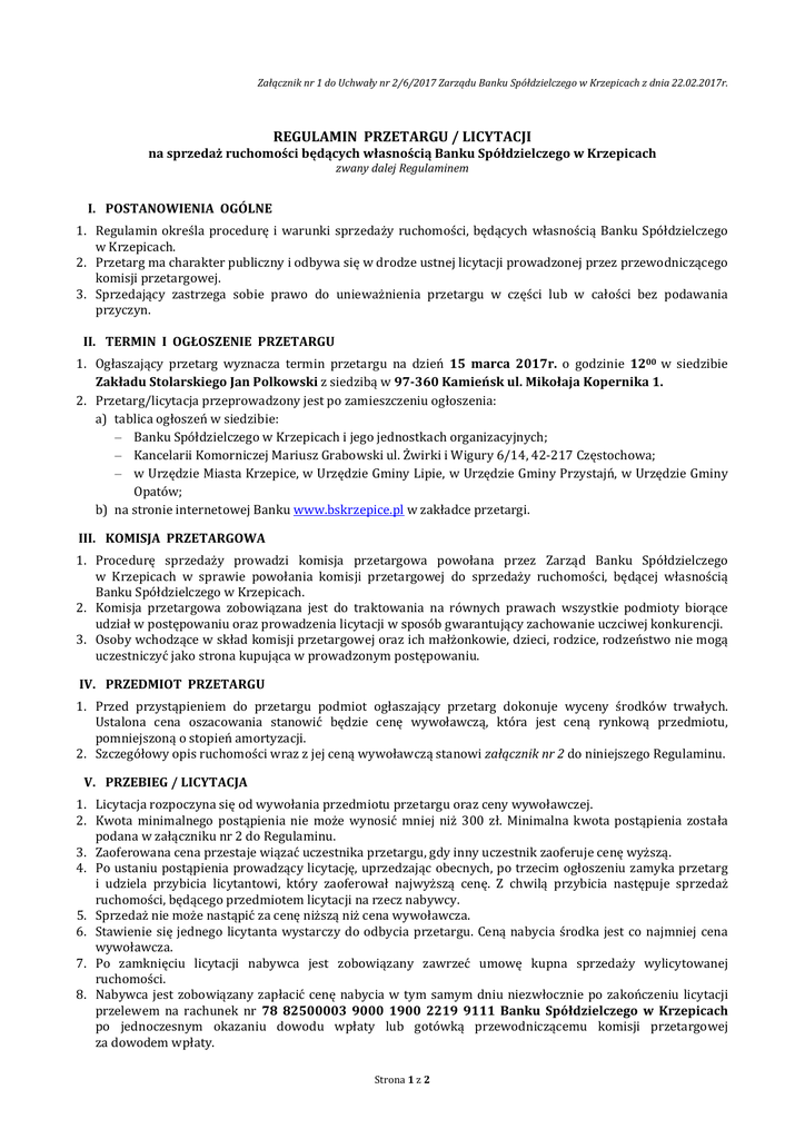 Załącznik nr 1 do Uchwały nr 2/6/2017 Zarządu Banku Spółdzielczego w Krzepicach z dnia 22.02.2017r. REGULAMIN PRZETARGU / LICYTACJI na sprzedaż ruchomości będących własnością Banku Spółdzielczego w Krzepicach zwany dalej Regulaminem I. POSTANOWIENIA OGÓLNE 1. Regulamin określa procedurę i warunki sprzedaży ruchomości, będących własnością Banku Spółdzielczego w Krzepicach. 2. Przetarg ma charakter publiczny i odbywa się w drodze ustnej licytacji prowadzonej przez przewodniczącego komisji przetargowej. 3. Sprzedający zastrzega sobie prawo do unieważnienia przetargu w części lub w całości bez podawania przyczyn. II. TERMIN I OGŁOSZENIE PRZETARGU 1. Ogłaszający przetarg wyznacza termin przetargu na dzień 15 marca 2017r. o godzinie 1200 w siedzibie Zakładu Stolarskiego Jan Polkowski z siedzibą w 97-360 Kamieńsk ul. Mikołaja Kopernika 1. 2. Przetarg/licytacja przeprowadzony jest po zamieszczeniu ogłoszenia: a) tablica ogłoszeń w siedzibie: – Banku Spółdzielczego w Krzepicach i jego jednostkach organizacyjnych; – Kancelarii Komorniczej Mariusz Grabowski ul. Żwirki i Wigury 6/14, 42-217 Częstochowa; – w Urzędzie Miasta Krzepice, w Urzędzie Gminy Lipie, w Urzędzie Gminy Przystajń, w Urzędzie Gminy Opatów; b) na stronie internetowej Banku www.bskrzepice.pl w zakładce przetargi. III. KOMISJA PRZETARGOWA 1. Procedurę sprzedaży prowadzi komisja przetargowa powołana przez Zarząd Banku Spółdzielczego w Krzepicach w sprawie powołania komisji przetargowej do sprzedaży ruchomości, będącej własnością Banku Spółdzielczego w Krzepicach. 2. Komisja przetargowa zobowiązana jest do traktowania na równych prawach wszystkie podmioty biorące udział w postępowaniu oraz prowadzenia licytacji w sposób gwarantujący zachowanie uczciwej konkurencji. 3. Osoby wchodzące w skład komisji przetargowej oraz ich małżonkowie, dzieci, rodzice, rodzeństwo nie mogą uczestniczyć jako strona kupująca w prowadzonym postępowaniu. IV. PRZEDMIOT PRZETARGU 1. Przed przystąpieniem do przetargu podmiot ogłaszający przetarg dokonuje wyceny środków trwałych. Ustalona cena oszacowania stanowić będzie cenę wywoławczą, która jest ceną rynkową przedmiotu, pomniejszoną o stopień amortyzacji. 2. Szczegółowy opis ruchomości wraz z jej ceną wywoławczą stanowi załącznik nr 2 do niniejszego Regulaminu. V. PRZEBIEG / LICYTACJA 1. Licytacja rozpoczyna się od wywołania przedmiotu przetargu oraz ceny wywoławczej. 2. Kwota minimalnego postąpienia nie może wynosić mniej niż 300 zł. Minimalna kwota postąpienia została podana w załączniku nr 2 do Regulaminu. 3. Zaoferowana cena przestaje wiązać uczestnika przetargu, gdy inny uczestnik zaoferuje cenę wyższą. 4. Po ustaniu postąpienia prowadzący licytację, uprzedzając obecnych, po trzecim ogłoszeniu zamyka przetarg i udziela przybicia licytantowi, który zaoferował najwyższą cenę. Z chwilą przybicia następuje sprzedaż ruchomości, będącego przedmiotem licytacji na rzecz nabywcy. 5. Sprzedaż nie może nastąpić za cenę niższą niż cena wywoławcza. 6. Stawienie się jednego licytanta wystarczy do odbycia przetargu. Ceną nabycia środka jest co najmniej cena wywoławcza. 7. Po zamknięciu licytacji nabywca jest zobowiązany zawrzeć umowę kupna sprzedaży wylicytowanej ruchomości. 8. Nabywca jest zobowiązany zapłacić cenę nabycia w tym samym dniu niezwłocznie po zakończeniu licytacji przelewem na rachunek nr 78 82500003 9000 1900 2219 9111 Banku Spółdzielczego w Krzepicach po jednoczesnym okazaniu dowodu wpłaty lub gotówką przewodniczącemu komisji przetargowej za dowodem wpłaty. Strona 1 z 2 VI. WARUNKI ODBIORU ZAKUPIONYCH ŚRODKÓW 1. Zakupioną ruchomość należy odebrać na swój koszt i swoim staraniem w terminie do jednego dnia od zakończenia licytacji, po uprzednim wpłaceniu ustalonej kwoty. 2. Sprzedający nie bierze odpowiedzialności za zniszczenia, dewastację, bądź kradzież nabytej ruchomości. 3. Sprzedający nie bierze odpowiedzialności za zniszczenia powstałe wskutek niewłaściwie wykonywanych prac związanych z załadunkiem i transportem. Demontaż maszyny z miejsca jej postoju należy do nabywcy. VII. PROTOKÓŁ Prowadzący przetarg sporządza z jego przebiegu protokół, który powinien zawierać: 1) oznaczenie miejsca i czasu przebiegu przetargu, 2) imiona i nazwiska osób prowadzących licytację, 3) wysokość ceny wywoławczej, 4) najwyższą cenę zaoferowaną za ruchomość, 5) imię, nazwisko (nazwę firmy) i miejsce zamieszkania nabywcy lub jego siedzibę, 6) wnioski i oświadczenia osób obecnych przy przetargu, 7) wzmiankę o odczytaniu protokołu, 8) podpisy osób prowadzących przetarg. Licytację uważa się za niedoszłą do skutku, jeżeli nie weźmie w niej udziału przynajmniej jeden uczestnik, jak również gdy żaden z uczestników nie zaoferował nawet ceny wywoławczej. Dodatkowe informacje pod numerem tel. 510 060 373 lub (034) 317-52-55 wew. 23, 25 lub 11/ Załączniki do regulaminu: – Załącznik nr 1 – Ogłoszenie – Załącznik nr 2 – Specyfikacja – Załącznik nr 3 – Formularz oświadczenia – Załącznik nr 4 – Projekt umowy kupna – sprzedaży Bank Spółdzielczy w Krzepicach Prezes Zarządu - Anna Chyrzyńska Wiceprezes Zarządu - Elżbieta Orłowska Wiceprezes Zarządu - Roman Kunert Strona 2 z 2