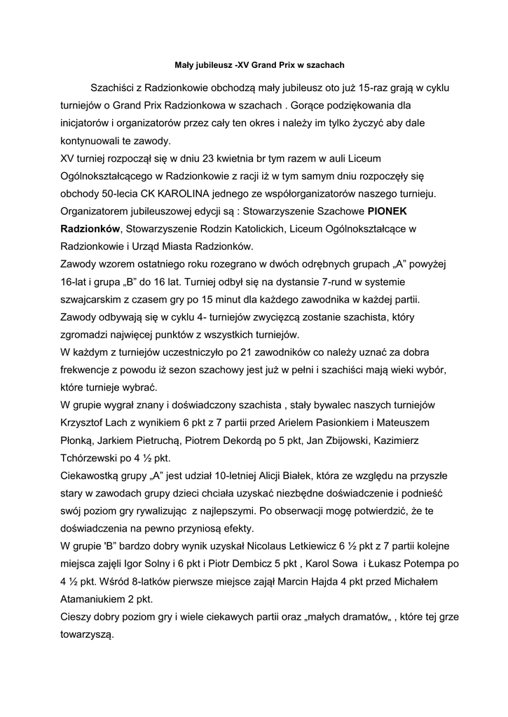 Mały jubileusz -XV Grand Prix w szachach Szachiści z Radzionkowie obchodzą mały jubileusz oto już 15-raz grają w cyklu turniejów o Grand Prix Radzionkowa w szachach . Gorące podziękowania dla inicjatorów i organizatorów przez cały ten okres i należy im tylko życzyć aby dale kontynuowali te zawody. XV turniej rozpoczął się w dniu 23 kwietnia br tym razem w auli Liceum Ogólnokształcącego w Radzionkowie z racji iż w tym samym dniu rozpoczęły się obchody 50-lecia CK KAROLINA jednego ze współorganizatorów naszego turnieju. Organizatorem jubileuszowej edycji są : Stowarzyszenie Szachowe PIONEK Radzionków, Stowarzyszenie Rodzin Katolickich, Liceum Ogólnokształcące w Radzionkowie i Urząd Miasta Radzionków. Zawody wzorem ostatniego roku rozegrano w dwóch odrębnych grupach „A” powyżej 16-lat i grupa „B” do 16 lat. Turniej odbył się na dystansie 7-rund w systemie szwajcarskim z czasem gry po 15 minut dla każdego zawodnika w każdej partii. Zawody odbywają się w cyklu 4- turniejów zwycięzcą zostanie szachista, który zgromadzi najwięcej punktów z wszystkich turniejów. W każdym z turniejów uczestniczyło po 21 zawodników co należy uznać za dobra frekwencje z powodu iż sezon szachowy jest już w pełni i szachiści mają wieki wybór, które turnieje wybrać. W grupie wygrał znany i doświadczony szachista , stały bywalec naszych turniejów Krzysztof Lach z wynikiem 6 pkt z 7 partii przed Arielem Pasionkiem i Mateuszem Płonką, Jarkiem Pietruchą, Piotrem Dekordą po 5 pkt, Jan Zbijowski, Kazimierz Tchórzewski po 4 ½ pkt. Ciekawostką grupy „A” jest udział 10-letniej Alicji Białek, która ze względu na przyszłe stary w zawodach grupy dzieci chciała uzyskać niezbędne doświadczenie i podnieść swój poziom gry rywalizując z najlepszymi. Po obserwacji mogę potwierdzić, że te doświadczenia na pewno przyniosą efekty. W grupie 'B” bardzo dobry wynik uzyskał Nicolaus Letkiewicz 6 ½ pkt z 7 partii kolejne miejsca zajęli Igor Solny i 6 pkt i Piotr Dembicz 5 pkt , Karol Sowa i Łukasz Potempa po 4 ½ pkt. Wśród 8-latków pierwsze miejsce zajął Marcin Hajda 4 pkt przed Michałem Atamaniukiem 2 pkt. Cieszy dobry poziom gry i wiele ciekawych partii oraz „małych dramatów„ , które tej grze towarzyszą. Bardzo dobrze zaprezentowali się seniorzy z Radzionkowa Pan Jan Zbijowski zajął 6 miejsce, Leszek Duzdowski 9 miejsce. W g4rupie juniorów dobry występ zanotował Lukasz Potempa , Marcin Hajda i Borys Izworski gdyby wykorzysta szanse mógł walczyć o podium. Zawody przebiegały w bardzo sportowej atmosferze a szachiści jako rycerze królewskiej gry zaprezentowali iście sportowe zachowanie. Zawody sędziował Rudolf Sobczyk przy syście Wojciecha Hajdy. Szczegółowe wyniki na chessarbiter.com Następne zawody Grand Prix 18.06.2016 znów w auli LO w Radzionkowie Wcześniej bo 19 maja finał Ligi Szkolnej w TCK Tarnowskie Góry początek godz. 10.00. Diagram z partii A.Białek- P.Dekorda , II runda GP Radzionków Białe czyli Alicja ma ruch , obserwując widzę że liczy warianty ale czy widzi ruch 1.Gxh7+!! . Może jeszcze za wcześnie aby 10-latka widziała taką kombinację ale już samo dojście do takiej pozycji rokuje dobre perspektywy dla tej szachistki. Tym razem nie widziała , zagrała He2 ale czarny długo musiał się męczyć zanim wygrały. Proszę zobaczyć co by mogło być dalej ?? 1.Gxh7+ !!, Kxh7 2. Sg5+, Kg6 ( po Kg8? 3.Hh5 !!, We8 4.Hxf7+,Kh8 5. Hh5+, Kg8 6.Hh7+,Kf8 7.Hh8+, Ke7 8.Hxg7X) 3. f4 !!(tez ciekawe i dobre h4) z atakiem ale gdy ma się 10-lat to nie wszystko da się policzyć. Ale potencjał i talent szachowy widać teraz tylko praca aby ten talent szlifować. Drugi diagram z partii B.Izowrski -A.Matys Czy można przegrać taką pozycję? 1.Wc1! (punkt c7 na celu , Ha3 odbiera królowi roszadę ; czarne chmury nad królem ), Hb6 i teraz kończące posunięcie 2.Wxc7 !!!! (ale nie wezmę sobie pionka 2.Gxc7? Hb5 i białe przegrały te partie ?? ) i groźba He7 mat rozstrzyga . Szkoda niewykorzystane szansy . Ale może w nowej partii... Kocówka pionkowa B.Izworski- Z.Wiatrowski . Na zajęciach we wtorki omawiano „opozycje” , jaką zająć pozycje Królem aby zremisować a jak wygrać . Białe maja posunięcie ?? 1. b6 ?? - remis tak było w partii ,Kb7 2.Kb5, Kb8 3.Kc6, Kc8 4.b7+, Kb8 5.Kb6 PAT ale po 1,Kb6!! ,- wygrywa biały Ka8 2. Kc7, Ka7 3.b6+, Ka8 4.b7+Ka7 5.b8-H+ , Ka6 6.Hb6X Zanotował R.Sobczyk