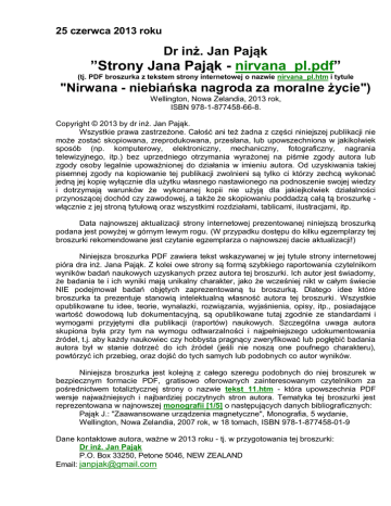25 czerwca 2013 roku Dr inż. Jan Pająk ”Strony Jana Pająk - nirvana_pl.pdf” (tj. PDF broszurka z tekstem strony internetowej o nazwie nirvana_pl.htm i tytule "Nirwana - niebiańska nagroda za moralne życie") Wellington, Nowa Zelandia, 2013 rok, ISBN 978-1-877458-66-8. Copyright © 2013 by dr inż. Jan Pająk. Wszystkie prawa zastrzeżone. Całość ani też żadna z części niniejszej publikacji nie może zostać skopiowana, zreprodukowana, przesłana, lub upowszechniona w jakikolwiek sposób (np. komputerowy, elektroniczny, mechaniczny, fotograficzny, nagrania telewizyjnego, itp.) bez uprzedniego otrzymania wyrażonej na piśmie zgody autora lub zgody osoby legalnie upoważnionej do działania w imieniu autora. Od uzyskiwania takiej pisemnej zgody na kopiowanie tej publikacji zwolnieni są tylko ci którzy zechcą wykonać jedną jej kopię wyłącznie dla użytku własnego nastawionego na podnoszenie swojej wiedzy i dotrzymają warunków że wykonanej kopii nie użyją dla jakiejkolwiek działalności przynoszącej dochód czy zawodowej, a także że skopiowaniu poddadzą całą tą broszurkę włącznie z jej stroną tytułową oraz wszystkimi rozdziałami, tablicami, ilustracjami, itp. Data najnowszej aktualizacji strony internetowej prezentowanej niniejszą broszurką podana jest powyżej w górnym lewym rogu. (W przypadku dostępu do kilku egzemplarzy tej broszurki rekomendowane jest czytanie egzemplarza o najnowszej dacie aktualizacji!) Niniejsza broszurka PDF zawiera tekst wskazywanej w jej tytule strony internetowej pióra dra inż. Jana Pająk. Z kolei owe strony są formą szybkiego raportowania czytelnikom wyników badań naukowych uzyskanych przez autora tej broszurki. Ich autor jest świadomy, że badania te i ich wyniki mają unikalny charakter, jako że wcześniej nikt w całym świecie NIE podejmował badań objętych zaprezentowaną tu broszurką. Dlatego idee które broszurka ta prezentuje stanowią intelektualną własność autora tej broszurki. Wszystkie opublikowane tu idee, teorie, wynalazki, rozwiązania, wyjaśnienia, opisy, itp., posiadające wartość dowodową lub dokumentacyjną, są opublikowane tutaj zgodnie ze standardami i wymogami przyjętymi dla publikacji (raportów) naukowych. Szczególna uwaga autora skupiona była przy tym na wymogu odtwarzalności i najpełniejszego udokumentowania źródeł, t.j. aby każdy naukowiec czy hobbysta pragnący zweryfikować lub pogłębić badania autora był w stanie dotrzeć do ich źródeł (jeśli nie noszą one poufnego charakteru), powtórzyć ich przebieg, oraz dojść do tych samych lub podobnych co autor wyników. Niniejsza broszurka jest kolejną z całego szeregu podobnych do niej broszurek w bezpiecznym formacie PDF, gratisowo oferowanych zainteresowanym czytelnikom za pośrednictwem totaliztycznej strony o nazwie tekst_11.htm - która upowszechnia PDF wersje najważniejsych i najbardziej poczytnych stron autora. Tematyka tej broszurki jest reprezentowana w najnowszej monografii [1/5] o następujących danych bibliograficznych: Pająk J.: "Zaawansowane urządzenia magnetyczne", Monografia, 5 wydanie, Wellington, Nowa Zelandia, 2007 rok, w 18 tomach, ISBN 978-1-877458-01-9 Dane kontaktowe autora, ważne w 2013 roku - tj. w przygotowania tej broszurki: Dr inż. Jan Pająk P.O. Box 33250, Petone 5046, NEW ZEALAND Email: [email protected] Niemal każdy z nas używa słowa "nirwana". Co jednak słowo to oznacza wie naprawdę tylko niewielu z nas. Poczytajmy więc niniejszą stronę aby dowiedzieć się nieco więcej na temat tego niezwykłego zjawiska uczuciowo-moralnego zwanego "nirwana". Wszakże nic NIE wiedząc na temat nirwany, ci co jej zasłużenie doświadczą mogą przeżyć szok podobny do mojego. Mnie bowiem długotrwała nirwana "dopadła" na tropikalnej wyspie Borneo - która to wyspa jest m.in. siedliskiem mnóstwa ciągle ludziom nieznanych choróbsk. Kiedy więc owo niespodziewane uczucie ogromnej i nieustającej szczęśliwości wcale nie chcialo mnie tam opuścić nawet po wielu dniach i tygodniach, początkowo wpadłem z jego powodu w prawdziwą panikę. Zacząłem bowiem posądzać, że zostałem ukąszony przez jakiś borneowski odpowiednik dla afrykańskiej muchy "tse-tse", tyle że zamiast choroby "spiączki" tamta wersja muchy powoduje niepohamowane poczucie szczęśliwości. Zacząłem więc gorączkowo szukać po książkach czym naprawdę jest owo obezwładniające mnie wówczas uczucie nieustannej szczęśliwości. Dopiero w wyniku 2 tych poszukiwań odkryłem, że przeżywam niezwykle rzadkie zjawisko uczuciowomoralne zwane "nirwana" - patrz też punkt #C3 tej strony. Począwszy też dopiero od owego momentu zacząłem naukowo badać i studiować to zjawisko w miarę jak je osobiście przeżywałem. Tamte moje badania nirwany ujawniły informacje z tzw. "pierwszej ręki" które prezentuję na niniejszej stronie. Część #A: Informacje wprowadzające na temat zjawiska nirwany: #A1. Nirwana - co to takiego: Słowniki zwykle opisują nirwanę jako "stan doskonałej szczęśliwości osiągnięty przez duszę" (po angielsku: "state of perfect bliss achieved by the soul") jaki może zostać uzyskany poprzez praktykowanie buddyzmu lub hinduizmu. Gdyby więc uwierzyć w to co piszą słowniki, nirwana jest czymś nieosiągalnym dla zwykłych ludzi, bowiem aby ją doświadczyć trzeba wyznawać jakąś wschodnią religię i najpierw umrzeć. Tymczasem moje badania nad rozwojem filozofii totalizmu, a także moje osobiste doświadczenie nirwany, dowodzą że nirwana jest unikalnym rodzajem uczucia obezwładniającej nas szczęśliwości, które każda osoba może wypracować sobie w tym życiu fizycznym, zaś które pojawia się w chwili kiedy tzw. energia moralna zgromadzona w naszym przeciw-ciele zaczyna się wylewać z przeciw-ciała i rozlewać po naszym ciele fizycznym. Zgodnie też z moimi ustaleniami, zjawiska nirwany może doświadczyć praktycznie każda osoba - jeśli tylk