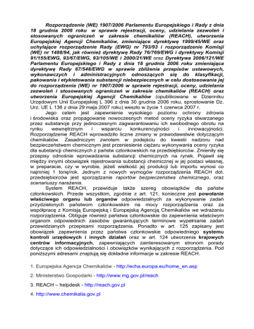 Rozporządzenie (WE) 1907/2006 Parlamentu Europejskiego i Rady z dnia 18 grudnia 2006 roku w sprawie rejestracji, oceny, udzielania zezwoleń i stosowanych ograniczeń w zakresie chemikaliów (REACH), utworzenia Europejskiej Agencji Chemikaliów, zmieniające dyrektywę 1999/45/WE oraz uchylające rozporządzenie Rady (EWG) nr 793/93 i rozporządzenie Komisji (WE) nr 1488/94, jak również dyrektywę Rady 76/769/EWG i dyrektywy Komisji 91/155/EWG, 93/67/EWG, 93/105/WE i 2000/21/WE oraz Dyrektywa 2006/121/WE Parlamentu Europejskiego i Rady z dnia 18 grudnia 2006 roku zmieniająca dyrektywę Rady 67/548/EWG w sprawie zbliżenia przepisów ustawowych, wykonawczych i administracyjnych odnoszących się do klasyfikacji, pakowania i etykietowania substancji niebezpiecznych w celu dostosowania jej do rozporządzenia (WE) nr 1907/2006 w sprawie rejestracji, oceny, udzielania zezwoleń i stosowanych ograniczeń w zakresie chemikaliów (REACH) oraz utworzenia Europejskiej Agencji Chemikaliów (opublikowane w Dzienniku Urzędowym Unii Europejskiej L 396 z dnia 30 grudnia 2006 roku, sprostowanie Dz. Urz. UE L 136 z dnia 29 maja 2007 roku) weszło w życie 1 czerwca 2007 r. Jego celem jest zapewnienie wysokiego poziomu ochrony zdrowia i środowiska oraz propagowanie nowoczesnych metod oceny ryzyka stwarzanego przez substancje przy jednoczesnym zagwarantowaniu ich swobodnego obrotu na rynku wewnętrznym i wsparciu konkurencyjności i innowacyjności. Rozporządzenie REACH wprowadziło liczne zmiany w prawodawstwie dotyczącym chemikaliów. Zasadniczym zwrotem w podejściu do kwestii nadzoru nad bezpieczeństwem chemicznym jest przeniesienie ciężaru wykonywania oceny ryzyka dla substancji chemicznych z państw członkowskich na przedsiębiorców. Zmieniły się przepisy odnośnie wprowadzania substancji chemicznych na rynek. Pojawił się między innymi obowiązek rejestrowania substancji chemicznej w jej postaci własnej, w preparacie, czy w wyrobie, jeżeli wielkość jej produkcji lub importu wynosi co najmniej 1 tonę/rok. Jednym z nowych wymogów rozporządzenia REACH dot. przedsiębiorców jest sporządzanie raportów bezpieczeństwa chemicznego, oraz scenariuszy narażenia. System REACH, przewiduje także szereg obowiązków dla państw członkowskich. Przede wszystkim, zgodnie z art. 121, konieczne jest powołanie właściwego organu lub organów odpowiedzialnych za wykonywanie zadań przydzielonych państwom członkowskim na mocy rozporządzenia oraz za współpracę z Komisją Europejską i Europejską Agencją Chemikaliów we wdrażaniu rozporządzenia. Obliguje również państwa członkowskie do zapewnienia właściwym organom odpowiednich zasobów gwarantujących terminowe wypełnianie zadań przewidzianych przepisami rozporządzenia. Ponadto w art. 125 zapisany jest obowiązek zapewnienia przez państwa członkowskie odpowiedniego systemu kontroli urzędowych i innych działań oraz w art. 124 utworzenia krajowych centrów informacyjnych, zapewniających zainteresowanym stronom porady dotyczące ich odpowiedzialności i obowiązków wynikających z rozporządzenia. Pod poniższymi adresami znajdują się dokładne informacje w zakresie REACH. 1. Europejska Agencja Chemikaliów - http://echa.europa.eu/home_en.asp 2. Ministerstwo Gospodarki - http://www.mg.gov.pl/reach 3. REACH – helpdesk - http://reach.gov.pl 4. http://www.chemikalia.gov.pl