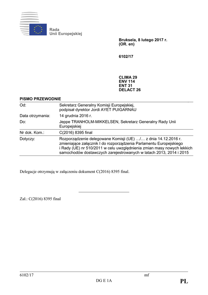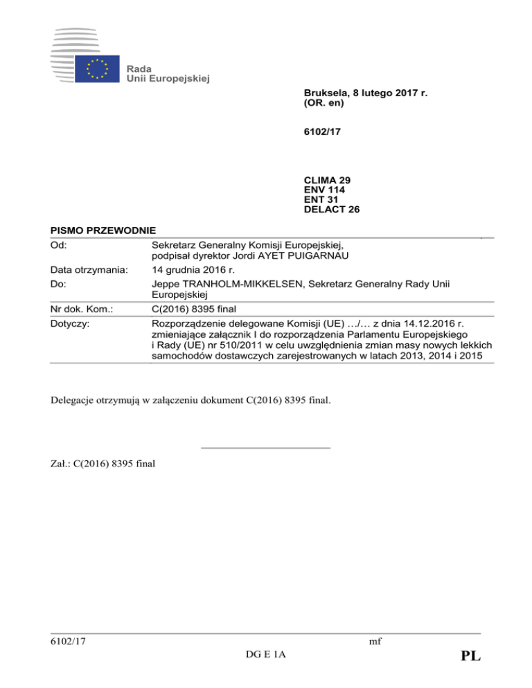 Rada Unii Europejskiej Bruksela, 8 lutego 2017 r. (OR. en) 6102/17 CLIMA 29 ENV 114 ENT 31 DELACT 26 PISMO PRZEWODNIE Od: Data otrzymania: Do: Sekretarz Generalny Komisji Europejskiej, podpisał dyrektor Jordi AYET PUIGARNAU 14 grudnia 2016 r. Jeppe TRANHOLM-MIKKELSEN, Sekretarz Generalny Rady Unii Europejskiej Nr dok. Kom.: C(2016) 8395 final Dotyczy: Rozporządzenie delegowane Komisji (UE) …/… z dnia 14.12.2016 r. zmieniające załącznik I do rozporządzenia Parlamentu Europejskiego i Rady (UE) nr 510/2011 w celu uwzględnienia zmian masy nowych lekkich samochodów dostawczych zarejestrowanych w latach 2013, 2014 i 2015 Delegacje otrzymują w załączeniu dokument C(2016) 8395 final. Zał.: C(2016) 8395 final 6102/17 mf DG E 1A PL KOMISJA EUROPEJSKA Bruksela, dnia 14.12.2016 r. C(2016) 8395 final ROZPORZĄDZENIE DELEGOWANE KOMISJI (UE) …/… z dnia 14.12.2016 r. zmieniające załącznik I do rozporządzenia Parlamentu Europejskiego i Rady (UE) nr 510/2011 w celu uwzględnienia zmian masy nowych lekkich samochodów dostawczych zarejestrowanych w latach 2013, 2014 i 2015 (Tekst mający znaczenie dla EOG) PL PL UZASADNIENIE 1. KONTEKST AKTU DELEGOWANEGO Cele redukcji emisji CO2, które mają osiągnąć producenci nowych lekkich samochodów dostawczych, zostały wyznaczone jako funkcja średniej masy floty pojazdów i emisji CO2 z tych pojazdów. Aby zapewnić, że poziom redukcji przewidziany w rozporządzeniu (UE) nr 510/2011 będzie nadal osiągany, należy uwzględnić zmiany masy nowych lekkich samochodów dostawczych rejestrowanych w Unii. W związku z tym należy co trzy lata, począwszy od dnia 31 października 2016 r., korygować wartość średniej masy odniesienia (oznaczonej jako wartość M0 we wzorach służących do obliczania docelowego poziomu, podanych w załączniku I do wspomnianego rozporządzenia). Nową wartość uzyskano w wyniku monitorowania masy nowych pojazdów w stanie gotowym do jazdy w latach kalendarzowych 2013, 2014 i 2015. Obliczono ją na podstawie jedynie tych wartości masy, które były możliwe do zweryfikowania przez zainteresowanych producentów pojazdów, wyłączając wartości masy, które były w sposób oczywisty błędne (tj. poniżej 500 kg) lub wartości odnoszące się do pojazdów, które nie wchodzą w zakres zastosowania rozporządzenia, takie jak pojazdy o masie odniesienia przekraczającej 2 840 kg. 2. KONSULTACJE PRZEPROWADZONE PRZED PRZYJĘCIEM AKTU Przeprowadzono konsultacje z grupą ekspertów ds. emisji CO2 z pojazdów silnikowych; grupa ta poparła metodę obliczania korekty wartości średniej masy. 3. ASPEKTY PRAWNE AKTU DELEGOWANEGO Wzór do obliczania docelowego poziomu emisji zostaje zmieniony w celu stosowania nowej wartości M0 od dnia 1 stycznia 2018 r. PL 2 PL ROZPORZĄDZENIE DELEGOWANE KOMISJI (UE) …/… z dnia 14.12.2016 r. zmieniające załącznik I do rozporządzenia Parlamentu Europejskiego i Rady (UE) nr 510/2011 w celu uwzględnienia zmian masy nowych lekkich samochodów dostawczych zarejestrowanych w latach 2013, 2014 i 2015 (Tekst mający znaczenie dla EOG) KOMISJA EUROPEJSKA, uwzględniając Traktat o funkcjonowaniu Unii Europejskiej, uwzględniając rozporządzenie Parlamentu Europejskiego i Rady (UE) nr 510/2011 z dnia 11 maja 2011 r. określające normy emisji dla nowych lekkich samochodów dostawczych w ramach zintegrowanego podejścia Unii na rzecz zmniejszenia emisji CO2 z lekkich pojazdów dostawczych 1, w szczególności jego art. 13 ust. 5, a także mając na uwadze, co następuje: PL (1) Wartość średniej masy, wykorzystywana w celu obliczenia indywidualnego poziomu emisji CO2 dla każdego nowego lekkiego samochodu dostawczego, musi być korygowana co trzy lata w celu uwzględnienia wszelkich zmian średniej masy nowych pojazdów rejestrowanych w Unii. (2) W wyniku monitorowania masy nowych lekkich samochodów dostawczych w stanie gotowym do jazdy zarejestrowanych w latach kalendarzowych 2013, 2014 i 2015 stwierdzono jasno, że średnia masa zwiększyła się oraz że wartość M0, o której mowa w pkt 1 lit. b) załącznika I do rozporządzenia (UE) nr 510/2011, powinna zostać skorygowana. (3) Nową wartość należy ustalić z uwzględnieniem wyłącznie tych wartości, które udało się zweryfikować zainteresowanym producentom, i z wyłączeniem wartości, które były w sposób oczywisty błędne, tj. wartości niższych niż 500 kg, jak również wartości odnoszących się do pojazdów, które nie wchodzą w zakres stosowania rozporządzenia (UE) nr 510/2011, w tym pojazdów o masie odniesienia przekraczającej 2 840 kg. Ponadto nowa wartość opiera się na średniej ważonej, uwzględniającej liczbę nowych rejestracji w poszczególnych latach referencyjnych. (4) W związku z powyższym wartość M0, która ma być stosowana od 2018 r., należy zwiększyć o 60,4 kg – z 1706,0 kg do 1766,4 kg, 1 Dz.U. L 145 z 31.5.2011, s. 1. 3 PL PRZYJMUJE NINIEJSZE ROZPORZĄDZENIE: Artykuł 1 Punkt 1 lit. b) załącznika I do rozporządzenia (UE) nr 510/2011 otrzymuje brzmienie: „od 2018 r.: indywidualny poziom emisji CO2 = 175 + a × (M – M0) gdzie: M = masa pojazdu w kilogramach (kg) M0 = 1 766,4 a = 0,093;”. Artykuł 2 Niniejsze rozporządzenie wchodzi w życie dwudziestego dnia po jego opublikowaniu w Dzienniku Urzędowym Unii Europejskiej. Niniejsze rozporządzenie wiąże w całości i jest bezpośrednio stosowane we wszystkich państwach członkowskich. Sporządzono w Brukseli, dnia 14.12.2016 r. W imieniu Komisji Przewodniczący Jean-Claude JUNCKER PL 4 PL