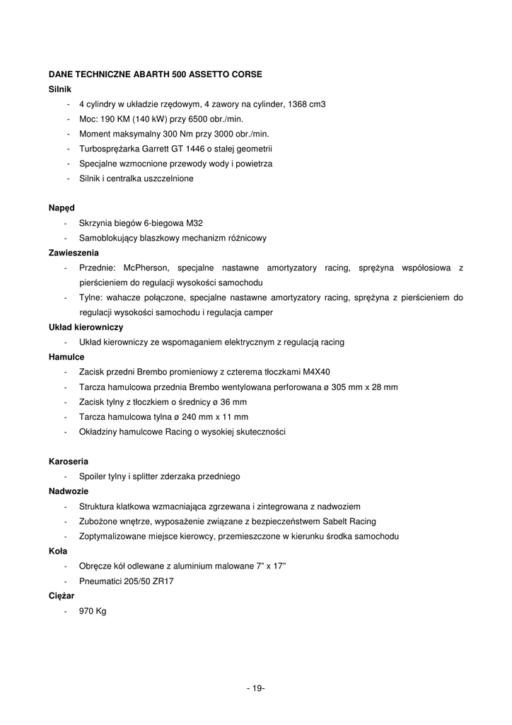 DANE TECHNICZNE ABARTH 500 ASSETTO CORSE Silnik - 4 cylindry w układzie rzędowym, 4 zawory na cylinder, 1368 cm3 - Moc: 190 KM (140 kW) przy 6500 obr./min. - Moment maksymalny 300 Nm przy 3000 obr./min. - Turbosprężarka Garrett GT 1446 o stałej geometrii - Specjalne wzmocnione przewody wody i powietrza - Silnik i centralka uszczelnione Napęd - Skrzynia biegów 6-biegowa M32 - Samoblokujący blaszkowy mechanizm różnicowy Zawieszenia - Przednie: McPherson, specjalne nastawne amortyzatory racing, sprężyna współosiowa z pierścieniem do regulacji wysokości samochodu - Tylne: wahacze połączone, specjalne nastawne amortyzatory racing, sprężyna z pierścieniem do regulacji wysokości samochodu i regulacja camper Układ kierowniczy - Układ kierowniczy ze wspomaganiem elektrycznym z regulacją racing Hamulce - Zacisk przedni Brembo promieniowy z czterema tłoczkami M4X40 - Tarcza hamulcowa przednia Brembo wentylowana perforowana ø 305 mm x 28 mm - Zacisk tylny z tłoczkiem o średnicy ø 36 mm - Tarcza hamulcowa tylna ø 240 mm x 11 mm - Okładziny hamulcowe Racing o wysokiej skuteczności Karoseria - Spoiler tylny i splitter zderzaka przedniego Nadwozie - Struktura klatkowa wzmacniająca zgrzewana i zintegrowana z nadwoziem - Zubożone wnętrze, wyposażenie związane z bezpieczeństwem Sabelt Racing - Zoptymalizowane miejsce kierowcy, przemieszczone w kierunku środka samochodu Koła - Obręcze kół odlewane z aluminium malowane 7” x 17” - Pneumatici 205/50 ZR17 Ciężar - 970 Kg - 19-