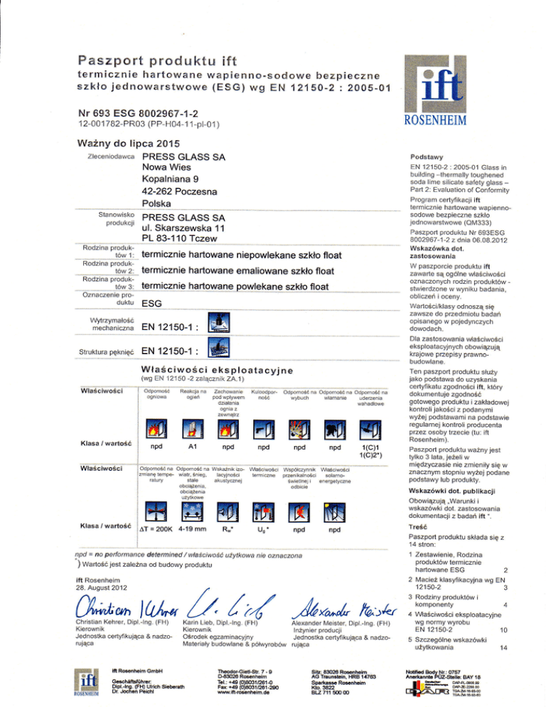 szkto jednowarstwowe (ESG) wg EN 12150-Z: 200S-01