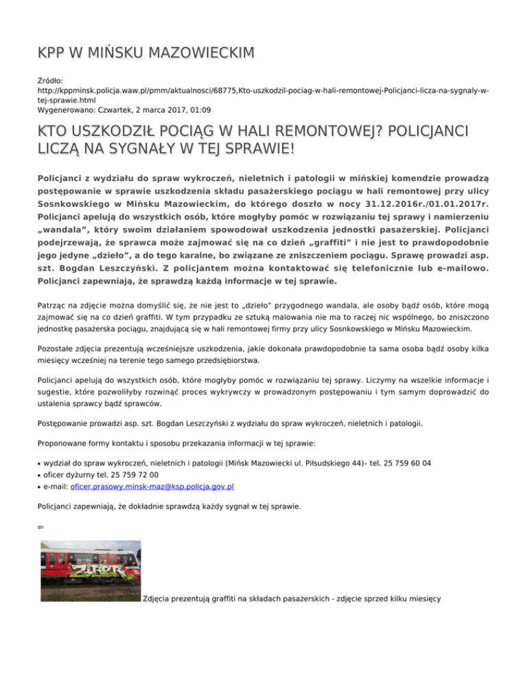 KPP W MIŃSKU MAZOWIECKIM Źródło: http://kppminsk.policja.waw.pl/pmm/aktualnosci/68775,Kto-uszkodzil-pociag-w-hali-remontowej-Policjanci-licza-na-sygnaly-wtej-sprawie.html Wygenerowano: Czwartek, 2 marca 2017, 01:09 KTO USZKODZIŁ POCIĄG W HALI REMONTOWEJ? POLICJANCI LICZĄ NA SYGNAŁY W TEJ SPRAWIE! Policjanci z wydziału do spraw wykroczeń, nieletnich i patologii w mińskiej komendzie prowadzą postępowanie w sprawie uszkodzenia składu pasażerskiego pociągu w hali remontowej przy ulicy Sosnkowskiego w Mińsku Mazowieckim, do którego doszło w nocy 31.12.2016r./01.01.2017r. Policjanci apelują do wszystkich osób, które mogłyby pomóc w rozwiązaniu tej sprawy i namierzeniu „wandala”, który swoim działaniem spowodował uszkodzenia jednostki pasażerskiej. Policjanci podejrzewają, że sprawca może zajmować się na co dzień „graffiti” i nie jest to prawdopodobnie jego jedyne „dzieło”, a do tego karalne, bo związane ze zniszczeniem pociągu. Sprawę prowadzi asp. szt. Bogdan Leszczyński. Z policjantem można kontaktować się telefonicznie lub e-mailowo. Policjanci zapewniają, że sprawdzą każdą informacje w tej sprawie. Patrząc na zdjęcie można domyślić się, że nie jest to „dzieło” przygodnego wandala, ale osoby bądź osób, które mogą zajmować się na co dzień graffiti. W tym przypadku ze sztuką malowania nie ma to raczej nic wspólnego, bo zniszczono jednostkę pasażerska pociągu, znajdującą się w hali remontowej firmy przy ulicy Sosnkowskiego w Mińsku Mazowieckim. Pozostałe zdjęcia prezentują wcześniejsze uszkodzenia, jakie dokonała prawdopodobnie ta sama osoba bądź osoby kilka miesięcy wcześniej na terenie tego samego przedsiębiorstwa. Policjanci apelują do wszystkich osób, które mogłyby pomóc w rozwiązaniu tej sprawy. Liczymy na wszelkie informacje i sugestie, które pozwoliłyby rozwinąć proces wykrywczy w prowadzonym postępowaniu i tym samym doprowadzić do ustalenia sprawcy bądź sprawców. Postępowanie prowadzi asp. szt. Bogdan Leszczyński z wydziału do spraw wykroczeń, nieletnich i patologii. Proponowane formy kontaktu i sposobu przekazania informacji w tej sprawie: ● wydział do spraw wykroczeń, nieletnich i patologii (Mińsk Mazowiecki ul. Piłsudskiego 44)– tel. 25 759 60 04 ● oficer dyżurny tel. 25 759 72 00 ● e-mail: [email protected] Policjanci zapewniają, że dokładnie sprawdzą każdy sygnał w tej sprawie. dn Zdjęcia prezentują graffiti na składach pasażerskich - zdjęcie sprzed kilku miesięcy Zdjęcia prezentują graffiti na składach pasażerskich - zdjęcie sprzed kilku miesięcy Zdjęcia prezentują graffiti na składach pasażerskich -ostatnie uszkodzenie Ocena: 5/5 (3) Tweetnij