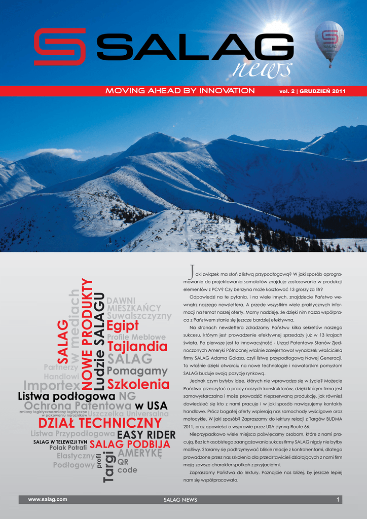 vol. 2 | Grudzień 2011 MOVING AHEAD BY INNOVATION SALAG w mediach NOWE PRODUKTY Ludzie SALAGU J elementów z PCV? Czy benzyna może kosztować 13 groszy za litr? Odpowiedzi na te pytania, i na wiele innych, znajdziecie Państwo wewnątrz naszego newslettera. A przede wszystkim wiele praktycznych infor- Suwalszczyzny Egipt Importex aki związek ma słoń z listwą przypodłogową? W jaki sposób oprogra- mowanie do projektowania samolotów znajduje zastosowanie w produkcji DAWNI Partnerzy Handlowi vol. 2 | GRUDZIEŃ 2011 macji na temat naszej oferty. Mamy nadzieję, że dzięki nim nasza współpraca z Państwem stanie się jeszcze bardziej efektywna. Na stronach newslettera zdradzamy Państwu kilka sekretów naszego Tajlandia SALAG Pomagamy Szkolenia sukcesu, którym jest prowadzenie efektywnej sprzedaży już w 13 krajach świata. Po pierwsze jest to innowacyjność - Urząd Patentowy Stanów Zjednoczonych Ameryki Północnej właśnie zarejestrował wynalazek właściciela firmy SALAG Adama Galasa, czyli listwę przypodłogową Nowej Generacji. To właśnie dzięki otwarciu na nowe technologie i nowatorskim pomysłom SALAG buduje swoją pozycję rynkową. Jednak czym byłyby idee, których nie wprowadza się w życie? Możecie Państwo przeczytać o pracy naszych konstruktorów, dzięki którym firma jest samowystarczalna i może prowadzić nieprzerwaną produkcję, jak również dowiedzieć się kto z nami pracuje i w jaki sposób nawiązujemy kontakty Uszczelka Universalna EASY RIDER Polak Potrafi SALAG PODBIJA Targi SALAG W TELEWIZJI TVN QR code www.salag.com handlowe. Prócz bogatej oferty wspierają nas samochody wyścigowe oraz motocykle. W jaki sposób? Zapraszamy do lektury relacji z Targów BUDMA 2011, oraz opowieści o wyprawie przez USA słynną Route 66. Nieprzypadkowo wiele miejsca poświęcamy osobom, które z nami pracują. Bez ich osobistego zaangażowania sukces firmy SALAG nigdy nie byłby możliwy. Staramy się podtrzymywać bliskie relacje z kontrahentami, dlatego prowadzone przez nas szkolenia dla przedstawicieli działających z nami firm mają zawsze charakter spotkań z przyjaciółmi. Zapraszamy Państwa do lektury. Poznajcie nas bliżej, by jeszcze lepiej nam się współpracowało. SALAG NEWS 1 vol. 2 | Grudzień 2011 Listwa podłogowa Nowej Generacji otrzymuje ochronę patentową w USA vol. 2 | Grudzień 2011 NOWE PRODUKTY ELASTYCZNY PROFIL PODŁOGOWY Elastyczny profil podłogowy FLEX BOARD. Doskonała listwa do wykończenia powierzchni łukowych o małym promieniu gięcia. Pokrywa różnice poziomów. Może być stosowany na ułożoną już podłogę. Jedyna listwa do wykończenia powierzchni wokół kolumn. LISTWA PRZYPODŁOGOWA Listwa SG48 to produkt z gamy ekonomicznych profili przypodłogowych Salag. Jest to produkt oczekiwany przez wielu klientów, łączący w sobie prostotę montażu, wysoką jakość oraz umiarkowaną cenę. Wysokość listwy – 48 mm – oraz miękkie końcówki gwarantują dopasowanie profili do ściany oraz podłogi. Wyjmowany środek listwy ułatwia szybkie zamontowanie dodatkowych kabli bez demontażu listwy. http://url.salag.com/sSG40 Nowe rozmiary rozet o średnicy 29 mm Niezastąpiony element maskujący otwory powstałe w wyniku wycięć w powierzchni podłogowej, głównie pod grzejnikami. PROFILE DLA MEBLARSTWA Z ogromną przyjemnością informujemy, iż w tym roku Adam Galas – właściciel firmy Salag – otrzymał patent o numerze US 7,870,697 B2 na swój wynalazek listwy przypodłogowej Nowej Generacji. Opatentowany – również w Europie – system został już dużo wcześniej doceniony przez Jury na Międzynarodowych Targach Wynalazczości Eureka w Brukseli oraz Concours Lepine w Paryżu, odpowiednio srebrnym i brązowym medalem. Sam twórca Adam Galas został odznaczony Krzyżem Oficerskim Orderu Wynalazczości Królestwa Belgii. Istota wynalazku polega na tym, że listwa składa się z dwóch części – dolnej na stałe przymocowanej do ściany oraz górnej którą w dowolnej chwili można zdemontować i to bez użycia jakichkolwiek narzędzi. Pozwala to na wykonywanie remontów (malowanie ścian, tapetowanie) bez demontażu listew, oraz pozwala na prowadzenie przewodów zasilania, antenowych, internetowych i innych pod powierzchnią listwy. Urząd Patentowy Stanów Zjednoczonych Ameryki Północnej jako pierwszy nadał temu wynalazkowi statut ochron- 2 SALAG NEWS ny; w innych krajach wniosek patentowy został zgłoszony i nadal oczekuje na pełną ochronę. Wniosek Patentowy został zgłoszony zarówno w Europie i w USA w listopadzie 2004 roku. Firma SALAG jest wiodącym producentem innowacyjnych produktów wykończeniowych wnętrz domów. Firma została założona w roku 1997 i prowadzona do dnia dzisiejszego przez Adama Galasa. Firma Salag jako jedna z nielicznych może poszczycić się posiadaniem własnego działu konstrukcyjnego i narzędziowego, co pozwala na wdrażanie najnowszych technologii. Wyjątkowe właściwości wyrobów, szeroka gama kolorystyczna oraz doświadczenie w produkcji umożliwiło firmie SALAG odnieść sukcesy również na rynkach międzynarodowych . W ubiegłym roku lista krajów do których sprzedaje firma SALAG wzrosła do 13-tu. www.salag.com http://url.salag.com/sFB http://url.salag.com/s24 Cały czas rozwijamy ofertę dla meblarstwa. Obecnie posiadamy 5 rodzajów listew przyblatowych w różnych rozmiarach - 14mm (wklęsła i wypukła), 23 i 37mm. Bardzo bogata kolorystyka - ponad 60 dekorów - jest dopasowana do dekorów blatów kuchennych wiodących producentów (Kronopol, Pfleiderer, Juan, Biurostyl). Nowością jest listwa przyblatowa w rolce (uszczelka uniwersalna). Mało widoczne, delikatne maskowanie szczeliny listwą uniwersalną nadaje meblom bardzo estetyczny wygląd. Do zabezpieczenia cokołu przed wilgocią i brudem zaprojektowana została listwa cokołowa 18mm. Profil ten jest bezbarwny i posiada elastyczną uszczelkę. Dzięki temu, że montuje się go od spodu