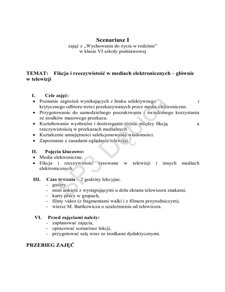 Scenariusz I zajęć z „Wychowania do życia w rodzinie” w klasie VI szkoły podstawowej TEMAT: Fikcja i rzeczywistość w mediach elektronicznych – głównie w telewizji D ęb ic a I. Cele zajęć: • Poznanie zagrożeń wynikających z braku selektywnego i krytycznego odbioru treści przekazywanych przez media elektroniczne. • Przygotowanie do samodzielnego poszukiwania i świadomego korzystania ze środków masowego przekazu. • Kształtowanie wyobraźni i dostrzeganie różnic między fikcją a rzeczywistością w przekazach medialnych • Kształcenie umiejętności selekcjonowania wiadomości. • Zapoznanie z zasadami oglądania telewizji. kreowane SP 3 II. Pojęcia kluczowe: • Media elektroniczne. • Fikcja i rzeczywistość elektronicznych. w telewizji i innych mediach III. Czas trwania – 2 godziny lekcyjne. - gazety - mini ankieta z występującymi u dołu ekranu telewizora znakami, - karty pracy w grupach, - filmy video (z fragmentami walki i z filmem przyrodniczym), - wiersz M. Bartkowicza o uzależnieniu od telewizora. VI. Przed zajęciami należy: - zaplanować zajęcia, - opracować scenariusz lekcji, - przygotować salę wraz ze środkami dydaktycznymi. PRZEBIEG ZAJĘĆ 1. Wstęp: -nawiązanie do tematu lekcji. Nauczyciel zadaje pytania będące wprowadzeniem do tematu: - W jaki sposób najchętniej spędzasz czas wolny? - Jakie programy telewizyjne i gry komputerowe najbardziej preferujesz? IV. SP 3 D ęb ic a - W jakich sposób dokonujesz wyboru programów telewizyjnych i komputerowych? - Ile czasu tygodniowo przeznaczasz na oglądanie telewizji i korzystanie z komputera? 2. Część główna: • Podanie tematu i celów lekcji. Nauczyciel nawiązuje do poznanych na innych lekcjach pojęć środków masowego przekazu - przypominając tym samym pojęcie media elektroniczne. Uczniowie na arkuszu papieru wykonują mapę mentalną różnych rodzajów mediów elektronicznych. Następnie nauczyciel zwraca uwagę na telewizję, która jest jednym z największych istniejących mediów. • ( Mini wykład nauczyciela )Wokół telewizora koncentruje się życie wielu rodzin. Często włącza się go z chwilą wejścia do domu, a wyłącza dopiero wtedy, gdy wszyscy idą spać. Tzw. statystyczny Polak spędza przed telewizorem średnio 4 godziny 34 min. W ten sposób czas na oglądanie serwowanej nam produkcji telewizyjnej zabiera przeciętnemu Polakowi 12 lat życia. Wielogodzinne oglądanie telewizji czy korzystanie z innych mediów stanowi nałóg taki sam, jak inne nałogi. • Przeczytanie wierszyka mówiącego o uzależnieniu się od telewizora. Metody: - pogadanka, - dyskusja, - praca z gazetą telewizyjną, - mapa mentalna. - mini wykład V. Forma pracy: - indywidualna, - praca w grupach. VII. Do prowadzenia zajęć potrzebne będą: Spytała mama swojego synka: -Mietku, kochanie, -która godzina? Mietek oglądał film na dobranoc, więc odpowiedział: -Po siódmej mamo. ic D ęb Mietek wciąż patrząc w telewizorek, rzekł: Dziś twój serial, więc dziś jest wtorek. a A jaki dzień dziś, czwartek czy piątek, bo zapomniałam robiąc porządek? -A który dzisiaj? Podpowiedz mamie. -Piąty. Widziałem to w „Panoramie”. SP 3 -A jaki miesiąc? -Już mamy kwiecień. Czytałem o tym w Telegazecie. Czy nie czas, Mietku, Iść do kąpieli? - Nie. O tym jeszcze nie powiedzieli. (M. Bartkowicz ) • Podział uczniów na grupy. Rozdanie kart pracy. Grupa I i II Temat: Telewizja to najlepszy wynalazek XX wieku. Uczniowie formułują i wpisują odpowiednie argumenty, np.: /jest łatwa w odbiorze, duża różnorodność programów, pozwala wypełnić wolny czas, jest źródłem wiedzy, informacji, rozrywki, pozwala zdobyć sławę, pozwala utożsamiać się z bohaterami, kreuje świat mody, pozwala zdobyć sławę itp./. Grupa III i IV. SP 3 D ęb ic a Temat: Telewizja jest najgorszym wynalazkiem XX wieku. Uczniowie formułują i wpisują odpowiednie argumenty, np.: / kreuje nieistniejącą rzeczywistość, wpływa na życie osób które sobie tego nie życzą, zabiera czas, instruuje, jak popełnić zbrodnie, wpływa na wzrost agresywności itp./ • Prezentacja wyników pracy. • Nauczyciel proponuje obejrzenie krótkich fragmentów filmów: przyrodniczego i ze scenami walki. Po obejrzeniu uczniowie wyrażają swoje opinie, dzielą się uwagami. Nauczyciel zwraca uwagę, że nie tylko telewizja wpływa niekorzystnie na rozwój młodych osób ale również gry komputerowe, Internet, /krótka dyskusja na ten temat/. • Nauczyciel poleca wyjaśnić uczniom znaczenie określeń wynikających z tematu lekcji. /burza mózgów/ Określenie i zapisanie pojęć na tablicy na podstawie propozycji uczniów: FIKCJA: stan rzeczy zmyślony, nie istniejący w rzeczywistości, wytwór wyobraźni, wymysł, złudzenie. RZECZYWISTOŚĆ: to co jest prawdziwe, widziane. • Prowadzący sprawdza, czy uczniowie dokładnie wiedzą, co oznaczają znaki graficzne ukazujące się u dołu ekranu telewizora, podczas emisji niektórych programów. W tym celu rozdaje mini ankiety i prosi o ich wypełnienie. /Zał. nr 1/. • Praca w grupach. Rozdanie czasopism. Polecenie wyboru z tygodniowego programu telewizyjnego tych programów, które zdaniem uczniów zasługują na emisje, zestawienie własnej propozycji programu TV na jeden dzień tygodnia, uzasadnienie wyboru. Poszczególne grupy odczytują własne programy telewizyjne. D ęb ic a • Podsumowanie zajęć: Telewizor, komputer rozwija zainteresowania, kształci szybkość reakcji ale wielogodzinne przebywanie przed tymi urządzeniami technicznymi, ogranicza umysł, mowę i osłabia lub nadmiernie pobudza reakcje ruchowe. Każde dziecko powinno przyjąć też do wiadomości, że poznanie dobra i zła, radości i smutku, fałszu i prawdy, rzeczywistości i fantazji nie nauczy odróżniać ich komputer, telewizja ale dobry rodzic i mądry nauczyciel. I aby te wartości poznać, trzeba o nich mówić , a nie poddawać się mechanicznym n