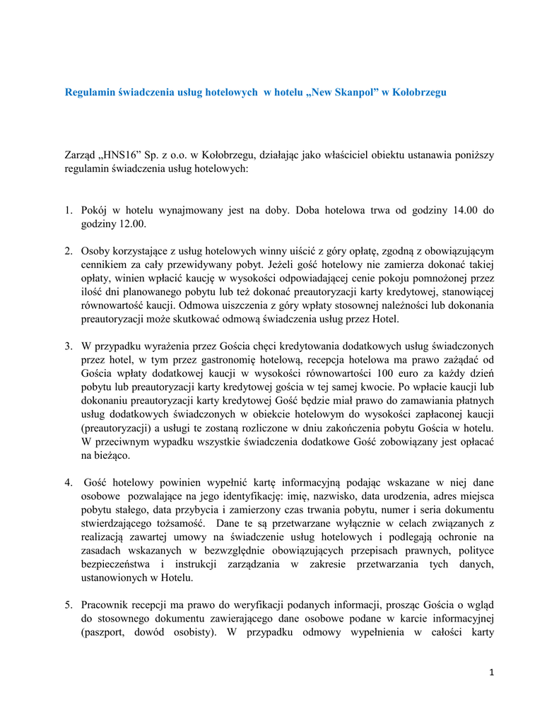 Regulamin świadczenia usług hotelowych w hotelu „New Skanpol” w Kołobrzegu Zarząd „HNS16” Sp. z o.o. w Kołobrzegu, działając jako właściciel obiektu ustanawia poniższy regulamin świadczenia usług hotelowych: 1. Pokój w hotelu wynajmowany jest na doby. Doba hotelowa trwa od godziny 14.00 do godziny 12.00. 2. Osoby korzystające z usług hotelowych winny uiścić z góry opłatę, zgodną z obowiązującym cennikiem za cały przewidywany pobyt. Jeżeli gość hotelowy nie zamierza dokonać takiej opłaty, winien wpłacić kaucję w wysokości odpowiadającej cenie pokoju pomnożonej przez ilość dni planowanego pobytu lub też dokonać preautoryzacji karty kredytowej, stanowiącej równowartość kaucji. Odmowa uiszczenia z góry wpłaty stosownej należności lub dokonania preautoryzacji może skutkować odmową świadczenia usług przez Hotel. 3. W przypadku wyrażenia przez Gościa chęci kredytowania dodatkowych usług świadczonych przez hotel, w tym przez gastronomię hotelową, recepcja hotelowa ma prawo zażądać od Gościa wpłaty dodatkowej kaucji w wysokości równowartości 100 euro za każdy dzień pobytu lub preautoryzacji karty kredytowej gościa w tej samej kwocie. Po wpłacie kaucji lub dokonaniu preautoryzacji karty kredytowej Gość będzie miał prawo do zamawiania płatnych usług dodatkowych świadczonych w obiekcie hotelowym do wysokości zapłaconej kaucji (preautoryzacji) a usługi te zostaną rozliczone w dniu zakończenia pobytu Gościa w hotelu. W przeciwnym wypadku wszystkie świadczenia dodatkowe Gość zobowiązany jest opłacać na bieżąco. 4. Gość hotelowy powinien wypełnić kartę informacyjną podając wskazane w niej dane osobowe pozwalające na jego identyfikację: imię, nazwisko, data urodzenia, adres miejsca pobytu stałego, data przybycia i zamierzony czas trwania pobytu, numer i seria dokumentu stwierdzającego tożsamość. Dane te są przetwarzane wyłącznie w celach związanych z realizacją zawartej umowy na świadczenie usług hotelowych i podlegają ochronie na zasadach wskazanych w bezwzględnie obowiązujących przepisach prawnych, polityce bezpieczeństwa i instrukcji zarządzania w zakresie przetwarzania tych danych, ustanowionych w Hotelu. 5. Pracownik recepcji ma prawo do weryfikacji podanych informacji, prosząc Gościa o wgląd do stosownego dokumentu zawierającego dane osobowe podane w karcie informacyjnej (paszport, dowód osobisty). W przypadku odmowy wypełnienia w całości karty 1 informacyjnej lub odmowy przedstawienia dokumentu odmówić świadczenia usług. tożsamości, Hotel ma prawo 6. Wcześniejsze rezerwacje pokoi hotelowych mogą być dokonywane przy pomocy portali internetowych mających w ofercie usługi Hotelu, bezpośrednio w recepcji hotelowej, pisemnie , w tym także przy użyciu poczty elektronicznej kierowanej na adresy dostępne na stronie internetowej Hotelu: www.newskanpol.pl lub telefonicznie, a także za pomocą systemu rezerwacji dostępnego na wyżej wskazanej stronie internetowej. 7. W przypadku rezerwacji dokonywanych za pośrednictwem zewnętrznych portali internetowych, mają zastosowanie zamieszczone na ich stronach zasady i regulaminy dokonywania tych rezerwacji. 8. W przypadku rezerwacji dokonywanych bez pośrednictwa podmiotów trzecich, rezerwację uważa się za dokonaną skutecznie z chwilą potwierdzenia jej przez Hotel i uiszczenia przedpłaty stanowiącej 30% ceny za cały okres rezerwowanej usługi hotelowej. Przedpłata winna zostać dokonana najpóźniej w ciągu 7 dni od dnia otrzymania potwierdzenia rezerwacji, chyba, że wyraźnie zastrzeżono krótszy termin. Po bezskutecznym upływie tego terminu lub wpłacie kwoty niższej niż wskazana, Hotel ma prawo uznać rezerwację za niedokonaną i zwrócić wpłacone środki. 9. Uiszczona w trybie wskazanym powyżej przedpłata, z zastrzeżeniem przepisów poniższych, ulega zaliczeniu na poczet ceny usługi hotelowej. 10. Gość hotelowy ma prawo do bezkosztowej anulacji dokonanej rezerwacji i zwrotu całej przedpłaty, jeżeli oświadczenie w tej mierze złoży na piśmie najpóźniej na 7 dni przed rozpoczęciem pierwszej doby zarezerwowanego pobytu. 11. Jeżeli oświadczenie o anulowaniu rezerwacji, o jakim mowa w punkcie poprzedzającym, zostanie złożone później niż w terminie w nim wskazanym, ale najpóźniej na 48 godzin przed rozpoczęciem pierwszej doby zarezerwowanego pobytu, rezerwacja ulega anulowaniu, a Gość otrzymuje zwrot 50% wpłaconej przedpłaty. 12. W przypadku, gdy Gość anuluje rezerwację później niż na 48 godzin przed rozpoczęciem pierwszej doby zarezerwowanego pobytu, rezerwacja wygasa, a Gościowi nie przysługuje roszczenie o zwrot przedpłaty. 13. Jeżeli Gość, nie składając oświadczenia o anulowaniu rezerwacji, nie zarejestruje się w Hotelu do godziny 18:00 w pierwszej dobie rezerwowanego pobytu, a wartość uiszczonej przedpłaty jest niższa od ceny jednej doby pobytu w pokoju zarezerwowanym przez Gościa, rezerwacja wygasa, a Gościowi nie przysługuje roszczenie o zwrot przedpłaty. 2 14. Jeżeli Gość, nie składając oświadczenia o anulowaniu rezerwacji, nie zarejestruje się w Hotelu w ciągu pierwszej doby pobytu a wartość uiszczonej przedpłaty jest wyższa od ceny jednej doby pobytu w pokoju zarezerwowanym przez Gościa, rezerwacja wygasa z upływem pierwszej doby, a Gościowi nie przysługuje roszczenie o zwrot przedpłaty. 15. Opiekunem i doradcą naszych Gości jest Recepcja hotelowa. 16. Osoby odwiedzające naszych Gości proszone są o opuszczenie pokoi hotelowych przed godziną 22.00. 17. Cisza nocna trwa od godziny 22.00 do godziny 7.00. 18. Gość hotelowy nie może przekazywać pokoju osobom trzecim, nawet jeśli nie upłynęła doba, za którą uiścił należną opłatę za pobyt. 19. Jeśli Gość nie określił czasu pobytu najmując pokój przyjmuje się, że pokój został wynajęty na jedną dobę. Życzenie przedłużenia pobytu poza ok