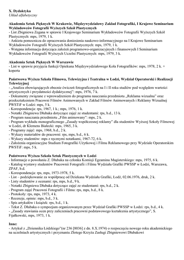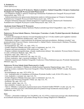 X. Dydaktyka Układ alfabetyczny Akademia Sztuk Pięknych W Krakowie, Międzywydziałowy Zakład Fotografiki, I Krajowe Seminarium Wykładowców Fotografii Wyższych Szkół Plastycznych - List Zbigniewa Zegana w sprawie I Krajowego Seminarium Wykładowców Fotografii Wyższych Szkół Plastycznych: mps, 1979, 1 k. - Ankieta pomocnicza do opracowania doniesienia naukowo-informacyjnego na I Krajowe Seminarium Wykładowców Fotografii Wyższych Szkół Plastycznych: mps, 1979, 1 k. - Wstępna informacja dotycząca założeń programowo-organizacyjnych i finansowych I Seminarium Wykładowców Fotografii Wyższych Uczelni Plastycznych: mps, 1979, 3 k. Akademia Sztuk Pięknych W Warszawie - List w sprawie przyjęcia funkcji Opiekuna Międzywydziałowego Koła Fotografików: mps, 1978, 2 k. + koperta Państwowa Wyższa Szkoła Filmowa, Telewizyjna i Teatralna w Łodzi, Wydział Operatorski i Realizacji Telewizyjnej - „Analiza obowiązujących obecnie ćwiczeń fotograficznych na I i II roku studiów pod względem wartości artystycznych i przydatności dydaktycznej”: mps, 1976, 7 k. - Dokumenty związane z wprowadzeniem do programu nauczania przedmiotu „Reklama wizualna” oraz przekształceniem Pracowni Filmów Animowanych w Zakład Filmów Animowanych i Reklamy Wizualnej PWSTiF w Łodzi: mps, 5 k. - Korespondencja: rps, 1967, 1 k.; mps, 1976, 1 k. - Notatki Zbigniewa Dłubaka dotyczące zajęć ze studentami: rps, b.d., 13 k. - Program nauczania przedmiotu „Film animowany”: mps, 2 k. - Program wykładu monograficznego „Zasady współczesnej reklamy” dla studentów Wyższej Szkoły Filmowej w Łodzi, dr Klemens Białecki: mps, 1965, 3 k. - Programy zajęć: mps, 1968, b.d., 2 k. - Wykazy materiałów do pracowni: rps, mps, b.d., 6 k. - Wykazy studentów: mps z ręcznymi notatkami, 1967-72, 6 k. - Założenia organizacyjne Studium Fotografiki Użytkowej i Filmu Reklamowego przy Wydziale Operatorskim PWSTiF: mps, 5 k. Państwowa Wyższa Szkoła Sztuk Plastycznych w Łodzi - Informacje o powołaniu Z. Dłubaka na członka Komisji Egzaminu Magisterskiego: mps, 1975, 6 k. - Katalog wystawy studentów Pracownii Fotografii i Filmu Wydziału Grafiki PWSSP w Łodzi, Warszawa, ZPAF, b.d. - Korespondencja: rps, mps, 1973-1978, 5 k. - List – podziękowanie za współpracę od Dziekana Wydziału Grafiki, Łodź, 02.06.1976, druk, 2 k. - Listy studentów z ocenami: rps, mps, b.d., 9 k. - Notatki Zbigniewa Dłubaka dotyczące zajęć ze studentami: rps, b.d., 2 k. - Program zajęć Pracowni Fotografii i Filmu: rps, mps, b.d., 8 k. - Protokoły: rps, mps, 1973, 4 k. - Recenzje, opinie: mps, b.d., 3 k. - Spis artykułów i książek: rps, b.d., 1 k. - Tekst Z. Dłubaka o sympozjum organizowanym przez Wydział Grafiki PWSSP w Łodzi: rps, b.d., 4 k. - „Zasady stawiania ocen przy zaliczeniach pracowni podstawowego kształcenia artystycznego”, S. Fijałkowski, mps, 1973, 1 k. Inne: - Artykuł z „Dziennika Łódzkiego”(nr 236 [8036] z dn. 8.X.1974) o rozpoczęciu nowego roku akademickiego na uczelniach artystycznych i przyznaniu Złotego Krzyża Zasługi Zbigniewowi Dłubakowi