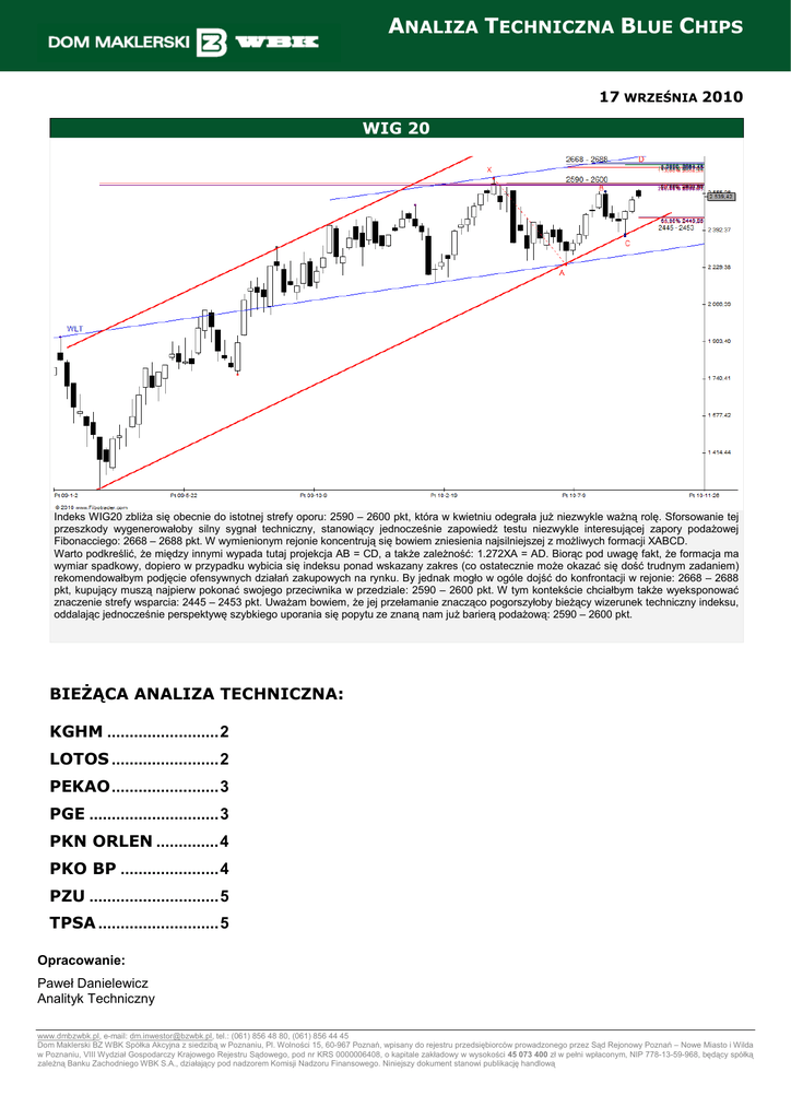 o ANALIZA TECHNICZNA BLUE CHIPS 17 WRZEŚNIA 2010 WIG 20 Indeks WIG20 zbliŜa się obecnie do istotnej strefy oporu: 2590 – 2600 pkt, która w kwietniu odegrała juŜ niezwykle waŜną rolę. Sforsowanie tej przeszkody wygenerowałoby silny sygnał techniczny, stanowiący jednocześnie zapowiedź testu niezwykle interesującej zapory podaŜowej Fibonacciego: 2668 – 2688 pkt. W wymienionym rejonie koncentrują się bowiem zniesienia najsilniejszej z moŜliwych formacji XABCD. Warto podkreślić, Ŝe między innymi wypada tutaj projekcja AB = CD, a takŜe zaleŜność: 1.272XA = AD. Biorąc pod uwagę fakt, Ŝe formacja ma wymiar spadkowy, dopiero w przypadku wybicia się indeksu ponad wskazany zakres (co ostatecznie moŜe okazać się dość trudnym zadaniem) rekomendowałbym podjęcie ofensywnych działań zakupowych na rynku. By jednak mogło w ogóle dojść do konfrontacji w rejonie: 2668 – 2688 pkt, kupujący muszą najpierw pokonać swojego przeciwnika w przedziale: 2590 – 2600 pkt. W tym kontekście chciałbym takŜe wyeksponować znaczenie strefy wsparcia: 2445 – 2453 pkt. UwaŜam bowiem, Ŝe jej przełamanie znacząco pogorszyłoby bieŜący wizerunek techniczny indeksu, oddalając jednocześnie perspektywę szybkiego uporania się popytu ze znaną nam juŜ barierą podaŜową: 2590 – 2600 pkt. BIEśĄCA ANALIZA TECHNICZNA: KGHM .........................2 LOTOS ........................2 PEKAO........................3 PGE .............................3 PKN ORLEN ..............4 PKO BP ......................4 PZU .............................5 TPSA ...........................5 Opracowanie: Paweł Danielewicz Analityk Techniczny www.dmbzwbk.pl, e-mail: [email protected], tel.: (061) 856 48 80, (061) 856 44 45 Dom Maklerski BZ WBK Spółka Akcyjna z siedzibą w Poznaniu, Pl. Wolności 15, 60-967 Poznań, wpisany do rejestru przedsiębiorców prowadzonego przez Sąd Rejonowy Poznań – Nowe Miasto i Wilda w Poznaniu, VIII Wydział Gospodarczy Krajowego Rejestru Sądowego, pod nr KRS 0000006408, o kapitale zakładowy w wysokości 45 073 400 zł w pełni wpłaconym, NIP 778-13-59-968, będący spółką zaleŜną Banku Zachodniego WBK S.A., działający pod nadzorem Komisji Nadzoru Finansowego. Niniejszy dokument stanowi publikację handlową KGHM Kluczowym oporem na spółce pozostaje obecnie zakres: 120.40 – 121.8 zł, skonstruowany na bazie zniesienie zewnętrznego 113%. Koncentrują się tutaj takŜe projekcje prospadkowej formacji XABCD. Spółka zachowuje się jednak w ostatnim okresie bardzo przyzwoicie, zatem w przypadku zanegowania wskazanej przeszkody, niejako automatycznie wygenerowane zostałoby kolejnej wskazanie uzasadniające kupno akcji. Niewykluczone, Ŝe w takim przypadku realnym wariantem pozostałby test zniesienie wewnętrznego 88.6% (poziom 131 zł). Niemniej jednak z uwagą obserwowałbym obecnie zachowanie się waloru we wspomnianym juŜ rejonie: 120.4 – 121.8 zł. NajbliŜszym wsparcie pozostaje w tej chwili strefa: 110.3 – 111.2 zł. LOTOS FUNDUSZE INWESTYCYJNE RAPORT MIESIĘCZNY Istotna strefa oporu plasuje się obecnie w rejonie: 34.60 – 34.95 zł. Jak widać na załączonym wykresie wskazany obszar cenowy zadziałał juŜ bardzo precyzyjnie, dlatego naleŜy oczekiwać, Ŝe aktywność podaŜy nadal będzie tutaj silnie odczuwalna (koncentrują się tutaj projekcje prospadkowej formacji XABCD). Wydaje się, Ŝe układ techniczny wykresu uległby poprawie, gdyby bykom udało się przedrzeć ponad zakres: 32.50 – 32.70 zł. Z racji wspomnianej juŜ formacji XABCD moŜe to być jednak bardzo trudne zadanie. Silnym sygnałem zapowiadającym kontynuację ruchu spadkowego byłoby w moim odczuciu przełamanie: 28.40 – 28.80 zł. Z kolei za całkowicie przeciwne wskazanie naleŜałoby potraktować zanegowanie znanej nam juŜ zapory cenowej: 34.60 – 34.95 zł. www.dmbzwbk.pl, e-mail: [email protected], tel.: (061) 856 48 80, (061) 856 44 45 Dom Maklerski BZ WBK Spółka Akcyjna z siedzibą w Poznaniu, Pl. Wolności 15, 60-967 Poznań, wpisany do rejestru przedsiębiorców prowadzonego przez Sąd Rejonowy Poznań – Nowe Miasto i Wilda w Poznaniu, VIII Wydział Gospodarczy Krajowego Rejestru Sądowego, pod nr KRS 0000006408, o kapitale zakładowy w wysokości 45 073 400 zł w pełni wpłaconym, NIP 778-13-59-968, będący spółką zaleŜną Banku Zachodniego WBK S.A., działający pod nadzorem Komisji Nadzoru Finansowego. Niniejszy dokument stanowi publikację handlową 2 PEKAO Od kilku miesięcy spółka konsoliduje się w stosunkowo wąskim kanale cenowym. Silnym i wiarygodnym wsparciem (od dłuŜszego juŜ czasu) pozostaje tutaj zakres: 149.0 – 151.0 zł. Jego przełamanie wygenerowałoby stosunkowo istotny sygnał słabości, zapowiadający oczywiście dalszy ruch w kierunku południowym. Potwierdzeniem zmiany trendu na PEO byłoby jednak dopiero zanegowanie strefy: 138.0 – 139.0, zbudowanej na bazie zniesienia 38.2% hossy trwającej od lutego do listopada 2009 roku. Za pierwszą barierę podaŜową uznałbym natomiast poziom cenowy wytyczony na bazie zniesienia 78.6% (174 zł). Z załączonego wykresu wynika, Ŝe nieco niŜej przebiega takŜe median line, a takŜe górna linia kanału trendowego. Dopiero pokonanie tak skonstruowanego oporu poprawiłoby obraz techniczny analizowanego waloru. PGE FUNDUSZE INWESTYCYJNE RAPORT MIESIĘCZNY Kurs spółki PGE wybił się ponad istotny zakres Fibonacciego: 23.30 – 23.50 zł, co traktuję pozytywnie. Wskazana strefa powinna obecnie pełnić rolę zapory popytowej (zasada zmiany biegunów). Niespełnienie tego warunku wygenerowałoby bowiem sygnał słabości, co tak naprawdę anulowałoby wcześniejsze wybicie i mogłoby w konsekwencji doprowadzić do wykreowania się silnego ruchu kontrującego. WaŜną barierą podaŜową pozostaje takŜe zakres: 24.42 – 24.62 pkt. Pokonanie tutaj podaŜy naleŜałoby potraktować jako kolejny sygnał kupna. Z racji zanegowania strefy: 23.30 – 23.50