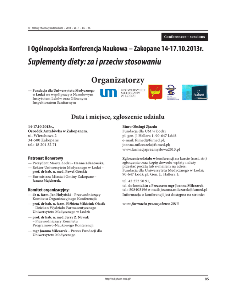© Military Pharmacy and Medicine • 2013 • VI – 1 • 85 – 86 Conferences – sessions I Ogólnopolska Konferencja Naukowa – Zakopane 14-17.10.2013r. Suplementy diety: za i przeciw stosowaniu Organizatorzy ——Fundacja dla Uniwersytetu Medycznego w Łodzi we współpracy z Narodowym Instytutem Leków oraz Głównym Inspektoratem Sanitarnym Data i miejsce, zgłoszenie udziału 14-17.10 2013r., Ośrodek Antałówka w Zakopanem. ul. Wierchowa 2 34-500 Zakopane tel.: 18 201 32 71 Biuro Obsługi Zjazdu Fundacja dla UM w Łodzi pl. gen. J. Hallera 1, 90-647 Łódź e-mail: [email protected]; [email protected]; www.farmacjaprzemyslowa2013.pl Patronat Honorowy Zgłoszenie udziału w konferencji na karcie (nast. str.) zgłoszenia oraz kopię dowodu wpłaty należy przesłać pocztą lub e-mailem na adres: Fundacja dla Uniwersytetu Medycznego w Łodzi; 90-647 Łódź; pl. Gen. J., Hallera 1; ——Prezydent Miasta Łodzi – Hanna Zdanowska; ——Rektor Uniwersytetu Medycznego w Łodzi – prof. dr hab. n. med. Paweł Górski; ——Burmistrza Miasta i Gminy Zakopane – Janusz Majcherek. Komitet organizacyjny: ——dr n. farm. Jan Hołyński – Przewodniczący Komitetu Organizacyjnego Konferencji; ——prof. dr hab. n. farm. Elżbieta Mikiciuk-Olasik – Dziekan Wydziału Farmaceutycznego Uniwersytetu Medycznego w Łodzi; tel. 42 272 50 91, tel. do kontaktu z Prezesem mgr Joanna Milczarek tel.: 508403196 e-mail: [email protected] Informacja o konferencji jest dostępna na stronie: www.farmacia przemysłowa 2013 ——prof. dr hab. n. med. Jerzy Z. Nowak – Przewodniczący Komitetu Programowo-Naukowego Konferencji ——mgr Joanna Milczarek – Prezes Fundacji dla Uniwersytetu Medycznego http://mil-pharm-med.pl/ 85 Short Communication © Military Pharmacy and Medicine • 2013 • VI – 1 • 86 – 86 Ramowy program konferencji obejmuje tematy: ——Jakość i autentyczność suplementów diety i odżywek, jak zapewnić bezpieczeństwo ich stosowania; ——Suplementy diety i odżywki z punktu widzenia badań prowadzonych w Instytucie Żywności i Żywienia; ——Skuteczność i bezpieczeństwo stosowania produktów roślinnych w suplementach diety; ——Problemy nadużywania suplementów diety i wyrobów medycznych ——Suplementy diety ich zakres i możliwość działania przy uwzględnianiu składników: karotenoidy, flawonoidy, tokoferole i tokotrienole na funkcjonowanie skóry; 86 ——Suplementy diety i ich stosowanie w neurologii kosmetycznej; ——Nowa rola parafarmecutyków w suplementach diety w dermatologii i w żywieniu ——Ocena składników w suplementach diety dla określonych grup konsumentów: kobiet w ciąży w okresie menopauzy, dla sportowców i seniorów itp.; ——Aktualne akty prawne regulujące rynek suplementów diety i odżywek; ——Oświadczenie żywieniowe i zdrowotne. http://mil-pharm-med.pl/