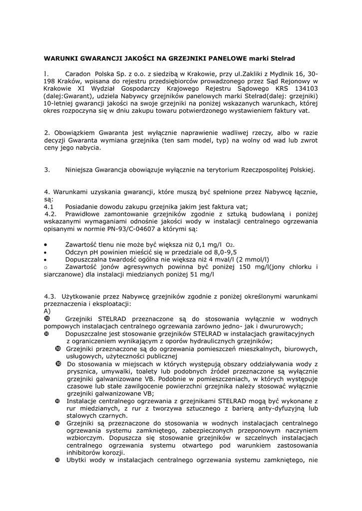 WARUNKI GWARANCJI JAKOŚCI NA GRZEJNIKI PANELOWE marki Stelrad Caradon Polska Sp. z o.o. z siedzibą w Krakowie, przy ul.Zakliki z Mydlnik 16, 30198 Kraków, wpisana do rejestru przedsiębiorców prowadzonego przez Sąd Rejonowy w Krakowie XI Wydział Gospodarczy Krajowego Rejestru Sądowego KRS 134103 (dalej:Gwarant), udziela Nabywcy grzejników panelowych marki Stelrad(dalej: grzejniki) 10-letniej gwarancji jakości na swoje grzejniki na poniżej wskazanych warunkach, której okres rozpoczyna się w dniu zakupu towaru potwierdzonego wystawieniem faktury vat. 1. 2. Obowiązkiem Gwaranta jest wyłącznie naprawienie wadliwej rzeczy, albo w razie decyzji Gwaranta wymiana grzejnika (ten sam model, typ) na wolny od wad lub zwrot ceny jego nabycia. 3. Niniejsza Gwarancja obowiązuje wyłącznie na terytorium Rzeczpospolitej Polskiej. 4. Warunkami uzyskania gwarancji, które muszą być spełnione przez Nabywcę łącznie, są: 4.1 Posiadanie dowodu zakupu grzejnika jakim jest faktura vat; 4.2. Prawidłowe zamontowanie grzejników zgodnie z sztuką budowlaną i poniżej wskazanymi wymaganiami odnośnie jakości wody w instalacji centralnego ogrzewania opisanymi w normie PN-93/C-04607 a którymi są: Zawartość tlenu nie może być większa niż 0,1 mg/l O2. Odczyn pH powinien mieścić się w przedziale od 8,0-9,5 Dopuszczalna twardość ogólna nie większa niż 4 mval/l (2 mmol/l) o Zawartość jonów agresywnych powinna być poniżej 150 mg/l(jony chlorku i siarczanowe) dla instalacji miedzianych poniżej 51 mg/l 4.3. Użytkowanie przez Nabywcę grzejników zgodnie z poniżej określonymi warunkami przeznaczenia i eksploatacji: A) Grzejniki STELRAD przeznaczone są do stosowania wyłącznie w wodnych pompowych instalacjach centralnego ogrzewania zarówno jedno- jak i dwururowych; Dopuszczalne jest stosowanie grzejników STELRAD w instalacjach grawitacyjnych z ograniczeniem wynikającym z oporów hydraulicznych grzejników; Grzejniki przeznaczone są do ogrzewania pomieszczeń mieszkalnych, biurowych, usługowych, użyteczności publicznej Do stosowania w miejscach w których występują obszary oddziaływania wody z prysznica, umywalki, toalety lub podobnych źródeł przeznaczone są wyłącznie grzejniki galwanizowane VB. Podobnie w pomieszczeniach, w których występuje czasowe lub stałe zawilgocenie powierzchni grzejnika należy stosować wyłącznie grzejniki galwanizowane VB; Instalacje centralnego ogrzewania z grzejnikami STELRAD mogą być wykonane z rur miedzianych, z rur z tworzywa sztucznego z barierą anty-dyfuzyjną lub stalowych czarnych. Grzejniki są przeznaczone do stosowania w wodnych instalacjach centralnego ogrzewania systemu zamkniętego, zabezpieczonych przeponowym naczyniem wzbiorczym. Dopuszcza się stosowanie grzejników w szczelnych instalacjach centralnego ogrzewania systemu otwartego pod warunkiem zastosowania inhibitorów korozji. Ubytki wody w instalacjach centralnego ogrzewania systemu zamkniętego, nie powinny przekraczać rocznie 5% pojemności instalacji, a 10% w instalacjach systemu otwartego. Powinny być one jak najmniejsze. Niedopuszczalne jest opróżnianie instalacji napełnionej wodą z wyjątkiem sytuacji awaryjnych. W razie potrzeby opróżnienia instalacji, wodę należy usunąć tylko z tej części, z której jest to konieczne. Po zakończeniu prac np. podczas remontu czy modernizacji, opróżnioną część instalacji należy natychmiast napełnić wodą. B) Źródłem ciepła dla instalacji centralnego ogrzewania wyposażonych w grzejniki STELRAD mogą być kotłownie lub wymiennikowe węzły cieplne. Maksymalne ciśnienie robocze instalacji:1 MPa (10 bar), a dopuszczalna temperatura czynnika grzewczego: 110°C C) Przed uruchomieniem systemu grzewczego (rury, grzejniki, itd.) należy wyczyścić go przy użyciu uniwersalnego środka czyszczącego. Następnie należy napełnić system świeżą wodą. W systemach otwartych należy dodatkowo dodać (katalizator hamujący) inhibitor korozji w celu skutecznego pozbycia się takich problemów jak pojawienie się korozji wewnętrznej, osadzanie się kamienia, itd. D) Z przyłączy grzejnika należy usunąć wszystkie plastikowe zatyczki uszczelniające i zastąpić je metalowymi korkami. E) Podczas napełniania systemu wodą i po zakończeniu napełniania należy sprawdzić sprawne działanie oraz szczelność wszystkich uszczelek (zawór, odpowietrzacz, korek, itd.) grzejnika oraz jego przyłączy do innych elementów systemu grzewczego. F) Należy użyć wszystkich dostarczonych zawieszeń grzejników i akcesoriów (uszczelek, elementów nośnych, dopuszcza się zamianę śrub montażowych na właściwe dla danego typu ściany). G) Ściana, na której zostanie zamontowany grzejnik, powinna być stabilna. H) Po napełnieniu system powinien być całkowicie odpowietrzony poprzez odpowietrzanie po kolei każdego grzejnika osobno. W systemie nie powinno być powietrza. Należy uniemożliwić dostanie się powietrza. I) Nie wolno czyścić grzejników przy użyciu środków do szorowania oraz innych czyszczących zawierających rozpuszczalniki, kwasy lub inne substancje mogące powodować uszkodzenia lakieru lub korozję. J) Lakierowane powierzchnie grzejnika nie mogą mieć bezpośredniej styczności z nawilżaczami ceramicznymi lub innymi wilgotnymi lub przepuszczającymi wilgoć obiektami lub elementami. K) Nabywca w chwili odbioru towaru obowiązany jest dokonać jego oceny co do zgodności grzejnika z umową. Jeżeli w momencie dostawy okaże się, że zakupione grzejniki są uszkodzone, Nabywca obowiązany jest powiadomić producenta niezwłocznie nie później niż w terminie 2 dni roboczych. L) Grzejniki powinny być wykorzystywane jedynie jako jednostki grzewcze. M) Wyglądu grzejnika nie wolno zmieniać bez uzyskania uprzedniej pisemnej zgody producenta. 4.4. Nie dopełnienie przez Nabywcę warunków opisanych w pkt 4.1- 4.3. powoduje utratę uprawnień wynikających gwarancji jakości. 5.