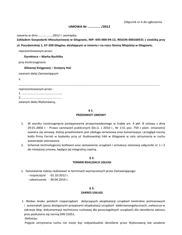 Załącznik nr 4 do ogłoszenia UMOWA Nr ............. /2012 zawarta w dniu .................2012 r. pomiędzy Zakładem Gospodarki Mieszkaniowej w Głogowie, NIP: 693-000-94-12, REGON 000160531 z siedzibą przy ul. Poczdamskiej 1, 67-200 Głogów, działającym w imieniu i na rzecz Gminy Miejskiej w Głogowie, reprezentowanym przez: Dyrektora – Marka Rychlika przy kontrasygnacie Głównej Księgowej – Grażyny Hać zwanym dalej Zamawiającym a ……………………………………………………………………………….................................................................................... reprezentowanym przez : 1. ……………………………………………. 2. …………………………………........... zwanym dalej Wykonawcą, § 1. PRZEDMIOT UMOWY 1. 2. W wyniku rozstrzygnięcia postępowania przeprowadzonego w trybie art. 4 pkt. 8 ustawy z dnia 29.01.2004 r. - Prawo zamówień publicznych (Dz.U. z 2010 r., Nr 113, poz. 759 z późn. zmianami) zawiera się umowę, której przedmiotem jest obsługa serwisowa oraz konserwacja i przegląd roczny kotła firmy Ferroli w budynku przy ul. Rudnowskiej 54A w Głogowie w celu utrzymania w ruchu automatyki sterowania. Schemat technologiczny kotłowni oraz zestawienie urządzeń i armatury stanowią załączniki nr 1 i 2 do niniejszej umowy, będące jej integralną częścią. § 2. TERMIN REALIZACJI USŁUGI 1. Zamówienie należy realizować w terminach wyznaczonych przez Zamawiającego: - rozpoczęcie - 01.10.2012 r. - zakończenie - 30.04.2014 r. § 3. ZAKRES USŁUGI 1. Wobec braku polskich rozporządzeń dotyczących eksploatacji urządzeń kontrolno pomiarowych i automatyki (poza dostępnymi przepisami eksploatacji urządzeń elektroenergetycznych, zwłaszcza w zakresie bhp; dokumentacji techniczno ruchowej dla poszczególnych urządzeń) dla określenia zakresu prac posłużono się normą DIN 31051. Definicja: Pojęcie utrzymania ruchu nie może być indywidualnie określone przez Wykonawcę lub ustalone między Wykonawcą a Zamawiającym z uwagi na to, że sprawę reguluje norma DIN 31051. Utrzymanie ruchu obejmuje wszelkie działania służące zachowaniu i odtworzeniu żądanego stanu technicznego i funkcjonowania urządzeń wchodzących w skład systemu (instalacji) polegające na: - wizyty (ogólna kontrola poprawności pracy instalacji i systemów, przyjmowanie uwag Zamawiającego) - inspekcje ( ustalenie i ocena stanu rzeczywistego instalacji c.o.) - konserwacja ( wszelkie działania zapobiegawcze mające na celu przywrócenie prawidłowego stanu instalacji) - nagłe naprawy serwisowe (przywrócenie żądanego stanu systemów). 2. Serwis obejmuje następujące czynności: a) w obrębie układów automatyki: - testowanie przekaźników i kontrola logiki działania - symulacja działania zabezpieczeń ogranicznika poziomu wody ogranicznika temperatury, zaworów bezpieczeństwa, naczynia przeponowego i ciśnienia w instalacji - sprawdzanie wartości temperatur rzeczywistych i żądanych - korekcja funkcji w programie regulatora( na życzenie) - kontrola wewnętrznych połączeń elektrycznych: zasilanie, wejście (także pod względem mechanicznym - sprawdzenie palnika oraz jego akcesoriów b) w obrębie instalacji: - utrzymanie kotła w kotłowni w czystości - dbanie o dobrą wentylację kotłowni i magazynu oleju - naprawa nieszczelności zaworów, armatury, przewodów - czyszczenie kotła 3. Naprawa i konserwacja, od których zależy prawidłowe funkcjonowanie wykonywane będą przy użyciu narzędzi i drobnych materiałów Wykonawcy, 4. Obsługa i konserwacja automatyki będzie wykonywana w dni powszednie, oraz w dni wolne od pracy (soboty, niedziele i święta ) w systemie dyżuru całodobowego. 5. Czas reakcji serwisu od zgłoszenia telefonicznego do chwili przybycia serwisanta na ul. Rudnowską 54 a wynosi 1 godzinę. 6. W przypadku niedotrzymania terminu określonego w ust. 5 Wykonawca upoważnia Zamawiającego do naliczenia kar za każdą godzinę opóźnienia w wysokości 100,00 zł brutto. 7. W razie konieczności wymiany urządzeń, dysz, palnika, usterka będzie usunięta w ciągu 24 godzin. 8. Zamawiający upoważnia Wykonawcę od usunięcia wszelkich awarii instalacji elektrycznych wodociągowych w trybie pilnym. 9. Podczas realizacji przedmiotu umowy Wykonawca ponosi odpowiedzialność za swoje bezpieczeństwo, a także względem osób, którym powierza wykonanie usługi oraz osób trzecich. Wykonawca ponosi także odpowiedzialność za wszelkie szkody, które zostały wyrządzone przez niego albo osoby, którym powierzył wykonanie czynności. § 4. OBOWIĄZKI ZAMAWIAJĄCEGO Do obowiązków Zamawiającego należy: 1. Zapewnienie bieżącego nadzoru. 2. Dokonywanie potwierdzenia wykonania usługi. §5. WARTOŚĆ I ROZLICZENIE USŁUGI 1. Zamawiający zobowiązuje się zapłacić dla Wykonawcy wynagrodzenie umowne w wysokości: - wynagrodzenie umowne za jeden miesiąc: ................. zł netto + VAT ....... % .......... zł = ................... zł brutto słownie: ................................................................................................................ - wynagrodzenie umowne za okres od dnia 01.10.2012 r do dnia 30.04.2012 r. wynosi: ................. zł netto + VAT ....... % .......... zł = ................... zł brutto słownie: ................................................................................................................ 2. Ceny w pkt 1 obejmują wszystkie koszty: płace, narzuty na płace, świadczenia socjalne z uwzględnieniem wszystkich opłat i podatków (także podatku od towarów i usług), kredytów, odsetek od kredytów, dojazdy oraz ewentualne upusty i rabaty, oprócz materiałów. 3. W przypadku zmiany stawki VAT ceny ulegną zmianie o wysokość zmiany stawki VAT. 4. Strony zgodnie postanawiają, że Wykonawca bez pisemnej zgody Zamawiającego nie może cedować (przelewać) należności wynikających z niniej