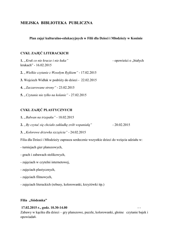 MIEJSKA BIBLIOTEKA PUBLICZNA Plan zajęć kulturalno-edukacyjnych w Filii dla Dzieci i Młodzieży w Koninie CYKL ZAJĘĆ LITERACKICH 1. „Kruk co nie kracze i nie kuka” krukach” - 16.02.2015 - opowieści o „białych 2. „Wielkie czytanie z Wesołym Ryjkiem” - 17.02.2015 3. Wojciech Widłak w podróży do dzieci - 22.02.2015 4. „Zaczarowane strony” - 23.02.2015 5. „Czytanie nie tylko na kolanie” - 27.02.2015 CYKL ZAJĘĆ PLASTYCZNYCH 1. „Bałwan na trzepaku” - 18.02.2015 2. „By czytać się chciało zakładkę zrób wspaniałą” - 20.02.2015 3. „Kolorowe drzewka szczęścia” - 24.02.2015 Filia dla Dzieci i Młodzieży zaprasza serdecznie wszystkie dzieci do wzięcia udziału w: - turniejach gier planszowych, - grach i zabawach stolikowych, - zajęciach w czytelni internetowej, - zajęciach plastycznych, - zajęciach filmowych, - zajęciach literackich (rebusy, kolorowanki, krzyżówki itp.) Filia „Siódemka” 17.02.2015 r., godz. 10.30-14.00 -Zabawy w kąciku dla dzieci – gry planszowe, puzzle, kolorowanki, głośne czytanie bajek i opowiadań. 19.02.2015 r., godz. 10.30-12.00 - Wykonywanie zwierząt z płyt CD, kolorowego papieru, materiałów dekoracyjnych, koralików, cekinów, tasiemek. 24.02.2015 r., godz. 10.30-14.00 - Gry i zabawy stolikowe, prace rysunkowe – pejzaże zimowe, oglądanie bajeczek i filmów na DVD. 26.02.2015 r., godz.10.30-12.00 – Tworzenie z masy solnej figurek, zwierzątek itp., malowanie i ozdabianie prac dowolną techniką. Ferie z detektywem Pozytywka w Filii Chorzeń Termin zajęć: 16-23.02.2105 r. w godz. 11:00 – 13:00. Tematem zajęć będą detektywistyczne łamigłówki. Uczestnicy zajęć będą musieli zmierzyć się z prawdziwym śledztwem! Formy pracy: zajęcia literackie, plastyczne , sportowe i kulinarne. Tematy spotkań: - Pozytywka na tropie zagadek matematycznych - Pozytywka na tropie chińskiej kuchni - Pozytywka na tropie pogody - Pozytywka na tropie złodzieja kwiatów - Pozytywka na tropie zagadek ortograficznych Filia Starówka plan pracy – Ferie zimowe 2015 1. Cuda i dziwy natury zajęcia w Czytelni Internetowej 12.00 - 15.00 2. Stumilowy las baśni poniedziałek, wtorek, środa, piątek Zajęcia plastyczne 12.00 - 13.00 poniedziałek, wtorek 3.W krainie wyobraźni Filmy i bajki na życzenie 12.00 - 14.00 środa, piątek 4. Baw się z nami gry planszowe 12.30 – 14.00 Czwartek 5.Bibliofilskie poszukiwania (termin może ulec zmianie, zajęcia w 10.00 - 11.30 sobota 21.02.2015 Czytelni Internetowej dla członków SPB) Filia ,,Jedenastka” 18 luty – środa Biblioteka lubi dzieci Poznajmy się – gry i zabawy integracyjne, malowanki. Zapoznanie uczestników z planem ferii. 19 luty – czwartek Chcecie bajki oto bajka Głośne czytanie bajek w bibliotece. Wspólne tworzenie świata baśni na dużym arkuszu papieru. 20 luty – piątek W karnawale czas na bale Maski karnawałowe – zajęcia plastyczne. DRUGI TYDZIEŃ FERII 23 luty – poniedziałek Pokaż co potrafisz! Mam talent – czyli jak tańczymy, recytujemy, czytamy, śpiewamy. 24 luty – wtorek Nasza zima zła Tworzenie papierowych bałwanków – zajęcia plastyczne. 25 luty – środa Czytanie na drugie śniadanie Zimowe opowieści – głośne czytanie połączone z zajęciami plastycznymi. Spotkania odbywać się będą w godz. 11.00 – 13.00 Filia Medyczna Ferie pod hasłem “Czy ta nasza Zima jest zła?” - 2 zajęcia W ramach zajęć : - Zajęcia edukacyjne –Co wiemy na temat Zimy? - Zajęcia plastyczne – Zimowe krajobrazy - Wiersze o Zimie - Nauka wiersza Marii Konopnickiej “Zła Zima” - Opowiadania – książka z zimowa tematyką - Film Filia Gosławice – Zamek -Filmowe różności dla dzieci i młodzieży poniedziałki godz. 12-15 -Internet bez tajemnic - zajęcia z komputerem dla młodzieży i osób starszych. wtorki godz. 13 – 15 -Filia Zamek zaprasza do zabawy z Zezią i Gilerem bohaterami książki Agnieszki Chylińskiej środy godz. 12-13 -Zajęcia plastyczne o tematyce zimowej piątki godz. 12-15
