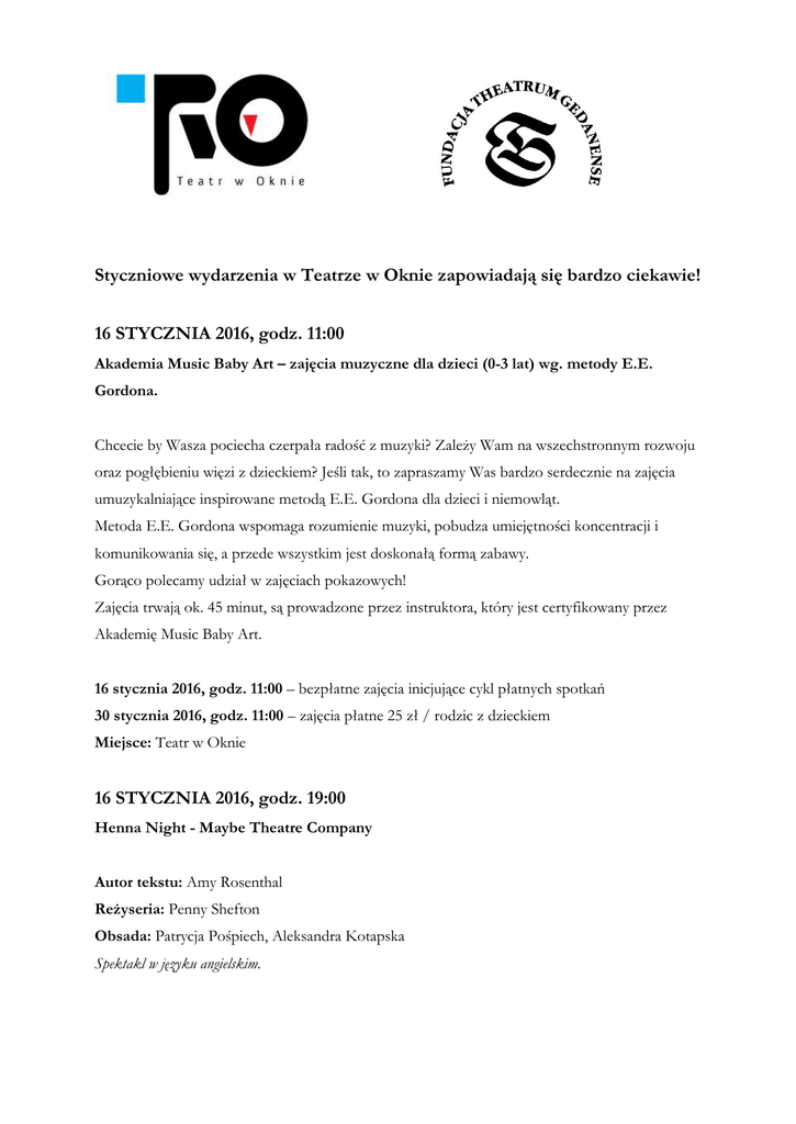 Styczniowe wydarzenia w Teatrze w Oknie zapowiadają się bardzo ciekawie! 16 STYCZNIA 2016, godz. 11:00 Akademia Music Baby Art – zajęcia muzyczne dla dzieci (0-3 lat) wg. metody E.E. Gordona. Chcecie by Wasza pociecha czerpała radość z muzyki? Zależy Wam na wszechstronnym rozwoju oraz pogłębieniu więzi z dzieckiem? Jeśli tak, to zapraszamy Was bardzo serdecznie na zajęcia umuzykalniające inspirowane metodą E.E. Gordona dla dzieci i niemowląt. Metoda E.E. Gordona wspomaga rozumienie muzyki, pobudza umiejętności koncentracji i komunikowania się, a przede wszystkim jest doskonałą formą zabawy. Gorąco polecamy udział w zajęciach pokazowych! Zajęcia trwają ok. 45 minut, są prowadzone przez instruktora, który jest certyfikowany przez Akademię Music Baby Art. 16 stycznia 2016, godz. 11:00 – bezpłatne zajęcia inicjujące cykl płatnych spotkań 30 stycznia 2016, godz. 11:00 – zajęcia płatne 25 zł / rodzic z dzieckiem Miejsce: Teatr w Oknie 16 STYCZNIA 2016, godz. 19:00 Henna Night - Maybe Theatre Company Autor tekstu: Amy Rosenthal Reżyseria: Penny Shefton Obsada: Patrycja Pośpiech, Aleksandra Kotapska Spektakl w języku angielskim. Czas porozmawiać o tym, co niewypowiedziane. Czas zmierzyć się z własnymi słabościami i lękami. Czy da się przewidzieć koniec miłości? Czy da się za wszelką cenę zatrzymać ukochaną osobę? Czy rozstanie rzeczywiście wzmacnia uczucia? Dwie kobiety i jeden mężczyzna, błaha sprawa, nie koniec świata, nic co poruszy niebo i ziemię, po prostu coś, co zdarza się każdego dnia, coś co spotyka nas wszystkich. Początek: 16 stycznia 2016, godz. 19:00 Miejsce: Teatr w Oknie Bilety: 20/15 zł, grupowe 12 zł 17 STYCZNIA 2016, godz. 18:00 Playreadings: Teapot Club@TwO - Maybe Theatre Company Pokaz powarsztatowy w języku angielskim. Reżyseria: Penny Shefton Krojenie warzyw zwykło być zwykłym kuchennym obowiązkiem. Obecnie jest zupełnie inaczej. To co słyszysz, nie zawsze jest tym, co widzisz. Jeśli chcesz przetrwać, zacznij czytać między wierszami. Aktualna i skłaniająca do refleksji niedzielna uczta z Teapot Club. Początek: 17 stycznia 2016, godz. 18:00 Miejsce: Teatr w Oknie Bilety: wstęp wolny 30 STYCZNIA 2016, godz. 20:00 Piaf - recital Katarzyny Dendys-Koseckiej Reżyseria: Kuba Abrahamowicz, Występuje: Katarzyna Dendys-Kosecka, Aranżacja muzyczna: Tomasz Pala Recital „Piaf” jest intymnym spotkaniem z wielką legendą francuskiej piosenki. Opowiada o głębokim smutku, rozdzierających tragediach, płomiennej miłości, rozkoszach zakochania i słodyczy romansu, a także niewyobrażalnym koszmarze istnienia dla sceny i na scenie. Jest historią zwyczajnej dziewczyny zrodzonej z przypadku, bólu i rozpaczy. Jest także historią malutkiej dziewczynki porzuconej przez rodziców i wychowanej w burdelu. Jest też historią młodziutkiej kobiety, której umiera dwuletnia córeczka. I jest także historią dojrzałej kobiety, ofiary nieszczęśliwych uczuć. Recital jest Historią Wielkiej Artystki, której piosenki nuci cały świat pozostawiając nas z pytaniem o wymiar szczęścia, wielkość nieszczęścia i trwałość ludzkiej duszy. Recital Piaf był czterokrotnie prezentowany na Międzynarodowym Festiwalu Edith Piaf w Krakowie, dwukrotnie na festiwalu Frankofonii w Tychach, na festiwalu Form MuzycznoTeatralnych w Lublinie i na Warszawskiej Teatralnej Wiośnie na Rakowcu. Początek: 30 stycznia 2016, godz. 20:00 Miejsce: Teatr w Oknie Bilety: 30 zł Konieczna jest rezerwacja miejsc. SPRZEDAŻ I REZERWACJA BILETÓW: Teatr w Oknie, Ul. Długa 50/51 Gdańsk Sprzedaż biletów na 20 minut przed wszystkimi wydarzeniami, płatność gotówką. Rezerwacje pod numerem: 58 322 04 14 oraz e-mailem: [email protected] Kontakt: Dorota Sentkowska - Koordynator Teatru w Oknie [email protected] tel.: + 48 58 322 04 14 |+ 48 533 333 855