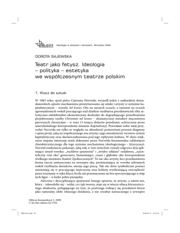Ideologie w słowach i obrazach, Wrocław 2009 DOROTA SAJEWSKA Teatr jako fetysz. Ideologia – polityka – estetyka we współczesnym teatrze polskim 1. Klucz do sztuki W 1883 roku, spod pióra Cypriana Norwida, wyszedł jeden z najbardziej demaskatorskich opisów mechanizmu prostytuowania się sztuki i artysty w systemie kapitalistycznym – nowela Ad leones. Oto na naszych oczach, a zarazem na oczach zgromadzonych wokół pracującego nad dziełem rzeźbiarza przedstawicieli elity artystyczno-intelektualno-ekonomicznej dochodzi do degradującego przeobrażenia projektowanej rzeźby Christiani ad leones – dramatycznej metafory męczeństwa pierwszych chrześcijan – w wart 15 tysięcy dolarów przedmiot, ochrzczony przez amerykańskiego korespondenta mianem Kapitalizacji. Pozwalam sobie tutaj przywołać Norwida nie tylko ze względu na aktualność postawionej przezeń diagnozy i opisu presji, jaką na współczesnego mu artystę i jego niezależność wywiera system kapitalistyczny oraz skomercjalizowana pod jego wpływem kultura. W dużo większym stopniu interesuje mnie dokonane przez Norwida fenomenalne odsłonięcie charakterystycznego dla tego systemu mechanizmu ideologicznego – fetyszyzacji. Norwid znakomicie pokazuje, jaką rolę w tym świeckim rytuale odgrywa dyscyplinujący zmysł wzroku: „ruchliwe spojrzenie” i „świdry szklane” redaktora, „scjentyficzny rzut oka” guwernera, komentujące „szare i głębokie oko korespondenta wielkiego monitora Stanów Zjednoczonych”. To nie oko artysty, lecz przedmiotowa forma rzeczy umieszczona na zewnątrz oka, promieniująca ze wzroku zebranych wokół rzeźbiarza doradców, steruje jego pracą. Tak oto dwie symboliczne postaci zamieniają się w pracującego mężczyznę oraz kobietę wyobrażającą oszczędność przez trzymany w ręku klucz; bryła zaś przeznaczona na lwa spoczywającego u stóp tych figur – w kufer pełen pieniędzy. Aktywne i dyscyplinujące spojrzenie Innego sprawia, że artysta, a zatem ten, który – zdawałoby się – widzi, co i jak tworzy, staje się w istocie ofiarą fetyszystycznego złudzenia, polegającego na tym, że postrzega rodzący się przedmiot-fetysz jako naturalny efekt własnego działania, a nie rezultat narzucanego z zewnątrz Oblicza Komunikacji 2, 2009 © for this edition by CNS OBLICZA.indb 99 2010-01-27 12:53:26 100 DOROTA SAJEWSKA spojrzenia. Przystępujący do pracy Norwidowski artysta ma początkowo przed sobą bezkształtną masę wilgotnej gliny, którą widzi, ale która za sprawą osłabionej pod wpływem sugestii zgromadzonych wokół redaktorów i komentatorów jednostkowej woli, coraz silniej patrzy na niego, sprawiając, że ostateczny kształt, forma i znaczenie rzeźby stają się nie jego własnością, lecz własnością spojrzenia Innego. A zatem spojrzenia, które należy do dyskursu kultury, do władzy symbolicznej, która manifestuje się w języku sterujących rękami rzeźbiarza reprezentantów przemysłu kulturowego. Projekt doskonały, niejednoznaczny przekształca się pod wpływem dotyku artysty (tego najbardziej demistyfikatorskiego zmysłu!) i zniewalającego wzroku Innych w przedmiot sprostytuowany, zawłaszczony, niczym opisywany niegdyś przez Rolanda Barthes’a samochód marki Citroën DS, który „rzucony na pożarcie mediom, staje się samym aktem drobnomieszczańskiego awansu” (Barthes 2000: 192). Oczywiście, można powiedzieć, że Norwidowi było łatwiej uchwycić miejsce, jakie przedmiot-fetysz zajmował w strukturze stosunków społeczno-ekonomicznych nowoczesnego kapitalizmu. Dowiedli tego potem w swych szczegółowych analizach teoretycznych Marks, Benjamin, Althusser, Barthes. Dużo trudniej jednak rozpoznać istotę tego mechanizmu w ponowoczesnym, globalnym i elektronicznym świecie, w którym mamy do czynienia z postępującym rozpadem podstawowej cechy fetysza – jego materialności. Czy zatem opisując funkcjonowanie sztuki w postmodernistycznej rzeczywistości, należy zrezygnować z pojęcia fetyszu? W sukurs przychodzi tutaj Slavoj Žižek ze swoją koncepcją „spektralizacji fetysza”, wskazując na to, jak sama produkcja zaczyna dzisiaj funkcjonować jako fetysz: Postmodernistyczna przejrzystość procesu produkcji jest fałszywa o tyle, o ile zaciera ów niematerialny porządek wirtualny, który w istocie kieruje tym procesem... Ta zmiana na rzecz pieniądza elektronicznego wpływa również na rozróżnienie między kapitałem a pieniądzem. Kapitał funkcjonuje jako wysublimowana, nie dająca się przedstawić rzecz, obecna jedynie w swych skutkach. (Žižek 2001: 157) Žižek podpowiada kierunek myślenia, nie daje jednak żadnej gotowej recepty, jak dobrać się do „niewidzialnego widma Kapitału”, które usiłuje zdominować dzisiaj stosunki społeczne. Tym bardziej nie odpowiada na pytanie, jak odkryć funkcjonowanie owego mechanizmu ideologicznego w przestrzeni, która mnie interesuje najbardziej – czyli w teatrze. W niniejszym tekście chciałabym postawić kilka pytań współczesnemu teatrowi polskiemu, w moim przekonaniu fundamentalnyc h,szczególnie w obliczu toczonych ostatnio w środowisku teatralnym batalii o tzw. teatr zaangażowany. Chciałabym zapytać o to, co dla dzisiejszego teatru wydaje się zadaniem najpilniejszym i najtrudniejszym: o awangardową politykę przekroczenia w XXI wieku, w dobie panowania – jak mawia Peter Sloterdijk – „faszyzmu przyjemności” (Amüsierfaschismus) a zatem: – o możliwość odsłaniania i dekonstruowania przez sceniczne działanie globalnej władzy rynku w ramach społeczeństwa informacyjnego; Oblicza Komunikacji 2, 2009 © for this edition by CNS OBLICZA.indb 100 2010-01-27 12:53:27 TEATR JAKO FETYSZ. IDEOLOGIA – POLITYKA – ESTETYKA WE WSPÓŁCZESNYM TEATRZE POLSKIM 101 – o możliwość wymknięcia się teatru spod władzy totalności spektaklu przenikającego dzisiaj do wszystkich sfer życia społecznego; – o możliwość