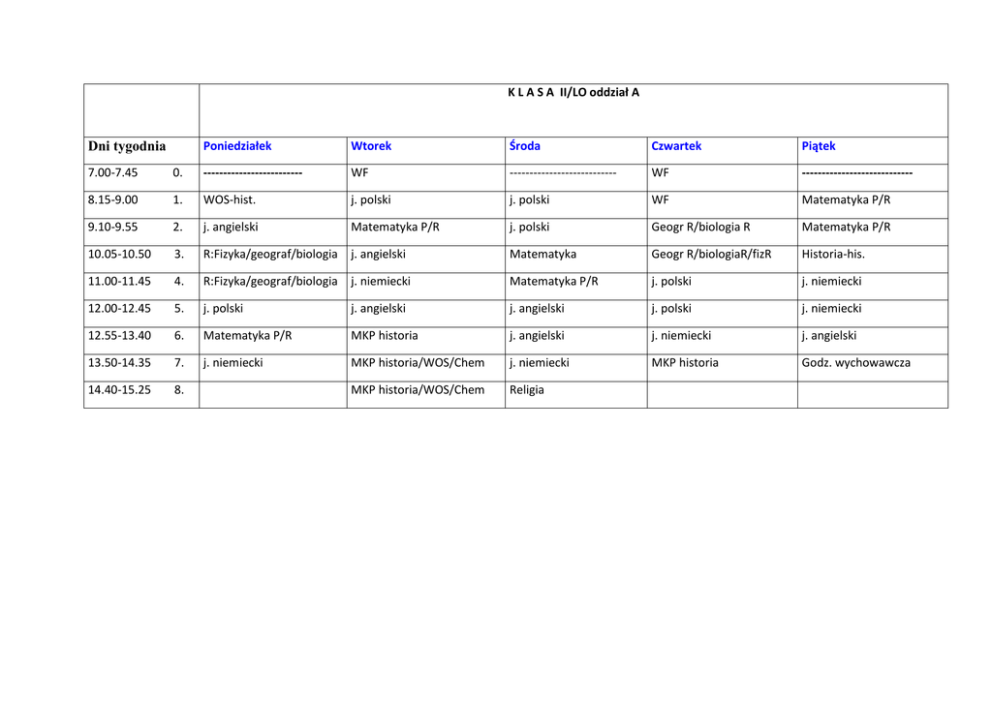 K L A S A II/LO oddział A Dni tygodnia Poniedziałek Wtorek Środa Czwartek Piątek 7.00-7.45 0. ------------------------- WF --------------------------- WF ---------------------------- 8.15-9.00 1. WOS-hist. j. polski j. polski WF Matematyka P/R 9.10-9.55 2. j. angielski Matematyka P/R j. polski Geogr R/biologia R Matematyka P/R 10.05-10.50 3. R:Fizyka/geograf/biologia j. angielski Matematyka Geogr R/biologiaR/fizR Historia-his. 11.00-11.45 4. R:Fizyka/geograf/biologia j. niemiecki Matematyka P/R j. polski j. niemiecki 12.00-12.45 5. j. polski j. angielski j. angielski j. polski j. niemiecki 12.55-13.40 6. Matematyka P/R MKP historia j. angielski j. niemiecki j. angielski 13.50-14.35 7. j. niemiecki MKP historia/WOS/Chem j. niemiecki MKP historia Godz. wychowawcza 14.40-15.25 8. MKP historia/WOS/Chem Religia