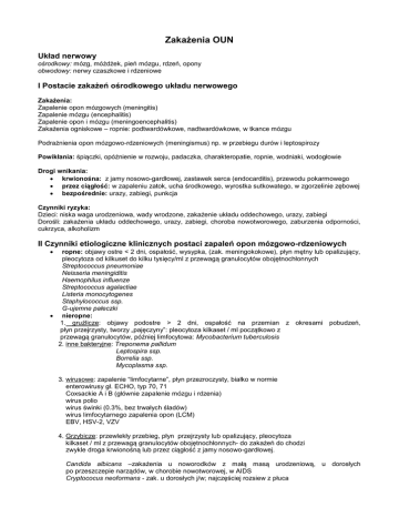 Zakażenia OUN Układ nerwowy ośrodkowy: mózg, móżdżek, pień mózgu, rdzeń, opony obwodowy: nerwy czaszkowe i rdzeniowe I Postacie zakażeń ośrodkowego układu nerwowego Zakażenia: Zapalenie opon mózgowych (meningitis) Zapalenie mózgu (encephalitis) Zapalenie opon i mózgu (meningoencephalitis) Zakażenia ogniskowe – ropnie: podtwardówkowe, nadtwardówkowe, w tkance mózgu Podrażnienia opon mózgowo-rdzeniowych (meningismus) np. w przebiegu durów i leptospirozy Powikłania: śpiączki, opóźnienie w rozwoju, padaczka, charakteropatie, ropnie, wodniaki, wodogłowie Drogi wnikania: krwionośna: z jamy nosowo-gardłowej, zastawek serca (endocarditis), przewodu pokarmowego przez ciągłość: w zapaleniu zatok, ucha środkowego, wyrostka sutkowatego, w zgorzelinie zębowej bezpośrednie: urazy, zabiegi, punkcja Czynniki ryzyka: Dzieci: niska waga urodzeniowa, wady wrodzone, zakażenie układu oddechowego, urazy, zabiegi Dorośli: zakażenia układu oddechowego, urazy, zabiegi, choroba nowotworowego, zaburzenia odporności, cukrzyca, alkoholizm II Czynniki etiologiczne klinicznych postaci zapaleń opon mózgowo-rdzeniowych ropne: objawy ostre < 2 dni, ospałość, wysypka, (zak. meningokokowe), płyn mętny lub opalizujący, pleocytoza od kilkuset do kilku tysięcy/ml z przewagą granulocytów obojętnochłonnych Streptococcus pneumoniae Neisseria meningiditis Haemophilus influenze Streptococcus agalactiae Listeria monocytogenes Staphylococcus ssp. G-ujemne pałeczki nieropne: 1. gruźlicze: objawy podostre > 2 dni, ospałość na przemian z okresami pobudzeń, płyn przejrzysty, tworzy „pajęczyny”: pleocytoza kilkaset / ml początkowo z przewagą granulocytów, później limfocytowa: Mycobacterium tuberculosis 2. inne bakteryjne: Treponema pallidum Leptospira ssp. Borrelia ssp. Mycoplasma ssp. 3. wirusowe: zapalenie “limfocytarne”, płyn przezroczysty, białko w normie enterowirusy gł. ECHO, typ 70, 71 Coxsackie A i B (głównie zapalenie mózgu i rdzenia) wirus polio wirus świnki (0.3%, bez trwałych śladów) wirus limfocytarnego zapalenia opon (LCM) EBV, HSV-2, VZV 4. Grzybicze: przewlekły przebieg, płyn przejrzysty lub opalizujący, pleocytoza kilkaset / ml z przewagą granulocytów obojętnochłonnych- do zakażeń do chodzi zwykle droga krwionośną lub przez ciągłość z jamy nosowo-gardłowej. Candida albicans –zakażenia u noworodków z małą masą urodzeniową, u dorosłych po przeszczepie narządów, w chorobie nowotworowej, w AIDS Cryptococus neoformans - zak. u dorosłych j/w; najczęściej rozsiew z płuca Aspergillus ssp. – zakażenia jak wyżej Xylohypha ssp., Biopolaris ssp. – feohyfomikoza mózgu; rozsiew z płuc lub zatok; zmiany w płatach czołowych 5. pierwotniakowe: Toxoplasma gondi, Naegleria fowleri Zakażenia w określonych grupach wiekowych do 2 miesiąca życia: Streptococcus gr.B (0-3 III trymestrze ciąży) E.coli K1 (0-6 mies.) Listeria ssp. Enterobacteriacae 2 mies. – 5 lat: Heamophilus influenzae b Streptococcus pneumoniae Neisseria meningitidis (6 – 12 mies.) dorośli: Streptococcus pneumoniae Neisseria meningitidis mies.; wysokie nosicielstwo w Najczęstsze czynniki etilogiczne: Neisseria meningitidis Heamophilus influenzae b Streptococcus pneumoniae Zakażenia szpitalne: po zabiegach: Staphylococcus ssp. Enterococcus ssp. G-ujemne pałeczki Candida ssp. Po przeszczepach, w immunosupresji: G-ujemne pałeczki Zakażenia połączeń komorowo-przedsionkowych – shunt infection: W wodogłowiu 3-10%; krwiopochodne lub okołozabiegowe Staphylococcus ssp. Corynebacterium ssp. Propionibacterium ssp. G-ujemne pałeczki Candida ssp. Ropień mózgu Pierwotny – powikłanie pourazowe lub pozabiegowe: Staphylococcus ssp. Streptococcus ssp. Enterobacteriaceae Pseudomonas ssp. Clostridium ssp. Wtórny – z sąsiadujących ognisk: Bacteroides fragilis Prevotella melanogenica (ropnie w okolicy skroniowej) Fusobacterium necrophorum Streptococcus ssp. Actinomyces ssp. (rzadko) Pojedynczy Mnogie – powstałe w wyniku wysiewu droga krwi z innych ognisk; rzadkie Nocardia ssp. (nokardioza płuc) Entamoeba (z zakażeń wątroby, płuc) Toxoplasma gondii (w AIDS) Ropnie jako powikłanie zapalenia opon mózgowo-rdzeniowych – etiologia jednorodna Czynniki ryzyka: wrodzone uraz głowy wady serca, mukowiscydoza, zapalenie zatok, zapalenie ucha, Wirusowe zakażenia OUN Uszkodzenie neuronów: liza demielinizacja degeneracja gąbczasta 1. Zakażenia ostre: bezpośrednia inwazja wirusa do OUN Zapalenie opon mózgowo-rdzeniowych: zapalenie „limfocytarne”, płyn przezroczysty, białko w normie enterowirusy gł. ECHO, typ. 70, 71 Coxsackie A i B (głównie zapalenie mózgu i rdzenia) wirus polio wirus świnki (0.3%, bez trwałych śladów) wirus limfocytarnego zapalenia opon (LCM) EBV, HSV-2, VZV Nagminne porażenie dziecięce: wirus polio enterowirus 70 (rzadziej postać porażenna) Zapalenie opon mózgowo-rdzeniowych i mózgu: HSV-1 arbowirusy: (Flaviviridae – zapalenie mózgu St. mózgu) Louis- komary, kleszczowe zapalenie Zespół demencji w przebiegu AIDS: zapalenie opon, zanik kory, ogniskowa, martwica, neuropatia obwodowa; Ag wirusowa wykrywane w białej substancji mózgu: HIV-1 2. Ostre zespoły poekspozycyjne – wynik zaburzonej odpowiedzi na Ag wirusa; występuje po kontakcie z wirusem żywym, inaktywowanym, wirusowym Ag; brak wirusów w OUN Pozakaźne i poszczepienne zapalenie mózgu i rdzenia: demielinizacja, proliferacja mikrogleju, nacieki z limfocytów: odra (przy obniżonej odporności) różyczka (Rubella virus) świnka (Mumps virus – powikłania, głuchota) VZV wścieklizna (szczepionki uzyskane na tkance nerwowej; obj. neuroparalityczne, śpiączka; śmiertelność ~ 30%) krowianka Zespół Guillaina – Barrego – zapalenie korzeni nerwowychz demielinizacją wirusy grypy (szczepionka) enterowirusy EBV, CMV Zespół Reye’a – gł. dzieci; encefalopatia, obrzęk mózgu; śmiertelność 25-30% wirus grypy B – In
