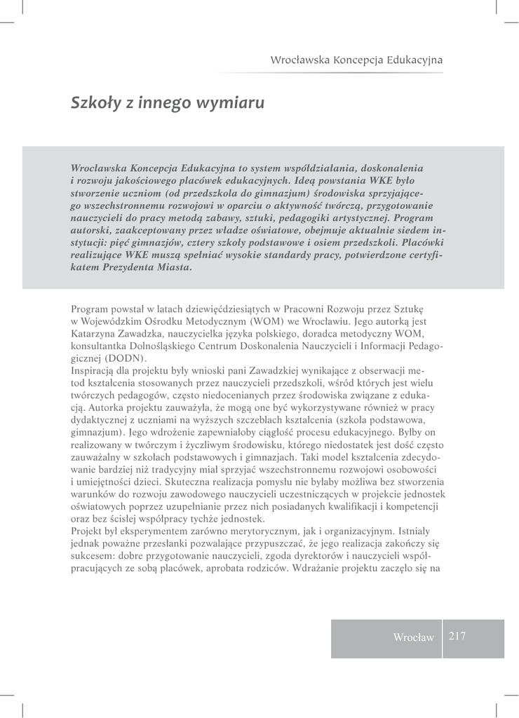 Wrocławska Koncepcja Edukacyjna Szkoły z innego wymiaru Wrocławska Koncepcja Edukacyjna to system współdziałania, doskonalenia i rozwoju jakościowego placówek edukacyjnych. Ideą powstania WKE było stworzenie uczniom (od przedszkola do gimnazjum) środowiska sprzyjającego wszechstronnemu rozwojowi w oparciu o aktywność twórczą, przygotowanie nauczycieli do pracy metodą zabawy, sztuki, pedagogiki artystycznej. Program autorski, zaakceptowany przez władze oświatowe, obejmuje aktualnie siedem instytucji: pięć gimnazjów, cztery szkoły podstawowe i osiem przedszkoli. Placówki realizujące WKE muszą spełniać wysokie standardy pracy, potwierdzone certyfikatem Prezydenta Miasta. Program powstał w latach dziewięćdziesiątych w Pracowni Rozwoju przez Sztukę w Wojewódzkim Ośrodku Metodycznym (WOM) we Wrocławiu. Jego autorką jest Katarzyna Zawadzka, nauczycielka języka polskiego, doradca metodyczny WOM, konsultantka Dolnośląskiego Centrum Doskonalenia Nauczycieli i Informacji Pedagogicznej (DODN). Inspiracją dla projektu były wnioski pani Zawadzkiej wynikające z obserwacji metod kształcenia stosowanych przez nauczycieli przedszkoli, wśród których jest wielu twórczych pedagogów, często niedocenianych przez środowiska związane z edukacją. Autorka projektu zauważyła, że mogą one być wykorzystywane również w pracy dydaktycznej z uczniami na wyższych szczeblach kształcenia (szkoła podstawowa, gimnazjum). Jego wdrożenie zapewniałoby ciągłość procesu edukacyjnego. Byłby on realizowany w twórczym i życzliwym środowisku, którego niedostatek jest dość często zauważalny w szkołach podstawowych i gimnazjach. Taki model kształcenia zdecydowanie bardziej niż tradycyjny miał sprzyjać wszechstronnemu rozwojowi osobowości i umiejętności dzieci. Skuteczna realizacja pomysłu nie byłaby możliwa bez stworzenia warunków do rozwoju zawodowego nauczycieli uczestniczących w projekcie jednostek oświatowych poprzez uzupełnianie przez nich posiadanych kwalifikacji i kompetencji oraz bez ścisłej współpracy tychże jednostek. Projekt był eksperymentem zarówno merytorycznym, jak i organizacyjnym. Istniały jednak poważne przesłanki pozwalające przypuszczać, że jego realizacja zakończy się sukcesem: dobre przygotowanie nauczycieli, zgoda dyrektorów i nauczycieli współpracujących ze sobą placówek, aprobata rodziców. Wdrażanie projektu zaczęło się na Wrocław 217 dobre w 2001 roku. Jego istota polegała na stworzeniu uczniom (od przedszkola do gimnazjum) sprzyjającego środowiska aktywności twórczej. Zapewnić je mieli nauczyciele przygotowani do pracy metodą zabawy i sztuki oraz pedagogiki artystycznej. Cele programu to: wspieranie holistycznego rozwoju wychowanków i postawy otwarcia na świat - od inspiracji, przez twórczość aż po kreację, stworzenie systemu ciągłości kształcenia w kontakcie ze sztuką, środowiskiem przyrodniczym i społecznym, integracja i promocja środowiska nauczycielskiego. Powstała Rada Programowa oraz reprezentująca ją Kapituła. Każda z placówek powołała lidera WKE. Opracowano zestaw dokumentów, które określają formalną stronę działań: standardy edukacyjne oraz arkusze monitoringu, zasady współpracy placówek oświatowych (dokumenty umieszczono na stronie internetowej www.wke.edu.pl). Powołano komisję akredytacyjną, która decyduje o włączeniu do systemu nowych placówek. Od inspiracji do kreacji Rada Programowa WKE oraz powstałe w 2005 roku Stowarzyszenie na Rzecz Rozwoju Dzieci i Młodzieży pełnią funkcję wspierającą nauczycieli przekonanych o konieczności ciągłej modyfikacji swojego warsztatu. Organizują ich doskonalenie, promują dobre praktyki oraz pozyskują środki finansowe. We wrześniu 2006 roku Rada Programowa i Stowarzyszenie oraz Wydział Edukacji Urzędu Miasta zorganizowali we Wrocławiu ogólnopolską konferencję edukacyjną „Od inspiracji do kreacji". Tytuł ten obrazuje charakter naszych działań. Głównym celem spotkania było dzielenie się doświadczeniami, stworzenie sieci współpracy w wymiarze regionalnym i ogólnopolskim. Konferencja adresowana była do środowiska edukacyjnego, władz samorządowych wielkich miast Polski, z udziałem przedstawicieli władz oświatowych, świata kultury oraz uczelni wyższych. Akademia Rozwoju dla zainteresowań i pasji uczniów Nieodzownym warunkiem rozwoju każdej placówki jest odpowiednia postawa nauczycieli: zaangażowanie, poszukiwanie niekonwencjonalnych rozwiązań oraz świadomość wartości twórczego warsztatu zawodowego. Nauczyciele WKE intensywnie się doskonalą. Mocną stroną są kreatywni dyrektorzy oraz niewymuszona chęć współpracy. Pedagogów połączyła wspólna pasja, co zaowocowało wieloma pomysłami, wśród których jednym z najcenniejszych jest Akademia Rozwoju. Akademia ma wzbudzać ciekawość świata oraz zainteresowanie młodzieży różnymi formami aktywności. Jeżeli młodzi ludzie potrafią określić swoje pasje, umieją także zaplanować drogę swojej kariery i pożytecznie zagospodarować czas wolny, często są lepiej zmotywowani do nauki i dobrze funkcjonują w grupie rówieśniczej. W dorosłym życiu łatwiej określają swoje życiowe cele i wytrwalej dążą do ich osiągnięcia. 218 Wrocław Unia Metropolii Polskich Wrocławska Koncepcja Edukacyjna Adoptujemy zabytki. Fot. archiwum Urzędu Miasta Akademia Rozwoju to oferta zajęć pozalekcyjnych, niezwiązanych bezpośrednio z żadnym przedmiotem szkolnym, prowadzonych w atrakcyjny sposób. Oto przykłady niektórych propozycji zajęć: Katedra humanistów Leonardo (Gimnazja nr 12, 13, 14, 21) z modułami: Teatr animacji przedmiotu i przestrzeni, Od braci Lumiére do własnego filmu (z udziałem Zespołu ŻłobkowoPrzedszkolnego nr 3, Szkoły Podstawowej nr 51 i Gimnazjum nr 12), Tajemnice obrazów starych mistrzów, Mail-Art-School, Dyrygent przyszłości, Europa zaczyna się w moim 