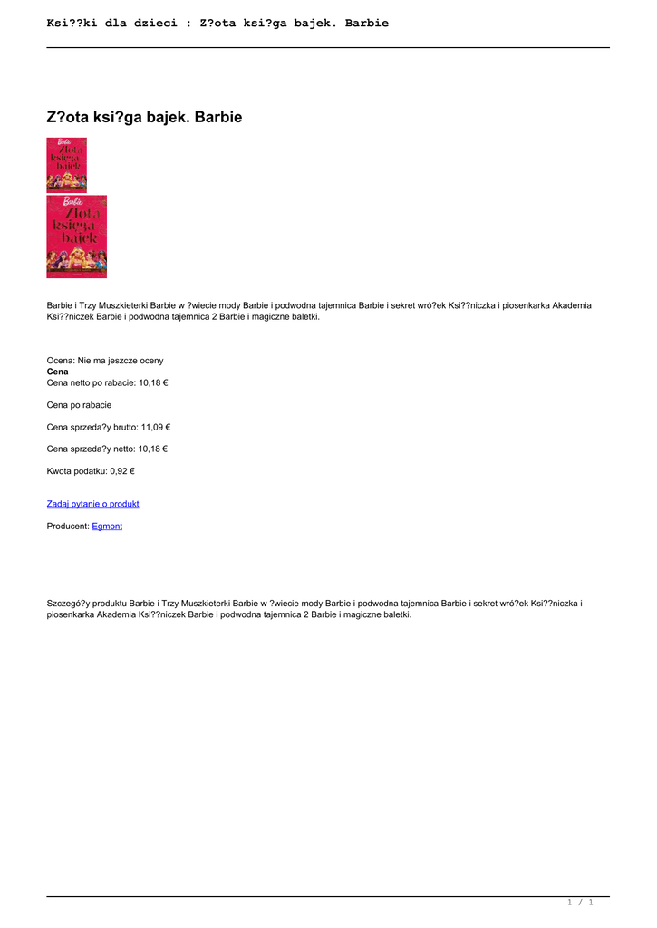 Ksi??ki dla dzieci : Z?ota ksi?ga bajek. Barbie Z?ota ksi?ga bajek. Barbie Barbie i Trzy Muszkieterki Barbie w ?wiecie mody Barbie i podwodna tajemnica Barbie i sekret wró?ek Ksi??niczka i piosenkarka Akademia Ksi??niczek Barbie i podwodna tajemnica 2 Barbie i magiczne baletki. Ocena: Nie ma jeszcze oceny Cena Cena netto po rabacie: 10,18 € Cena po rabacie Cena sprzeda?y brutto: 11,09 € Cena sprzeda?y netto: 10,18 € Kwota podatku: 0,92 € Zadaj pytanie o produkt Producent: Egmont Szczegó?y produktu Barbie i Trzy Muszkieterki Barbie w ?wiecie mody Barbie i podwodna tajemnica Barbie i sekret wró?ek Ksi??niczka i piosenkarka Akademia Ksi??niczek Barbie i podwodna tajemnica 2 Barbie i magiczne baletki. 1 / 1 Powered by TCPDF (www.tcpdf.org)