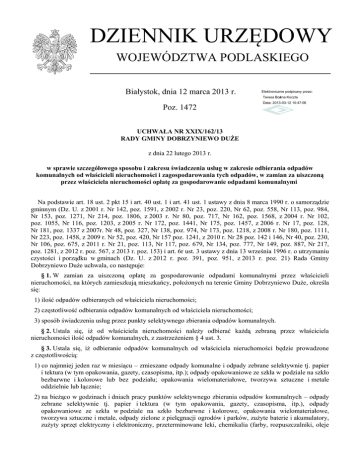 DZIENNIK URZĘDOWY WOJEWÓDZTWA PODLASKIEGO Białystok, dnia 12 marca 2013 r. Elektronicznie podpisany przez: Teresa Bożena Koczta Poz. 1472 Data: 2013-03-12 10:47:06 UCHWAŁA NR XXIX/162/13 RADY GMINY DOBRZYNIEWO DUŻE z dnia 22 lutego 2013 r. w sprawie szczegółowego sposobu i zakresu świadczenia usług w zakresie odbierania odpadów komunalnych od właścicieli nieruchomości i zagospodarowania tych odpadów, w zamian za uiszczoną przez właściciela nieruchomości opłatę za gospodarowanie odpadami komunalnymi Na podstawie art. 18 ust. 2 pkt 15 i art. 40 ust. 1 i art. 41 ust. 1 ustawy z dnia 8 marca 1990 r. o samorządzie gminnym (Dz. U. z 2001 r. Nr 142, poz. 1591, z 2002 r. Nr 23, poz. 220, Nr 62, poz. 558, Nr 113, poz. 984, Nr 153, poz. 1271, Nr 214, poz. 1806, z 2003 r. Nr 80, poz. 717, Nr 162, poz. 1568, z 2004 r. Nr 102, poz. 1055, Nr 116, poz. 1203, z 2005 r. Nr 172, poz. 1441, Nr 175, poz. 1457, z 2006 r. Nr 17, poz. 128, Nr 181, poz. 1337 z 2007r. Nr 48, poz. 327, Nr 138, poz. 974, Nr 173, poz. 1218, z 2008 r. Nr 180, poz. 1111, Nr 223, poz. 1458, z 2009 r. Nr 52, poz. 420, Nr 157 poz. 1241, z 2010 r. Nr 28 poz. 142 i 146, Nr 40, poz. 230, Nr 106, poz. 675, z 2011 r. Nr 21, poz. 113, Nr 117, poz. 679, Nr 134, poz. 777, Nr 149, poz. 887, Nr 217, poz. 1281, z 2012 r. poz. 567, z 2013 r. poz. 153) i art. 6r ust. 3 ustawy z dnia 13 września 1996 r. o utrzymaniu czystości i porządku w gminach (Dz. U. z 2012 r. poz. 391, poz. 951, z 2013 r. poz. 21) Rada Gminy Dobrzyniewo Duże uchwala, co następuje: § 1. W zamian za uiszczoną opłatę za gospodarowanie odpadami komunalnymi przez właścicieli nieruchomości, na których zamieszkują mieszkańcy, położonych na terenie Gminy Dobrzyniewo Duże, określa się: 1) ilość odpadów odbieranych od właściciela nieruchomości; 2) częstotliwość odbierania odpadów komunalnych od właściciela nieruchomości; 3) sposób świadczenia usług przez punkty selektywnego zbierania odpadów komunalnych. § 2. Ustala się, iż od właściciela nieruchomości należy odbierać każdą zebraną przez właściciela nieruchomości ilość odpadów komunalnych, z zastrzeżeniem § 4 ust. 3. § 3. Ustala się, iż odbieranie odpadów komunalnych od właściciela nieruchomości będzie prowadzone z częstotliwością: 1) co najmniej jeden raz w miesiącu – zmieszane odpady komunalne i odpady zebrane selektywnie tj. papier i tektura (w tym opakowania, gazety, czasopisma, itp.); odpady opakowaniowe ze szkła w podziale na szkło bezbarwne i kolorowe lub bez podziału; opakowania wielomateriałowe, tworzywa sztuczne i metale oddzielnie lub łącznie; 2) na bieżąco w godzinach i dniach pracy punktów selektywnego zbierania odpadów komunalnych – odpady zebrane selektywnie tj. papier i tektura (w tym opakowania, gazety, czasopisma, itp.), odpady opakowaniowe ze szkła w podziale na szkło bezbarwne i kolorowe, opakowania wielomateriałowe, tworzywa sztuczne i metale, odpady zielone z pielęgnacji ogrodów i parków, zużyte baterie i akumulatory, zużyty sprzęt elektryczny i elektroniczny, przeterminowane leki, chemikalia (farby, rozpuszczalniki, oleje Dziennik Urzędowy Województwa Podlaskiego –2– Poz. 1472 odpadowe, itp.), meble i inne odpady wielkogabarytowe, zużyte opony, odpady budowlano-remontowe pochodzące z remontów prowadzonych samodzielnie. 3) w ramach organizowanych zbiórek według odrębnie ustalonego harmonogramu co najmniej 1 raz w roku - meble i inne odpady wielkogabarytowe oraz zużyty sprzęt elektryczny i elektroniczny. § 4. 1. Punkty selektywnego zbierania odpadów komunalnych będą świadczyły usługi co najmniej 1 dzień w tygodniu przez 6 godzin. 2. Właściciele nieruchomości samodzielnie dostarczają do punktu selektywnego zbierania odpadów odpady komunalne określone w § 3 pkt 2 zebrane w sposób selektywny. 3. Odpady budowlano-remontowe będą przyjmowane w punktach selektywnego zbierania odpadów komunalnych w ilości do 1 m3 na rok od gospodarstwa domowego. 4. W punktach selektywnego zbierania odpadów komunalnych nie będą przyjmowane odpady, jeżeli ich rodzaj i ilość wskazywałyby, że nie są one pochodzenia komunalnego. 5. Wójt Gminy Dobrzyniewo Duże podaje do publicznej wiadomości na stronie internetowej Urzędu Gminy Dobrzyniewo Duże adresy punktów selektywnego zbierania odpadów komunalnych wraz ze wskazaniem dni i godzin przyjmowania odpadów. § 5. Wykonanie uchwały powierza się Wójtowi Gminy Dobrzyniewo Duże. § 6. Traci moc uchwała nr XXVI/133/12 Rady Gminy Dobrzyniewo Duże z dnia 22 listopada 2012 r. w sprawie szczegółowego sposobu i zakresu świadczenia usług w zakresie odbierania odpadów komunalnych od właścicieli nieruchomości i zagospodarowania tych odpadów, w zamian za uiszczoną przez właściciela nieruchomości opłatę za gospodarowanie odpadami komunalnymi. § 7. Uchwała wchodzi w życie po upływie 14 dni od dnia jej ogłoszenia w Dzienniku Urzędowym Województwa Podlaskiego z mocą obowiązującą od dnia 1 lipca 2013 r. Przewodniczący Rady Gminy Mirosław Kłosek