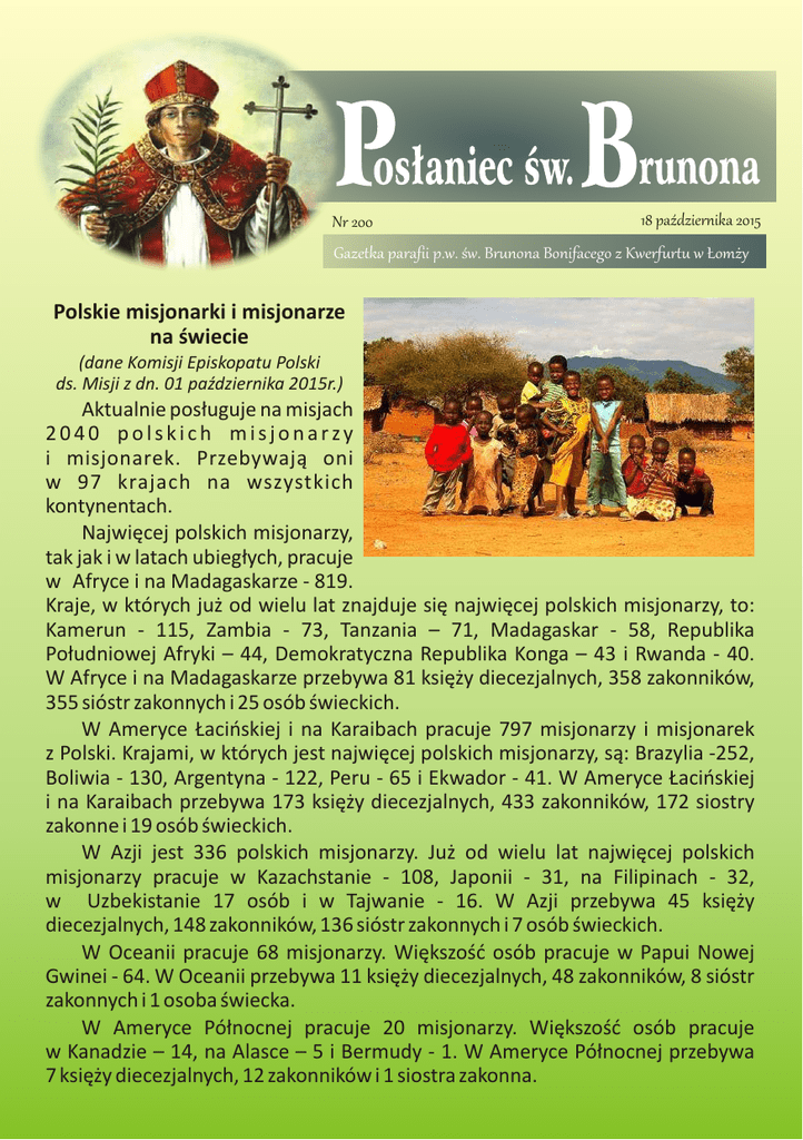 Nr 200 18 paŸdziernika 2015 Gazetka parafii p.w. œw. Brunona Bonifacego z Kwerfurtu w £om¿y Polskie misjonarki i misjonarze na œwiecie (dane Komisji Episkopatu Polski ds. Misji z dn. 01 paŸdziernika 2015r.) Aktualnie pos³uguje na misjach 2040 polskich misjonarzy i misjonarek. Przebywaj¹ oni w 97 krajach na wszystkich kontynentach. Najwiêcej polskich misjonarzy, tak jak i w latach ubieg³ych, pracuje w Afryce i na Madagaskarze - 819. Kraje, w których ju¿ od wielu lat znajduje siê najwiêcej polskich misjonarzy, to: Kamerun - 115, Zambia - 73, Tanzania – 71, Madagaskar - 58, Republika Po³udniowej Afryki – 44, Demokratyczna Republika Konga – 43 i Rwanda - 40. W Afryce i na Madagaskarze przebywa 81 ksiê¿y diecezjalnych, 358 zakonników, 355 sióstr zakonnych i 25 osób œwieckich. W Ameryce £aciñskiej i na Karaibach pracuje 797 misjonarzy i misjonarek z Polski. Krajami, w których jest najwiêcej polskich misjonarzy, s¹: Brazylia -252, Boliwia - 130, Argentyna - 122, Peru - 65 i Ekwador - 41. W Ameryce £aciñskiej i na Karaibach przebywa 173 ksiê¿y diecezjalnych, 433 zakonników, 172 siostry zakonne i 19 osób œwieckich. W Azji jest 336 polskich misjonarzy. Ju¿ od wielu lat najwiêcej polskich misjonarzy pracuje w Kazachstanie - 108, Japonii - 31, na Filipinach - 32, w Uzbekistanie 17 osób i w Tajwanie - 16. W Azji przebywa 45 ksiê¿y diecezjalnych, 148 zakonników, 136 sióstr zakonnych i 7 osób œwieckich. W Oceanii pracuje 68 misjonarzy. Wiêkszoœæ osób pracuje w Papui Nowej Gwinei - 64. W Oceanii przebywa 11 ksiê¿y diecezjalnych, 48 zakonników, 8 sióstr zakonnych i 1 osoba œwiecka. W Ameryce Pó³nocnej pracuje 20 misjonarzy. Wiêkszoœæ osób pracuje w Kanadzie – 14, na Alasce – 5 i Bermudy - 1. W Ameryce Pó³nocnej przebywa 7 ksiê¿y diecezjalnych, 12 zakonników i 1 siostra zakonna. str. 2 Pos³aniec œw. Brunona Ewangelia wg Œw. Marka (Mk 10,35-45). Jakub i Jan, synowie Zebedeusza, zbli¿yli siê do Jezusa i rzekli: „Nauczycielu, chcemy, ¿ebyœ nam uczyni³ to, o co Ciê poprosimy”. On ich zapyta³: „Co chcecie, ¿ebym wam uczyni³?” Rzekli Mu: „U¿ycz nam, ¿ebyœmy w Twojej chwale siedzieli jeden po prawej, drugi po lewej Twej stronie”. Jezus im odpar³: „Nie wiecie, o co prosicie. Czy mo¿ecie piæ kielich, który Ja mam piæ, albo przyj¹æ chrzest, którym Ja mam byæ ochrzczony?” Odpowiedzieli Mu: „Mo¿emy”. Lecz Jezus rzek³ do nich: „Kielich, który Ja mam piæ, piæ bêdziecie; i chrzest, który Ja mam przyj¹æ, wy równie¿ przyjmiecie. Nie do Mnie jednak nale¿y daæ miejsce po mojej stronie prawej lub lewej, ale dostanie siê ono tym, dla których zosta³o przygotowane”. Gdy dziesiêciu to us³ysza³o, poczêli oburzaæ siê na Jakuba i Jana. A Jezus przywo³a³ ich do siebie i rzek³ do nich: „Wiecie, ¿e ci, którzy uchodz¹ za w³adców narodów, uciskaj¹ je, a ich wielcy daj¹ im odczuæ sw¹ w³adzê. Nie tak bêdzie miêdzy wami. Lecz kto by miêdzy wami chcia³ siê staæ wielki, niech bêdzie s³ug¹ waszym. A kto by chcia³ byæ pierwszym miêdzy wami, niech bêdzie niewolnikiem wszystkich. Bo i Syn Cz³owieczy nie przyszed³, aby Mu s³u¿ono, lecz ¿eby s³u¿yæ i daæ swoje ¿ycie na okup za wielu”. * * * * * * * * * * * * TAJEMNICA KIELICHA W S£U¯BIE ¯YCIU Kielich w Biblii jest obrazem gniewu Bo¿ego. Izrael jak i obce narody mia³y go wypiæ do dna, co stanowi³o obraz kary. To ¿e Jezus mówi o sobie, ¿e bêdzie pi³ kielich, oznacza Jego dobrowoln¹ ofiarê, czyli przyjêcie kary, która w s³uszny sposób mia³a byæ wymierzona grzesznikom, a wiêc nam. Dlatego z ca³¹ moc¹ mówi, ¿e nie przyszed³, aby Mu s³u¿ono, lecz ¿eby s³u¿yæ i daæ swoje ¿ycie jako okup za wielu (Mk 10,45), co w pe³ni objawi³o siê na krzy¿u. Tak realizowane pos³annictwo jest zarówno wype³nieniem proroctw, jak i zapowiedzi¹ zupe³nie nowej perspektywy. To w³aœnie ukazuj¹ dzisiejsze czytania. Izajasz zapowiada nadejœcie S³ugi Pañskiego, który bêdzie zmia¿d¿ony cierpieniem, nios¹c grzechy ludzi. Z³o¿y on siebie w ofierze, dziêki czemu zarysuje siê przed nim nowa perspektywa, ujrzy œwiat³o (czyli ¿ycie) i nim siê nasyci (Iz 53,11). Wed³ug autora Listu do Hebrajczyków, ofiara z³o¿ona przez Chrystusa, Nowego Arcykap³ana, przekracza znacznie to, co do tej pory by³o sk³adane jako okup. Jezus wspó³czuje naszym s³aboœciom, a Jego ofiara przywraca nam oraz Bogu cz³owieka. Dziêki temu mo¿emy przyst¹piæ z ufnoœci¹ do tronu ³aski, to jest tronu Boga (Hbr 4,16). Nasze ¿ycie jest wêdrówk¹ z Jezusem ku Jerozolimie, Jego Mêce i Œmierci, ale i Zmartwychwstaniu. Chrystus nie tylko nas naucza, ale pokazuje, co robiæ, by wype³niæ Bo¿¹ wolê. Ta natomiast zawsze objawia siê w czynieniu dobra wobec drugiego cz³owieka – tak jak to robi³ Jezus. A zatem panowaæ to s³u¿yæ ¿yciu, dawaæ ¿ycie. * * * * * * * * * * Trzeba "zobaczyæ tego Jezusa, który sta³ siê ma³y, by dotrzeæ do naszej s³aboœci; przyj¹³ nasze œmiertelne cia³o, by daæ mu sw¹ nieœmiertelnoœæ; wychodzi nam codziennie na spotkanie, by podaæ nam przyjazn¹ d³oñ w trudnoœciach". "Nigdy nie zapominajcie swego pierwszego spotkania z Jezusem, radoœci, z jak¹ po raz pierwszy o Nim us³yszeliœcie, mo¿e od rodziców, dziadków, katechetów czy nauczycieli. Nie ustawajcie w modlitwie jedni za drugich, by wspieraæ siê ni¹ nawzajem. A wtedy zobaczycie, jak przez was, mimo waszej s³aboœci, Jezus dokona cudów wobec wszystkich ludów". "Kiedy widzimy Jezusa w drugim cz³owieku, serce oczyszcza siê i wyzwala od egoizmu". papie¿ Franciszek Pos³aniec œw. Brunona str. 3 PIERWSZY KONTYNENT Azja jest miejscem, gdzie najwczeœniej by³a g³oszona Ewangelia zaraz po za³o¿eniu Koœcio³a. Tam powstawa³y pierwsze wspólnoty wierz¹cych, z których wysy³ani byli aposto³owie, pierwsi misjonarze, aby zanieœæ Dobr¹ Nowinê „a¿ po krañce ziemi”. Teraz ten najwiêkszy kon
