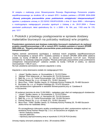W związku z realizacją przez Stowarzyszenie Rozwoju Regionalnego Pomerania projektu współfinansowanego ze środków UE w ramach EFS i budŜetu państwa z ZPORR 2004-2006 „Rozwój potencjału pracowników przez podniesienie umiejętności interpersonalnych” zgodnie z podpisana umową nr Z/2.32/II/2.1/WUP/U/25/06 z dnia 21 lipca 2006 r. informujemy o rozstrzygnięciu następujących procedur zgodnych z Ustawą z dn. 29.01.2004 r. Prawo zamówień publicznych, tekst ujednolicony Dz. U. z 2006 r. Nr 164, poz. 1163 oraz Nr 170, poz. 1217 I. Protokół z przebiegu postępowania w sprawie dostawy materiałów biurowych na potrzeby realizacji w/w projektu. Przedmiotem zamówienia jest dostawa materiałów biurowych niezbędnych do realizacji projektu współfinansowanego z UE w ramach EFS i budŜetu państwa w ramach ZPORR 2004-2006 pn. "Rozwój potencjału pracowników przez podniesienie umiejętności interpersonalnych" Ogólna wartość zamówienia wynikająca z realizacji trzech projektów współfinansowanych z Unii Europejskiej w ramach EFS i budŜetu państwa w ramach ZPORR 2004-2006 ustalona została na kwotę 27.689,90 zł (netto), co stanowi równowartość 6.311,81 euro. Wartość zamówienia na realizację wyłącznie projektu "Rozwój potencjału pracowników przez podniesienie umiejętności interpersonalnych" ustalona została na kwotę 7.876,90 zł (netto), co stanowi równowartość 1.795,51 euro. Na tryb udzielenia zamówienia wybrano zapytanie o cenę. Zapytanie o cenę skierowane zostało do następujących firm: 1. „Arpen” Spółka Jawna, ul. Grunwaldzka 3, 72-010 Police 2. „Medea” Piotr Adamczyk, ul. Harnasiów 40, 70-018 Szczecin 3. B&S Sp. z o.o. Ul. Tama Pomorzańska 14d, 70-030 Szczecin 4. Partner Respol Sp. z o.o. Ul Heyki 27c, 70-631 Szczecin 5. Biuro Plus – Kitta i Spółka Jawna, Ul. Królowej Korony Polskiej 25, 70-485 Szczecin 6. Buchalter Sp. o.o. ul. Wojska Polskiego 83, 70-470 Szczecin oraz zamieszczono ogłoszenie w siedzibie Stowarzyszenia przy ul. Czesława 9 w Szczecinie. W podanym terminie do dnia 13.09.2006 r. nadesłano pięć ofert od następujących dostawców: 1. „Arpen” Spółka Jawna, ul. Grunwaldzka 3, 72-010 Police 2. „Medea” Piotr Adamczyk, ul. Harnasiów 40, 70-018 Szczecin 3. B&S Sp. z o.o. Ul. Tama Pomorzańska 14d, 70-030 Szczecin 4. Partner Respol Sp. z o.o. Ul Heyki 27c, 70-631 Szczecin 5. Biuro Plus – Kitta i Spółka Jawna, Ul. Królowej Korony Polskiej 25, 70-485 Szczecin Jedna firma nie nadesłała oferty. Po szczegółowym dokonaniu analizy przedstawionych ofert, postanowiono wybrać na dostawcę firmę Partner Respol Sp. z o.o. ze Szczecina ze względu na: - termin realizacji dostaw, - warunki płatności, - najniŜszą zaproponowaną cenę w wysokości 3.315,30 PLN (brutto) Umowę między stronami podpisano w dniu 28 września 2006 r. II. Protokół z przebiegu postępowania w sprawie usług przeprowadzenia szkoleń na potrzeby realizacji w/w projektu. Przedmiotem zamówienia jest usługa przeprowadzenia szkoleń dla potrzeb realizacji projektu „Rozwój potencjału pracowników przez podniesienie umiejętności interpersonalnych” w ramach Priorytetu 2 ZPORR – Wzmocnienie Rozwoju Zasobów Ludzkich w Regionach, Działanie: 2.1 – Rozwój umiejętności powiązany z potrzebami regionalnego rynku pracy i moŜliwości kształcenia ustawicznego w regionie. Wartość zamówienia ustalona została na kwotę 41.088 zł, co stanowi równowartość 9.365,85 euro. Ustalenia wartości zamówienia dokonano w dniu 01-06-2006 r. na podstawie cen rynkowych. Na tryb udzielenia zamówienia wybrano zamówienie z wolnej ręki. W wyniku przestawionych warunków i przeprowadzonych negocjacji z firmą TEICHERT & PARTNERS psychologia i biznes, ul. Koralowa 105, 71-220 Szczecin reprezentowaną przez: Hubert Teichert – Dyrektor Generalny, Izabela Molenda – Dyrektor ds. personalnych, Dominika Olejniczak - Dyrektor ds. szkoleń i rekrutacji w dniu 29 września 2006 r. podpisano umowy na przeprowadzenie szkoleń na potrzeby projektu „Rozwój potencjału pracowników przez podniesienie umiejętności interpersonalnych” z w/w osobami na okres od 02.10.2006 r. do 30.06.2007 r. III. Protokół z przebiegu postępowania w sprawie druku materiałów promocyjnych na potrzeby realizacji w/w projektu. Przedmiotem zamówienia jest druk materiałów promocyjnych niezbędnych do realizacji projektu współfinansowanego z UE w ramach EFS i budŜetu państwa w ramach ZPORR 2004-2006 pn. "Rozwój potencjału pracowników przez podniesienie umiejętności interpersonalnych" Ogólna wartość zamówienia wynikająca z realizacji trzech projektów współfinansowanych z Unii Europejskiej w ramach EFS i budŜetu państwa w ramach ZPORR 2004-2006 ustalona została na kwotę 54.514,07 zł (netto), co stanowi równowartość 12.426,27 euro. Wartość zamówienia na realizację wyłącznie projektu "Rozwój potencjału pracowników przez podniesienie umiejętności interpersonalnych" ustalona została na kwotę 4.335,90 zł (netto), co stanowi równowartość 988,35 euro. Na tryb udzielenia zamówienia wybrano zapytanie o cenę. Zapytanie o cenę skierowane zostało do następujących firm: 1. „TOTEM” A. Sanarski, D. Kamiński, M. Kamiński, ul. Wojska Polskiego 12/2, 70-470 Szczecin 2. MB Drukarnia Sp. z o.o. ul. Stroma 15, 70-004 Szczecin 3. Drukarnia COLORADO, Sp. Jawna , Kurpiński, Szuliński, Wicher, Al. Wojska Polskiego 184B, 71-256 Szczecin 4. P.P.H. POLO Paweł Olech, ul. Romera 2, 71-246 Szczecin 5. Kadruk Drukarnia S.C. Dariusz Kotarski, Irena Kotarska, ul. Romera 10e, 71-246 Szczecin W podanym terminie do dnia 13.09.2006 r. nadesłano dwie oferty od następujących dostawców: 1. „TOTEM” A. Sanarski, D. Kamiński, M. Kamiński, ul. Wojska Polskiego 12/2, 70-470 Szczecin 2. P.P.H. POLO Paweł Olech, ul. Romera 2, 71-246 Szczecin Pozostałe firmy nie nadesłały ofert. Po szczegółowym dokonaniu analizy przedstawionych ofert
