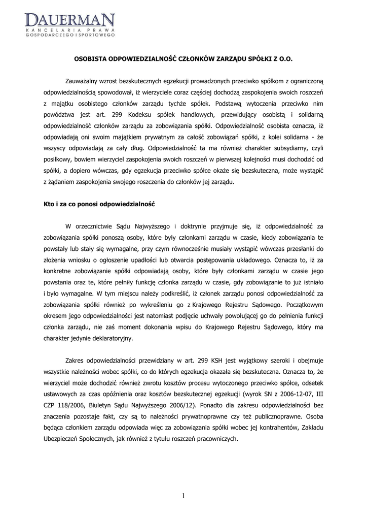 OSOBISTA ODPOWIEDZIALNOŚĆ CZŁONKÓW ZARZĄDU SPÓŁKI Z O.O. Zauważalny wzrost bezskutecznych egzekucji prowadzonych przeciwko spółkom z ograniczoną odpowiedzialnością spowodował, iż wierzyciele coraz częściej dochodzą zaspokojenia swoich roszczeń z majątku osobistego członków zarządu tychże spółek. Podstawą wytoczenia przeciwko nim powództwa jest art. 299 Kodeksu spółek handlowych, przewidujący osobistą i solidarną odpowiedzialność członków zarządu za zobowiązania spółki. Odpowiedzialność osobista oznacza, iż odpowiadają oni swoim majątkiem prywatnym za całość zobowiązań spółki, z kolei solidarna - że wszyscy odpowiadają za cały dług. Odpowiedzialność ta ma również charakter subsydiarny, czyli posiłkowy, bowiem wierzyciel zaspokojenia swoich roszczeń w pierwszej kolejności musi dochodzić od spółki, a dopiero wówczas, gdy egzekucja przeciwko spółce okaże się bezskuteczna, może wystąpić z żądaniem zaspokojenia swojego roszczenia do członków jej zarządu. Kto i za co ponosi odpowiedzialność W orzecznictwie Sądu Najwyższego i doktrynie przyjmuje się, iż odpowiedzialność za zobowiązania spółki ponoszą osoby, które były członkami zarządu w czasie, kiedy zobowiązania te powstały lub stały się wymagalne, przy czym równocześnie musiały wystąpić wówczas przesłanki do złożenia wniosku o ogłoszenie upadłości lub otwarcia postępowania układowego. Oznacza to, iż za konkretne zobowiązanie spółki odpowiadają osoby, które były członkami zarządu w czasie jego powstania oraz te, które pełniły funkcję członka zarządu w czasie, gdy zobowiązanie to już istniało i było wymagalne. W tym miejscu należy podkreślić, iż członek zarządu ponosi odpowiedzialność za zobowiązania spółki również po wykreśleniu go z Krajowego Rejestru Sądowego. Początkowym okresem jego odpowiedzialności jest natomiast podjęcie uchwały powołującej go do pełnienia funkcji członka zarządu, nie zaś moment dokonania wpisu do Krajowego Rejestru Sądowego, który ma charakter jedynie deklaratoryjny. Zakres odpowiedzialności przewidziany w art. 299 KSH jest wyjątkowy szeroki i obejmuje wszystkie należności wobec spółki, co do których egzekucja okazała się bezskuteczna. Oznacza to, że wierzyciel może dochodzić również zwrotu kosztów procesu wytoczonego przeciwko spółce, odsetek ustawowych za czas opóźnienia oraz kosztów bezskutecznej egzekucji (wyrok SN z 2006-12-07, III CZP 118/2006, Biuletyn Sądu Najwyższego 2006/12). Ponadto dla zakresu odpowiedzialności bez znaczenia pozostaje fakt, czy są to należności prywatnoprawne czy też publicznoprawne. Osoba będąca członkiem zarządu odpowiada więc za zobowiązania spółki wobec jej kontrahentów, Zakładu Ubezpieczeń Społecznych, jak również z tytułu roszczeń pracowniczych. 1 Przesłanki odpowiedzialności Zgodnie z treścią przepisu art. 299 § 1 KSH „członkowie zarządu spółki odpowiadają solidarnie za zobowiązania spółki, jeżeli egzekucja przeciwko spółce okaże się bezskuteczna”. Z brzmienia powyższego przepisu wynika, iż wierzyciel będzie mógł dochodzić zaspokojenia swoich roszczeń z majątku osobistego członków zarządu tylko wówczas, gdy egzekucja prowadzona przeciwko spółce okaże się bezskuteczna. Pierwszą i podstawową przesłanką odpowiedzialności jest zatem bezskuteczność egzekucji prowadzonej przeciwko spółce. Najprostszym sposobem wykazania przez wierzyciela zaistnienia owej przesłanki jest postanowienie komornika sądowego o umorzeniu postępowania egzekucyjnego. W tym miejscu należy zwrócić uwagę, iż egzekucja prowadzona przeciwko spółce musi odnosić się do całego jej majątku, a nie jedynie do jego części. Prowadzenie egzekucji z jednego tylko przedmiotu majątku (np. nieruchomości) jest wystarczającą przesłanką wyłącznie wówczas, gdy przedmiot ten stanowi jedyny majątek spółki, co również musi zostać udowodnione przez wierzyciela. Nie zawsze jednak wszczynanie egzekucji przeciwko spółce będzie konieczne. W przypadku bowiem, gdy istnieją oczywiste powody do stwierdzenia, iż postępowanie egzekucyjne nie przyniesie oczekiwanego skutku, bezskuteczność egzekucji może być dowodzona również w inny sposób. Z taką sytuacją będziemy mieli do czynienia na przykład, gdy jedynym majątkiem spółki jest nieruchomość obciążona ponad swoją wartość wierzytelnościami korzystającymi z pierwszeństwa zaspokojenia, czy też wykazanie prowadzenia bezskutecznej egzekucji przez innego wierzyciela spółki. Dowodem takim będzie również oddalenie wniosku o ogłoszenie upadłości lub umorzenie postępowania z uwagi na fakt, iż majątek dłużnika nie wystarcza na zaspokojenie kosztów postępowania. Warto w tym miejscu przywołać wyrok Sądu Najwyższego z dnia z 2007-10-02 (II CSK 301/07) zgodnie z którym „Ustalenie przewidzianej w art. 299 § 1 KSH przesłanki bezskuteczności egzekucji może nastąpić na podstawie każdego dowodu wykazującego, że spółka nie ma majątku, który pozwalałby na zaspokojenie jej wierzyciela pozywającego członków zarządu. Również nieprawomocne postanowienie o umorzeniu postępowania upadłościowego pozwala na ustalenie bezskuteczności egzekucji w sytuacji, gdy z postanowienia tego wynika w sposób oczywisty, że wierzyciel nie otrzyma żadnego zaspokojenia swojej należności z powodu całkowitego braku majątku spółki, który mógłby być podzielony między wierzycieli.” Sam fakt prowadzenia przeciwko spółce bezskutecznej egzekucji nie jest jeszcze wystarczającą przesłanką do pociągnięcia członka zarządu do odpowiedzialności. Art. 299 § 2 KSH wskazuje bowiem okoliczności, których zaistnienie powoduje możliwość uchylenia się od odpowiedzialności. Z powyższego wynika, iż przesłankami wystąpienia z powództwem przeciwko członkowi zarządu jest bezskuteczn