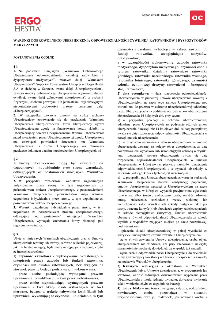 Sopot, dnia 01 kwiecień 2016 r. WARUNKI DOBROWOLNEGO UBEZPIECZENIA ODPOWIEDZIALNOŚCI CYWILNEJ RATOWNIKÓW I DYSPOZYTORÓW MEDYCZNYCH czynności i działania wchodzące w zakres zawodu lub funkcji ratownika, uwzględniając stażystów, POSTANOWIENIA OGÓLNE praktykantów; a w szczególności wykonywanie: zawodu ratownika §1 medycznego, dyspozytora medycznego, czynności osób z 1. Na podstawie niniejszych „Warunków Dobrowolnego tytułem ratownika, działania ratownicze ratownika Ubezpieczenia odpowiedzialności cywilnej ratowników i górskiego, ratownika narciarskiego, ratownika wodnego, dyspozytorów medycznych”, zwanych dalej „Warunkami ratownika lotniczego, ratownika górniczego, czynności Ubezpieczenia”, Sopockie Towarzystwo Ubezpieczeń Ergo Hestia członka ochotniczej drużyny ratowniczej i brzegowej S.A. z siedzibą w Sopocie, zwane dalej „Ubezpieczycielem”, stacji ratowniczej; zawiera umowy dobrowolnego ubezpieczenia odpowiedzialności 2) data początkowa – data rozpoczęcia odpowiedzialności cywilnej, zwane dalej „Umowami ubezpieczenia”, z osobami Ubezpieczyciela w pierwszej umowie ubezpieczenia zawartej z fizycznymi, osobami prawnymi lub jednostkami organizacyjnymi Ubezpieczycielem na rzecz tego samego Ubezpieczonego pod nieposiadającymi osobowości prawnej, zwanymi dalej warunkiem, że przerwa w ochronie ubezpieczeniowej udzielanej „Ubezpieczającymi”. przez Ubezpieczyciela na podstawie różnych umów ubezpieczenia 2. W przypadku zawarcia umowy na cudzy rachunek nie przekroczyła 14 kolejnych dni, przy czym: Ubezpieczający zobowiązuje się do przekazania Warunków a) w przypadku przerwy w ochronie ubezpieczeniowej Ubezpieczenia Ubezpieczonemu. Jeżeli Ubezpieczony wyraża udzielanej przez Ubezpieczyciela na podstawie różnych umów Ubezpieczającemu zgodę na finansowanie kosztu składki, to ubezpieczenia dłuższej, niż 14 kolejnych dni, za datę początkową Ubezpieczający doręcza Ubezpieczonemu Warunki Ubezpieczenia uważa się datę rozpoczęcia odpowiedzialności Ubezpieczyciela w przed wyrażeniem przez Ubezpieczonego tej zgody. Ubezpieczony nowej umowie ubezpieczenia; ma obowiązek potwierdzić doręczenie mu Warunków b) w przypadku rozszerzenia zakresu ubezpieczenia w umowie Ubezpieczenia na piśmie. Ubezpieczający ma obowiązek ubezpieczenia zawartej na kolejny okres ubezpieczenia, za datę przekazać dokument z takim potwierdzeniem Ubezpieczycielowi początkową dla wypadków lub szkód objętych ochroną w wyniku tego rozszerzenia zakresu ubezpieczenia uważa się datę §2 rozpoczęcia odpowiedzialności Ubezpieczyciela w umowie 1. Umowy ubezpieczenia mogą być zawierane na ubezpieczenia, w której po raz pierwszy nastąpiło rozszerzenie uzgodnionych indywidualnie przez strony warunkach, odpowiedzialności Ubezpieczyciela o te wypadki lub szkody, w odbiegających od postanowień niniejszych Warunków zależności od tego, która z tych dat jest wcześniejsza; Ubezpieczenia. c) w przypadku gdy Umowa ubezpieczenia zawarta na podstawie 2. W przypadku rozbieżności warunków uzgodnionych Warunków ubezpieczenia stanowi kontynuację poprzedniej indywidualnie przez strony, w tym uzgodnionych za umowy ubezpieczenia zawartej z Ubezpieczycielem na rzecz pośrednictwem brokera ubezpieczeniowego, z postanowieniami Ubezpieczonego, w której za wypadek przyjmowano zgłoszenie Warunków ubezpieczenia, pierwszeństwo mają warunki roszczenia, albo śmierć, uszkodzenie ciała, rozstrój zdrowia, uzgodnione indywidualnie przez strony, w tym uzgodnione za utratę, zniszczenie, uszkodzenie rzeczy ruchomej lub pośrednictwem brokera ubezpieczeniowego. nieruchomości (albo wszelkie ich szkody następcze takie jak 3. Warunki uzgodnione indywidualnie przez strony, w tym straty, utracone korzyści) lub obowiązek zapłaty zadośćuczynienia uzgodnione za pośrednictwem brokera ubezpieczeniowego, za szkodę niemajątkową (krzywdę), Umowa ubezpieczenia odbiegające od postanowień niniejszych Warunków obejmuje również odpowiedzialność Ubezpieczyciela za szkody Ubezpieczenia, wymagają zachowania formy pisemnej, pod wynikłe z wypadków mających miejsce po dacie początkowej, rygorem nieważności. pod warunkiem: - opłacenia składki ubezpieczeniowej w pełnej wysokości za §3 wszystkie umowy ubezpieczenia zawarte z Ubezpieczycielem, Użyte w niniejszych Warunkach ubezpieczenia oraz w Umowie - że w chwili zawierania Umowy ubezpieczenia, osoba objęta ubezpieczenia terminy lub zwroty, zarówno w liczbie pojedynczej, ubezpieczeniem nie wiedziała, ani przy zachowaniu należytej jak i w liczbie mnogiej, będą miały następujące znaczenie, chyba staranności nie mogła się dowiedzieć, że wypadek już zaszedł, że inaczej zastrzeżono: - ograniczenia odpowiedzialności Ubezpieczyciela do wysokości 1) czynność zawodowa - wykonywanie określonego w sumy gwarancyjnej określonej w Umowie ubezpieczenia zawartej przepisach prawa zawodu lub funkcji ratownika, na podstawie Warunków ubezpieczenia; czynności lub działań ratowniczych, bez względu na 3) franszyza redukcyjna - określona w Warunkach stosunek prawny będący podstawą ich wykonywania: Ubezpieczenia lub w Umowie ubezpieczenia, w procentach lub - przez osobę posiadającą wymagane prawem kwotowo, wartość redukująca odszkodowanie wypłacane przez uprawnienia i kwalifikacje, w tym przez wolontariusza, Ubezpieczyciela z tytułu jednego wypadku, dotyczące wyłącznie - przez osobę nieposiadającą wymaganych prawem szkód w mieniu, chyba że uzgodniono inaczej; uprawnień i kwalifikacji osób wskazanych w tiret 4) osoba bliska – małżonek, wstępny, zstępny, rodzeństwo, pierwsze, będącą w trakcie nabywania kwalifikacji lub powinowaty, osoba pozostająca w stosunku uprawnień wykonującą te czynności lub działania, w tym przysposobienia oraz jej małżonek, jak również osoba z Sopot, dnia 01 kwiecień 2016 r. którą Ubezpieczony pozostaje we wspólnym pożyciu; 