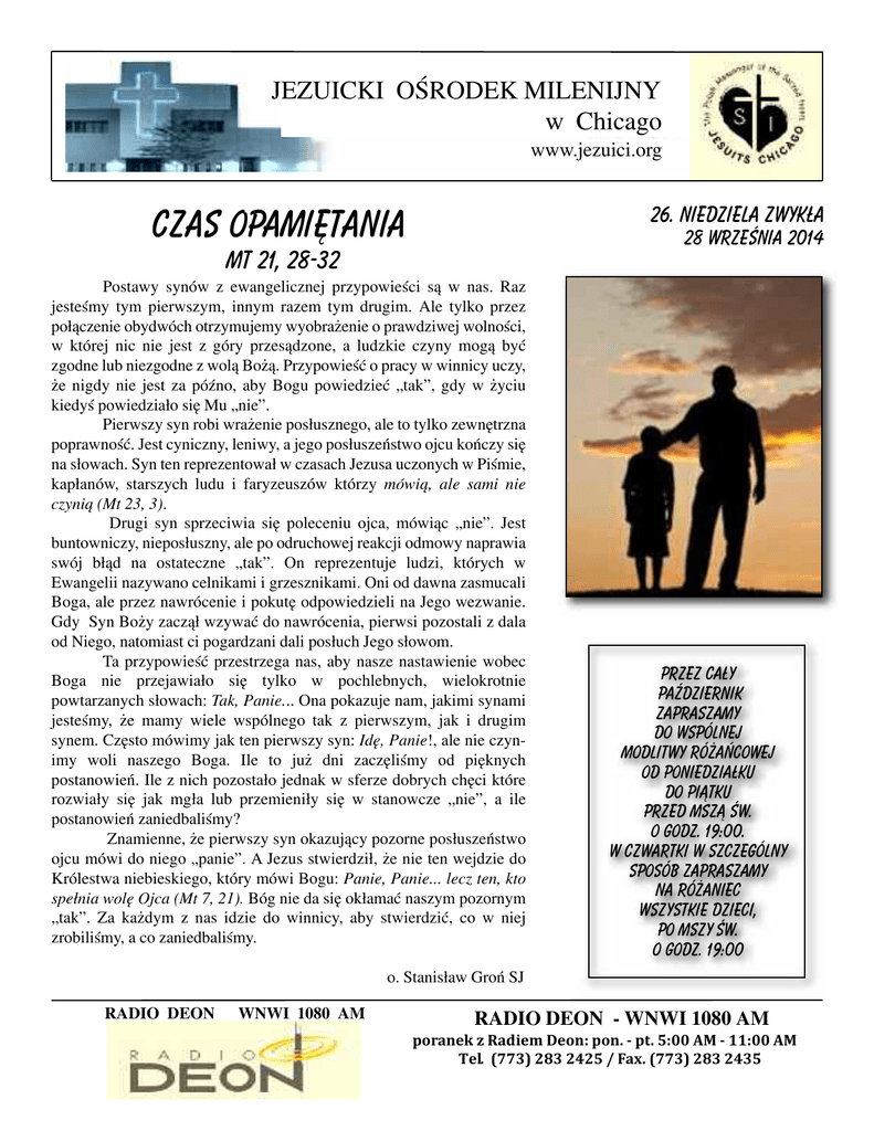 JEZUICKI OŚRODEK MILENIJNY w Chicago www.jezuici.org 26. Niedziela zwykła czas opamiętania 28 września 2014 Mt 21, 28-32 Postawy synów z ewangelicznej przypowieści są w nas. Raz jesteśmy tym pierwszym, innym razem tym drugim. Ale tylko przez połączenie obydwóch otrzymujemy wyobrażenie o prawdziwej wolności, w której nic nie jest z góry przesądzone, a ludzkie czyny mogą być zgodne lub niezgodne z wolą Bożą. Przypowieść o pracy w winnicy uczy, że nigdy nie jest za późno, aby Bogu powiedzieć „tak”, gdy w życiu kiedyś powiedziało się Mu „nie”. Pierwszy syn robi wrażenie posłusznego, ale to tylko zewnętrzna poprawność. Jest cyniczny, leniwy, a jego posłuszeństwo ojcu kończy się na słowach. Syn ten reprezentował w czasach Jezusa uczonych w Piśmie, kapłanów, starszych ludu i faryzeuszów którzy mówią, ale sami nie czynią (Mt 23, 3). Drugi syn sprzeciwia się poleceniu ojca, mówiąc „nie”. Jest buntowniczy, nieposłuszny, ale po odruchowej reakcji odmowy naprawia swój błąd na ostateczne „tak”. On reprezentuje ludzi, których w Ewangelii nazywano celnikami i grzesznikami. Oni od dawna zasmucali Boga, ale przez nawrócenie i pokutę odpowiedzieli na Jego wezwanie. Gdy Syn Boży zaczął wzywać do nawrócenia, pierwsi pozostali z dala od Niego, natomiast ci pogardzani dali posłuch Jego słowom. Ta przypowieść przestrzega nas, aby nasze nastawienie wobec Boga nie przejawiało się tylko w pochlebnych, wielokrotnie powtarzanych słowach: Tak, Panie... Ona pokazuje nam, jakimi synami jesteśmy, że mamy wiele wspólnego tak z pierwszym, jak i drugim synem. Często mówimy jak ten pierwszy syn: Idę, Panie!, ale nie czynimy woli naszego Boga. Ile to już dni zaczęliśmy od pięknych postanowień. Ile z nich pozostało jednak w sferze dobrych chęci które rozwiały się jak mgła lub przemieniły się w stanowcze „nie”, a ile postanowień zaniedbaliśmy? Znamienne, że pierwszy syn okazujący pozorne posłuszeństwo ojcu mówi do niego „panie”. A Jezus stwierdził, że nie ten wejdzie do Królestwa niebieskiego, który mówi Bogu: Panie, Panie... lecz ten, kto spełnia wolę Ojca (Mt 7, 21). Bóg nie da się okłamać naszym pozornym „tak”. Za każdym z nas idzie do winnicy, aby stwierdzić, co w niej zrobiliśmy, a co zaniedbaliśmy. Przez cały październik zapraszamy do wspólnej modlitwy różańcowej od poniedziałku do piątku przed Mszą św. o godz. 19:00. W czwartki w szczególny sposób zapraszamy na różaniec wszystkie dzieci, Po MSZY ŚW. o godz. 19:00 o. Stanisław Groń SJ RADIO DEON WNWI 1080 AM RADIO DEON - WNWI 1080 AM poranek z Radiem Deon: pon. - pt. 5:00 AM - 11:00 AM Tel. (773) 283 2425 / Fax. (773) 283 2435 PORZĄDEK MSZY ŚWIĘTYCH Poniedziałek - pi¹tek: 8:00, 18:00, 19:00 (radiowa: WCEV 1450) I piątek miesiąca: 8:00, 19:00, 20:30 Środa: 19:00 - nowenna do Matki Bożej Nieustającej Pomocy Sobota: 8:00 i 19:00 , tylko w I sobotę miesiąca o 17:00 dla chorych, Niedziela: 8:00 (radiowa), 9:30, 11:00, 13:00, 19:00, 20:30 -=- SpowiedŸ św.: od poniedziałku do soboty - 7:30 i 18:30, w niedzielę - pó³ godziny przed ka¿d¹ Msz¹ Œwiêt¹, w1. pi¹tek miesi¹ca - od 18:30 do 21:00 Adoracja Najświętszego Sakramentu - od poniedziałku do czwartku - od 18:30 do 19:00 sobota - od 18:00 do 19:00 Sanktuarium Najświętszego Serca Pana Jezusa Jezuicki Ośrodek Milenijny 5835 W. Irving Park Rd.; Chicago, IL 60634, Tel. 773 777 7000; fax 773 427 0126 www.jezuici.org e-mail: [email protected] Audycje Radia DEON: tel. 773 283 2425 Fax. 773 283 2435 www. radiodeon.com e-mail: [email protected] Biuro czynne: od poniedziałku do soboty: 8:30 - 9:00, 15:30 - 20:30 niedziela: 8:30 - 15:00 Biblioteka czynna: sobota: 18:00 - 19:00; niedziela: 10:30 - 14:30; Kawiarenka czynna: niedz.: 10:00 - 15:00 Sacred Heart Mission House 4105 N. Avers Ave., Chicago, IL 60618 Tel. 773 588 74 76; fax 773 588 65 17 Rektor Sanktuarium i Przełożony Jezuitów o. Jerzy Sermak, SJ (773-588-7476 - ext. 224) o. Józef Birecki, SJ (773-777-7000 - ext. 121) o. Jerzy Mordarski, SJ (773-588-7476 - ext. 234) o. Jerzy Karpiński, SJ (773-588-7476 - ext. 237) o. Piotr Kochanowicz, SJ (773-588-7476 - ext. 227) br. Adam Poręba, SJ (773-777-7000 - ext. 122) Wszelkie ofiary i donacje prosimy kierowaæ na adres Sanktuarium. Donacje s¹ wolne od podatku i mo¿na je odpisywaæ przy rozliczeniu z IRS. TRANSMISJE RADIOWE I INTERNETOWE od poniedziałku do piątku,transmisja Mszy Św. z godz. 19:00 Radio WCEV 1450 (www.wcev1450.com) Niedziela 9:30 www.RadioSiedeM.net w niedziele: godz 8-9, Radio WCEV 1450, oraz Polskie Radio Chicago 1030 WNVR (www.polskieradio.com) Codziennie przez całą dobę: Kamera internetowa z Sanktuarium (obraz i dźwięk; używać Internet Explorer): www.jezuici.org - link „Transmisje na żywo” – wpisać jako użytkownik i hasło: 5835 INTENCJE MSZY ŚWIĘTYCH Niedziela, 28 IX 2014 8:00 + Maria Twaróg w 7. rocznicę śmierci + Władysław Twaróg 9:30 Zbiorowa 11:00 + + Józef, Stefania, Henryk, Bogusław, Małgorzata Polak i Przemysław Bisewski 13:00 + Tadeusz Dubiel 19:00 Zbiorowa 20:30 + + rodzice Franciszek i Janina Cegielscy, + Stanisława Gazda Poniedziałek, 29 IX - Świętych Archaniołów: Michała, Gabriela i Rafała 8:00 o Boże błogosławieństwo i potrzebne łaski dla dzieci w czasie nauki szkolnej 18:00 + Czesław Stemplewski w 3. miesiące po śmierci 19:00 Zbiorowa Wtorek, 30 IX - św. Hieronima 8:00 intencja dziękczynna za wszystkich nauczycieli 18:00 o opiekę Matki Najświętszej nad Mikołajkiem 19:00 Zbiorowa Środa, 1 X - św. Teresy od Dzieciątka Jezus 8:00 za Dobroczyńców Jezuickiego Ośrodka Milenijnego 18:00 + + Eugeniusz i Irena Nieroda 19:00 Zbiorowa I Czwartek, 2 X - wspomnienie świętych Aniołów Stróżów 8:00 + Christhoper 18:00 + Wacław Siłka w 3. rocznicę śmierci 19:00 Zbiorowa I Piątek, 3 X - św. Franciszka Borgiasza 8:00 + + Walerian i Irena Kwiatkowscy w 1. roc