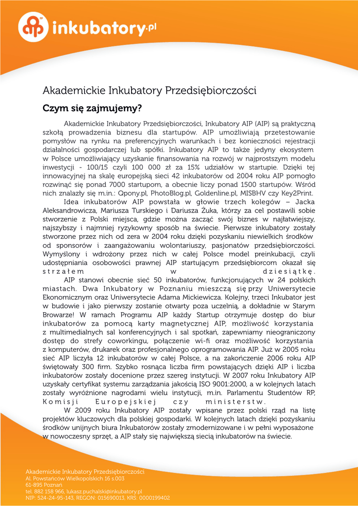 Akademickie Inkubatory Przedsiębiorczości Czym się zajmujemy? Akademickie Inkubatory Przedsiębiorczości, Inkubatory AIP (AIP) są praktyczną szkołą prowadzenia biznesu dla startupów. AIP umożliwiają przetestowanie pomysłów na rynku na preferencyjnych warunkach i bez konieczności rejestracji działalności gospodarczej lub spółki. Inkubatory AIP to także jedyny ekosystem w Polsce umożliwiający uzyskanie finansowania na rozwój w najprostszym modelu inwestycji - 100/15 czyli 100 000 zł za 15% udziałów w startupie. Dzięki tej innowacyjnej na skalę europejską sieci 42 inkubatorów od 2004 roku AIP pomogło rozwinąć się ponad 7000 startupom, a obecnie liczy ponad 1500 startupów. Wśród nich znalazły się m.in.: Qpony.pl, PhotoBlog.pl, Goldenline.pl, MISBHV czy Key2Print. Idea inkubatorów AIP powstała w głowie trzech kolegów – Jacka Aleksandrowicza, Mariusza Turskiego i Dariusza Żuka, którzy za cel postawili sobie stworzenie z Polski miejsca, gdzie można zacząć swój biznes w najłatwiejszy, najszybszy i najmniej ryzykowny sposób na świecie. Pierwsze inkubatory zostały stworzone przez nich od zera w 2004 roku dzięki pozyskaniu niewielkich środków od sponsorów i zaangażowaniu wolontariuszy, pasjonatów przedsiębiorczości. Wymyślony i wdrożony przez nich w całej Polsce model preinkubacji, czyli udostępniania osobowości prawnej AIP startującym przedsiębiorcom okazał się strzałem w dziesiątkę. AIP stanowi obecnie sieć 50 inkubatorów, funkcjonujących w 24 polskich miastach. Dwa Inkubatory w Poznaniu mieszczą się przy Uniwersytecie Ekonomicznym oraz Uniwersytecie Adama Mickiewicza. Kolejny, trzeci Inkubator jest w budowie i jako pierwszy zostanie otwarty poza uczelnią, a dokładnie w Starym Browarze! W ramach Programu AIP każdy Startup otrzymuje dostęp do biur inkubatorów za pomocą karty magnetycznej AIP, możliwość korzystania z multimedialnych sal konferencyjnych i sal spotkań, zapewniamy nieograniczony dostęp do strefy coworkingu, połączenie wi-fi oraz możliwość korzystania z komputerów, drukarek oraz profesjonalnego oprogramowania AIP. Już w 2005 roku sieć AIP liczyła 12 inkubatorów w całej Polsce, a na zakończenie 2006 roku AIP świętowały 300 firm. Szybko rosnąca liczba firm powstających dzięki AIP i liczba inkubatorów zostały docenione przez szereg instytucji. W 2007 roku Inkubatory AIP uzyskały certyfikat systemu zarządzania jakością ISO 9001:2000, a w kolejnych latach zostały wyróżnione nagrodami wielu instytucji, m.in. Parlamentu Studentów RP, Komisji Europejskiej czy ministerstw. W 2009 roku Inkubatory AIP zostały wpisane przez polski rząd na listę projektów kluczowych dla polskiej gospodarki. W kolejnych latach dzięki pozyskaniu środków unijnych biura Inkubatorów zostały zmodernizowane i w pełni wyposażone w nowoczesny sprzęt, a AIP stały się największą siecią inkubatorów na świecie. Akademickie Inkubatory Przedsiębiorczości Al. Powstańców Wielkopolskich 16 s.003 61-895 Poznań tel. 882 158 966, [email protected] NIP: 524-24-95-143, REGON: 015690013, KRS: 0000199402 AIP w liczbach: 1 - tak duża sieć inkubatorów przedsiębiorczości na świecie 10 - lat inkubatory AIP wspierają w Polsce startup 15 - minut wystarczy by założyć startup w inkubatorze AIP 52 - inkubatory AIP funkcjonują w Polsce 80 - startupów otrzymało od AIP inwestycje 100 000 zł 107 - osób pracuje w inkubatorach AIP 112 - mentorów wspiera na stałe startupy w inkubatorach AIP 800 - treningów oraz szkoleń odbywa się rocznie dla startupów w AIP 2022 - startupów obecnie funckjonuje w inkubatorach AIP 7 500 - startupów powstało do tej pory dzięki wspariu inkubatorów AIP 120 000 - faktur wystawiają rocznie startupy w inkubatorach AIP 60 000 000 - przychodu rocznie generują startupy w inkubatorach AIP Główne wyróżnienia dla AIP: - Dwukrotnie najlepsza Inicjatywa dla Studentów przyznana przez Parlament Studentów RP - Europejska Nagroda Przedsiębiorczości 2007 przyznana przez Komisję Europejską - Odznaczenie Ministra Gospodarki za innowacyjność w promowaniu przedsiębiorczości - Tytuł Najbardziej Innowacyjnej Instytucji Otoczenia Biznesu przyznany przez Ministerstwo Rozwoju Regionalnego - Nagroda Regiostars 2013 przyznana przez Komisję Europejską - AIP wpisane przez Rząd Polski na listę projektów kluczowych dla polskiej gospodarki - certyfikat jakości ISO 9001:2000 potwierdzający jakość świadczonych przez AIP usług. Akademickie Inkubatory Przedsiębiorczości Al. Powstańców Wielkopolskich 16 s.003 61-895 Poznań tel. 882 158 966, [email protected] NIP: 524-24-95-143, REGON: 015690013, KRS: 0000199402 Co dają Inkubatory AIP? Ekosystem AIP to zestaw najlepszych na świecie narzędzi do przetestowania swojego pomysłu na biznes. Wchodząc do Ekosystemu AIP możesz wystartować ze swoim biznesem na zasadzie startupa AIP jako pełnoprawny przedsiębiorca na rynku, otrzymując możliwość wystawiania faktur bez konieczności rejestracji działalności gospodarczej czy spółki. W ramach Ekosystemu AIP otrzymasz ponadto wsparcie, dzięki któremu Twój startup będzie mógł rozwijać się dynamicznie. Firma Startup – Przetestuj pomysł na biznes w najprostszy, najbardziej mobilny i najmniej ryzykowny sposób rozpoczynając swoją działalność biznesową na zasadzie startupa AIP bez konieczności rejestracji działalności gospodarczej czy spółki! • osobowość prawna AIP umożliwiamy prowadzenie biznesu na zasadzie startupu AIP jako pełnoprawny przedsiębiorca na rynku, co pozwala Ci wystawiać faktury bez konieczności rejestracji działalności gospodarczej czy spółki • dobrowolny ZUS obniżyć koszty prowadzenia startupu • księgowość prowadzimy księgowość startupu • obsługa prawna zapewniamy wsparcie prawne dla startupu • usługi online umożliwiamy prowadzenie startupu przez internet poprzez dostęp do systemu faktur, panelu praw