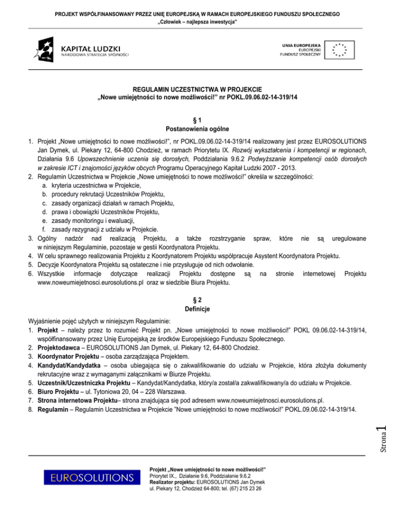 PROJEKT WSPÓŁFINANSOWANY PRZEZ UNIĘ EUROPEJSKĄ W RAMACH EUROPEJSKIEGO FUNDUSZU SPOŁECZNEGO „Człowiek – najlepsza inwestycja” REGULAMIN UCZESTNICTWA W PROJEKCIE „Nowe umiejętności to nowe możliwości!” nr POKL.09.06.02-14-319/14 §1 Postanowienia ogólne 1. Projekt „Nowe umiejętności to nowe możliwości!”, nr POKL.09.06.02-14-319/14 realizowany jest przez EUROSOLUTIONS Jan Dymek, ul. Piekary 12, 64-800 Chodzież, w ramach Priorytetu IX. Rozwój wykształcenia i kompetencji w regionach, Działania 9.6 Upowszechnienie uczenia się dorosłych, Poddziałania 9.6.2 Podwyższanie kompetencji osób dorosłych w zakresie ICT i znajomości języków obcych Programu Operacyjnego Kapitał Ludzki 2007 - 2013. 2. Regulamin Uczestnictwa w Projekcie „Nowe umiejętności to nowe możliwości!” określa w szczególności: a. kryteria uczestnictwa w Projekcie, b. procedury rekrutacji Uczestników Projektu, c. zasady organizacji działań w ramach Projektu, d. prawa i obowiązki Uczestników Projektu, e. zasady monitoringu i ewaluacji, f. zasady rezygnacji z udziału w Projekcie. 3. Ogólny nadzór nad realizacją Projektu, a także rozstrzyganie spraw, które nie są uregulowane w niniejszym Regulaminie, pozostaje w gestii Koordynatora Projektu. 4. W celu sprawnego realizowania Projektu z Koordynatorem Projektu współpracuje Asystent Koordynatora Projektu. 5. Decyzje Koordynatora Projektu są ostateczne i nie przysługuje od nich odwołanie. 6. Wszystkie informacje dotyczące realizacji Projektu dostępne są na stronie internetowej Projektu www.noweumiejetnosci.eurosolutions.pl oraz w siedzibie Biura Projektu. §2 Definicje Strona 1 Wyjaśnienie pojęć użytych w niniejszym Regulaminie: 1. Projekt – należy przez to rozumieć Projekt pn. „Nowe umiejętności to nowe możliwości!” POKL 09.06.02-14-319/14, współfinansowany przez Unię Europejską ze środków Europejskiego Funduszu Społecznego. 2. Projektodawca – EUROSOLUTIONS Jan Dymek, ul. Piekary 12, 64-800 Chodzież. 3. Koordynator Projektu – osoba zarządzająca Projektem. 4. Kandydat/Kandydatka – osoba ubiegająca się o zakwalifikowanie do udziału w Projekcie, która złożyła dokumenty rekrutacyjne wraz z wymaganymi załącznikami w Biurze Projektu. 5. Uczestnik/Uczestniczka Projektu – Kandydat/Kandydatka, który/a został/a zakwalifikowany/a do udziału w Projekcie. 6. Biuro Projektu – ul. Tytoniowa 20, 04 – 228 Warszawa. 7. Strona internetowa Projektu– strona znajdująca się pod adresem www.noweumiejetnosci.eurosolutions.pl. 8. Regulamin – Regulamin Uczestnictwa w Projekcie ”Nowe umiejętności to nowe możliwości!” POKL.09.06.02-14-319/14. Projekt „Nowe umiejętności to nowe możliwości!” Priorytet IX., Działanie 9.6, Poddziałanie 9.6.2 Realizator projektu: EUROSOLUTIONS Jan Dymek ul. Piekary 12, Chodzież 64-800; tel. (67) 215 23 26 PROJEKT WSPÓŁFINANSOWANY PRZEZ UNIĘ EUROPEJSKĄ W RAMACH EUROPEJSKIEGO FUNDUSZU SPOŁECZNEGO „Człowiek – najlepsza inwestycja” §3 Główne założenia 1. Projekt jest realizowany od dnia 01.08.2014 r. do dnia 30.06.2015 r. na terenie miasta stołecznego Warszawy. 2. Celem głównym Projektu jest wzrost konkurencyjności na rynku pracy 168 osób bezrobotnych w wieku 18 – 64 lata: z wykształceniem, co najwyżej średnim (101 osób) oraz do 30 roku życia (67 osób) z Warszawy, poprzez wzrost ich kompetencji językowych do 30.06.2015 r. 3. Wsparcie oferowane w ramach Projektu jest bezpłatne. Projektodawca pokrywa koszty wynajmu sal szkoleniowych, wynagrodzenia lektorów, materiałów dydaktycznych, przeprowadzenia egzaminów i wydania certyfikatów. §4 Zakres wsparcia 1. Projekt obejmuje następujące wsparcie: a. Kurs języka angielskiego zakończony zewnętrznym egzaminem TELC. Wsparcie przewidziane jest dla 72 Uczestników Projektu: Zajęcia odbywać się będą w Warszawie. Łączna liczba grup oraz godzin to: 6 grup x 180 godzin = 1080 godzin (1 godzina = 45 minut). Szkolenie może odbywać się na różnych poziomach zaawansowania, tj. A1+A2, A2, B1+B2, B2. Każda grupa szkoleniowa odbędzie 180 godzin kursu językowego (60 dni x 3 godziny/dzień). Po zakończonych zajęciach każdy Uczestnik Projektu przystąpi do egzaminu TELC oraz w przypadku jego zdania otrzyma certyfikat. Projekt „Nowe umiejętności to nowe możliwości!” Priorytet IX., Działanie 9.6, Poddziałanie 9.6.2 Realizator projektu: EUROSOLUTIONS Jan Dymek ul. Piekary 12, Chodzież 64-800; tel. (67) 215 23 26 Strona c. Kurs języka niszowego (włoskiego lub szwedzkiego) zakończony zewnętrznym egzaminem TELC/SWEDEX. Wsparcie przewidziane jest dla 48 Uczestników Projektu: Zajęcia odbywać się będą w Warszawie. Łączna liczba godzin to: 4 grupy x 180 godzin = 720 godzin (1 godzina = 45 minut).. Szkolenie odbywać się będzie na różnych poziomach zaawansowania, tj. A1+A2. Każda grupa szkoleniowa odbędzie 180 godzin kursu językowego. Po zakończonych zajęciach każdy Uczestnik Projektu przystąpi do egzaminu TELC oraz w przypadku jego zdania otrzyma certyfikat. W każdej z edycji zostaną utworzone dwie grupy z jednego języka lub po jednej grupie z obu języków. 2 b. Kurs języka niemieckiego zakończony zewnętrznym egzaminem TELC. Wsparcie przewidziane jest dla 48 Uczestników Projektu: Zajęcia odbywać się będą w Warszawie. Łączna liczba godzin to: 4 grupy x 180 godzin = 720 godzin (1 godzina = 45 minut). Szkolenie może odbywać się na różnych poziomach zaawansowania, tj. A1+A2, A2, B1+B2, B2. Każda grupa szkoleniowa odbędzie 180 godzin kursu językowego. Po zakończonych zajęciach każdy Uczestnik Projektu przystąpi do egzaminu TELC oraz w przypadku jego zdania, otrzyma certyfikat. PROJEKT WSPÓŁFINANSOWANY PRZEZ UNIĘ EUROPEJSKĄ W RAMACH EUROPEJSKIEGO FUNDUSZU SPOŁECZNEGO „Człowiek – najlepsza inwestycja” §5 Procedury rekrutacji i warunki uczestnictwa w Projekcie 4. Warunki uczestnictwa w Projekcie: O przyjęciu de
