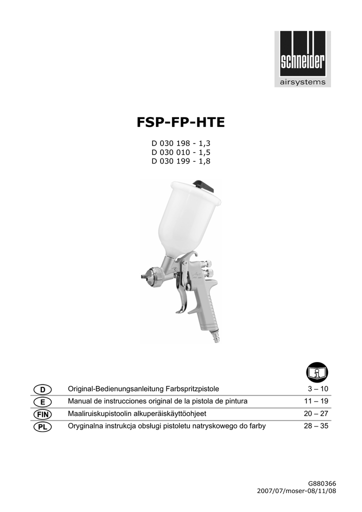 FSP-FP-HTE D 030 198 - 1,3 D 030 010 - 1,5 D 030 199 - 1,8 Original-Bedienungsanleitung Farbspritzpistole 3 – 10 Manual de instrucciones original de la pistola de pintura 11 – 19 Maaliruiskupistoolin alkuperäiskäyttöohjeet 20 – 27 Oryginalna instrukcja obsługi pistoletu natryskowego do farby 28 – 35 G880366 2007/07/moser-08/11/08 1a 1b 2a 2b 3a 3b 3c 2 FP-HTE DEUTSCH Inhalt 1. 2. 3. 4. 5. 6. 7. 8. 9. Allgemeine Hinweise ............................3 Lieferumfang.........................................3 Mitgeltende Dokumente........................3 Bestimmungsgemäße Verwendung......3 Symbole................................................4 Technische Daten.................................4 Sicherheitshinweise ..............................5 Aufbau ..................................................6 Inbetriebnahme.....................................6 9.1 Vor erster Inbetriebnahme ............6 9.2 Inbetriebnahme.............................6 9.3 Druckluftanschluss........................7 9.4 Betrieb ..........................................7 9.5 Nach dem Einsatz.........................7 9.6 Düsenwechsel ..............................7 10. Wartung ................................................7 10.1 Vor Wartungstätigkeiten ...............7 11. Außerbetriebnahme ..............................8 11.1 Lagerung ......................................8 11.2 Entsorgung ...................................8 12. Zubehör ................................................8 13. Störungsbehebung ...............................8 14. Gewährleistungsbedingungen ............10 15. Konformitätserklärung.........................10 1. Allgemeine Hinweise Prüfungen, Einstellungen und Wartungsarbeiten sollten immer von der gleichen Person oder deren Stellvertreter durchgeführt und in einem Wartungsbuch dokumentiert werden. Bei Fragen bitten wir Sie, die Artikelnummer und Bezeichnung des Gerätes anzugeben. Beachten Sie die Sicherheitshinweise! Bedienungsanleitung lesen! Der Betreiber (Besitzer / Verantwortliche) ist verpflichtet die Bedienungsanleitung zu beachten und alle Anwender dieses Gerätes gemäß der Bedienungsanleitung zu unterweisen. Die Unterweisung ist jährlich zu wiederholen. 2. • • • 3. • • 4. Lieferumfang Farbspritzpistole Garantiekarte Bedienungsanleitung Mitgeltende Dokumente Ersatzteilliste EG-Konformitätserklärung Bestimmungsgemäße Verwendung Die Farbspritzpistole Typ FP-HTE ist ein handliches, druckluftbetriebenes Gerät für den handwerklichen Einsatz. Sie eignet sich besonders zum Lackieren von großen Flächen. Jede andere Verwendung ist mit dem Hersteller abzustimmen. Wird das Gerät außerhalb von Deutschland betrieben, können andere gesetzliche Vorschriften für den Betrieb des Gerätes vorgeschrieben sein, als sie in dieser Bedienungsanleitung beschrieben sind. FP-HTE Deutsch 3 5. Symbole Achtung: Schenken Sie diesen Symbolen höchste Aufmerksamkeit! Symbol Signalwort GEFAHR WARNUNG VORSICHT HINWEIS Gefahrenstufe unmittelbar drohende Gefahr mögliche drohende Gefahr mögliche gefährliche Situation mögliche gefährliche Situation Folgen bei Nichtbeachtung Tod, schwere Körperverletzung Tod, schwere Körperverletzung Leichte Körperverletzung Sachschaden Sicherheitshinweise Symbol Bedeutung Bedienungsanleitung lesen! Symbol Bedeutung Folgen bei Nichtbeachtung Körperverletzung oder Tod des Bedieners Sachschaden am Gerät falsche Bedienung des Gerätes Symbol Atemschutz verwenden! Bedeutung Schutzhandschuhe tragen! Schutzbrille tragen! 6. Technische Daten Luftverbrauch Maximal zulässiger Arbeitsdruck (Fließdruck) Arbeitsdruck (Fließdruck) Düsendurchmesser Fließbecherinhalt Auftragswirkungsgrad Strahleinstellung Schalldruckpegel LPA 1 m (in 1 m Abstand) nach DIN 45 635, Teil 20 Empfohlener Schlauchdurchmesser (innen) bei L= 10 m Abmessungen: Breite x Tiefe x Höhe Gewicht Benötigte Luftqualität Mindestleistungsgröße des Kompressors 130 - 200 2 1-2 1,3 / 1,5 / 1,8 0,6 ≤ 93,8 rund oder breit 77,6 9 170 x 105 x 335 0,54 l/min bar bar mm l % dB(A) mm mm kg Gereinigt, kondensat- und ölfrei 200 l/min Füllleistung, 2,0 kW Motorleistung, 50 l Behältergröße Technische Änderungen vorbehalten. Abbildungen können vom Original abweichen. Stand: März 2007 4 Deutsch FP-HTE 7. Sicherheitshinweise • GEFAHR Gefahr schwerer Verletzung! Peitschender Druckluftschlauch beim Öffnen der Schnellkupplung. Æ Druckluftschlauch festhalten. • GEFAHR Gefahr schwerer Verletzung! Æ Bei Wartungs-, Reparaturarbeiten und beim Nachfüllen von Material gilt: Gerät vom Druckluftanschluss trennen, Gerät drucklos. • WARNUNG Gefahr schwerer Verletzung! Vernebelung von Farben und Ausdünsten von Lösungsmitteln während des Betriebes möglich. Æ Den Vorschriften entsprechend ist beim Lackieren der entsprechende Arbeits- und Atemschutz zu verwenden! WARNUNG Explosionsgefahr! Lebensgefahr! Æ Gerät nicht in explosionsgefährdeten Bereichen der Zone 0 oder 20 einsetzen! Æ Maximal zulässigen Druck beachten! • • • • • • • VORSICHT Gefahr Verletzung! Stolperfalle! Druckluftschläuche, die über den Boden geführt werden. Æ Vermeiden bzw. beachten. • • • • Schützen Sie sich, andere Personen, Sachgegenstände und ihre Umwelt durch die jeweils notwendige Schutzmaßnahmen oder Vorkehrungen um Gesundheits-, Sach-, Wert- oder Umweltschäden sowie Unfallgefahren zu vermeiden. FP-HTE • Tragen Sie beim Arbeiten mit der Farbspritzpistole die erforderliche Schutzkleidung: insbesondere eine Atemschutzmaske, Schutzbrille und Arbeitshandschuhe. Bei höherem Arbeitsdruck kann der Schalldruckpegel 80 dB(A) überschreiten. Gehörschutz tragen. Farben, Lacke und Reinigungsmittel nicht mit der Haut oder den Augen in Verbindung bringen. Der Betreiber hat den sachgerechten Betrieb sicherzustellen. Kinder und Tiere vom Betriebsbereich und vom Druckluftgerät fernhalten. Druckluftgeräte dürfen nur von unterwiesenen Personen bedient und gewartet werden. 