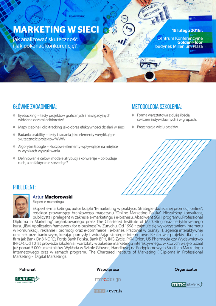 MARKETING W SIECI 18 lutego 2016r. Centrum Konferencyjne Golden Floor budynek Millenium Plaza jak analizować skuteczność i jak pokonać konkurencję? Główne zagadnienia: Metodologia szkolenia: ◊ Eyetracking – testy projektów graficznych i nawigacyjnych widziane oczami odbiorców! ◊ Forma warsztatowa z dużą ilością ćwiczeń indywidualnych i w grupach. ◊ Mapy cieplne i clicktracking jako obraz efektywności działań w sieci ◊ Prezentacja wielu case’ów. ◊ Badania usability – testy i zadania jako elementy weryfikujące skuteczność projektów WWW ◊ Algorytm Google – kluczowe elementy wpływające na miejsce w wynikach wyszukiwania ◊ Definiowanie celów, modele atrybucji i konwersje – co buduje ruch, a co faktycznie sprzedaje? Prelegent: Artur Maciorowski Ekspert e-marketingu Ekspert e-marketingu, autor książki “E-marketing w praktyce. Strategie skutecznej promocji online”, redaktor prowadzący branżowego magazynu “Online Marketing Polska”. Niezależny konsultant, publicysta i prelegent w zakresie e-marketingu i e-biznesu. Absolwent SGH, programu „Professional Diploma in Marketing” organizowanego przez The Chartered Institute of Marketing oraz certyfikowanego kursu „IBM Application framework for e-business” w Zurychu. Od 1998 r. zajmuje się wykorzystaniem internetu w komunikacji, reklamie i promocji oraz e-commerce i e-biznes. Pracował w branży IT, agencji interaktywnej oraz sektorze bankowym, kreując pomysły i wdrażając strategie internetowe. Realizował projekty dla takich firm jak Bank DnB NORD, Fortis Bank Polska, Bank BPH, ING Życie, PKN Orlen, US Pharmacia czy Wydawnictwo INFOR. Od 10 lat prowadzi szkolenia i warsztaty w zakresie marketingu interaktywnego, w których wzięło udział już ponad 5.000 uczestników. Wykłada w Szkole Głównej Handlowej na Podyplomowych Studiach Marketingu Internetowego oraz w ramach programu The Chartered Institute of Marketing ( Diploma in Professional Marketing - Digital Marketing). Patronat Współpraca Organizator MARKETING W SIECI 18 lutego 2016r. Centrum Konferencyjne Golden Floor budynek Millenium Plaza jak analizować skuteczność i jak pokonać konkurencję? program 08:30 Rejestracja i poranna kawa 09:00 Jak zweryfikować skuteczność kampanii reklamowej online i porównać swoje działania z konkurencją? – od celów do efektów w internecie ▶▶ Definiowanie KPI i celów kampanii reklamowej w sieci krok po kroku ▶▶ 3 formy badań online (user/site/action-centric) – jak zweryfikować skuteczność akcji marketingowych w sieci w zależności od celu? ▶▶ Jak definiować konwersje i mikrokonwersje dla działań typu direct response i szacować skuteczność w przypadku akcji brandingowych online? ▶▶ Jak dobierać wskaźniki efektywności w zależności od narzędzia e-marketingu? Kluczowe pojęcia i skróty ▶▶ Jaki model rozliczeń? – koszty akcji w marketingu online ▶▶ W jaki sposób budować strukturę budżetu reklamowego w zależności od celu i mierzyć skuteczność działań online? ▶▶ Przegląd rozwiązań badacza online – od bezpłatnych narzędzi po modele licencjonowane SaaS ▶▶ Koszty badań marketingowych online – ilościowe i jakościowe ▶▶ ROI w działaniach wielokanałowych online&offline – sposoby pomiaru zwrotu inwestycji ▶▶ Konkurencja i benchmarking – jak identyfikować konkurencję online i monitorować jej aktywność adaptując najlepsze wzorce? Ćwiczenie praktyczne – obliczanie skuteczność kampanii dla wybranych narzędzi/akcji wraz z interpretacją danych 10:00 10:15 11:30 ▶▶ Specyfika projektowania elementów i serwisów transakcyjnych od A do Z ▶▶ 3 kluczowe elementy w projektowanie procesów sprzedażowych ▶▶ projektowanie kart produktowych, kategorii i strony głównej sklepu/systemu - – użyteczność, architektura informacji, nawigacja ▶▶ Checklista sklepu online – o co musi zadbać każdy e-commerce i product manager? ▶▶ Ile kroków do zakupu? Konstruowania procesu zamówienia – najlepsze praktyki ▶▶ monitoring i optymalizacja działań w obszarze e-handlu – co warto mierzyć i weryfikować? ▶▶ Jak kalkulować koszty, przychody i zyski w ramach pozyskiwania leadów ▶▶ 4 typy lejków sprzedażowych – jak identyfikować problem w sklepie online? Od hipotezy do usuniecia problemu ▶▶ Narzędzia analityczne w e-commerce i generowaniu leadów – co mierzyć i jak interpretować dane? ▶▶ Systemy monitorujące i scoring w procesie leadowym Ćwiczenie praktyczne – optymalizacja wybranych kart produktowych sklepów online/landing pages 13:00 14:00 Przerwa kawowa Web analityka w pigułce – jak weryfikować skuteczność serwisu internetowego? ▶▶ Co mierzyć i jak interpretować? – przegląd kluczowych raportów w Google Analytics od A do Z ▶▶ Eyetracking – testy projektów graficznych i nawigacyjnych widziane oczami odbiorców! ▶▶ Badania usability – testy i zadania jako elementy weryfikujące skuteczność projektów WWW ▶▶ Mapy cieplne i clicktracking jako obraz efektywności działań w sieci ▶▶ Pozostałe metody (wywiady pogłębione, listy kontrolne, audyty eksperckie) ▶▶ Grupy kreatywne online – wykorzystanie potencjału klientów, przeciętnych konsumentów i ekspertów via WWW (pionierskie projekty Dell, Starbucks) ▶▶ Wady i zalety Google Analytics – co najistotniejsze w pomiarze i gdzie leżą problemy GA (próbkowanie, opóźnienie, koncentracja na odsonie) ▶▶ Definiowanie celów, modele atrybucji i konwersje – co buduje ruch, a co faktycznie sprzedaje? ▶▶ Co jeszcze musisz wiedzieć o GA? – integracje z AdWords i GWT, filtry, segmenty, parametryzacja Ćwiczenie praktyczne – interpretacja danych Case study: raporty badawcze w sieci udyt e-commerce i systemów transakcyjnych (leady, A wnioski online, LP) Przerwa na lunch Jak zmierzyć skuteczność treści w sieci? Weryfikacja contentu online
