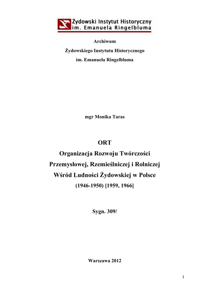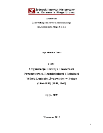 Archiwum Żydowskiego Instytutu Historycznego im. Emanuela Ringelbluma mgr Monika Taras ORT Organizacja Rozwoju Twórczości Przemysłowej, Rzemieślniczej i Rolniczej Wśród Ludności Żydowskiej w Polsce (1946-1950) [1959, 1966] Sygn. 309/ Warszawa 2012 1 Spis treści Wstęp s.5-9 Wykaz skrótów s.10 Inwentarz: I. ZG ORT Akta organizacyjne j.1-15 Finanse j.16-55 Sprawy personalne j.56-74 Korespondencja j.75-156 Materiały propagandowe, wydawnictwa j.157-181 Szkolnictwo, kursy, warsztaty j.182-284 Varia j.285 Oddziały: II. ORT Dzierżoniów Akta organizacyjne j.286-298 Finanse j.299-344 Sprawy personalne j.345-367 Korespondencja j.368-402 Szkolnictwo, kursy, warsztaty j.403-471 Sprawy rolne j.472-515 Varia j.516 III. ORT Katowice Akta organizacyjne j.517-519 Finanse j.520-530 Sprawy personalne j.531-535 2 Korespondencja j.536-543 Materiały propagandowe, wydawnictwa j.544-551 Szkolnictwo, kursy, warsztaty j.552-592 Varia j.593 IV. ORT Kraków Akta organizacyjne j.594-601 Finanse j.602-612 Sprawy personalne j.613-622 Korespondencja j.623-637 Materiały propagandowe, wydawnictwa j.638-639 Szkolnictwo, kursy, warsztaty j.640-666 Varia j.667 V. ORT Legnica Akta organizacyjne j.668-669 Finanse j.670-677 Sprawy personalne j.678-681 Korespondencja j.682-686 Materiały propagandowe, wydawnictwa j.687 Szkolnictwo, kursy, warsztaty j.688-707 VI. ORT Łódź Akta organizacyjne j.708-712 Finanse j.713-731 Sprawy personalne j.732-749 Korespondencja j.750-778 Materiały propagandowe, wydawnictwa j.779-780 Szkolnictwo, kursy, warsztaty j.781-818 3 Varia VII. j.819 ORT Szczecin Akta organizacyjne j.820-822 Finanse j.823-832 Sprawy personalne j.833-842 Korespondencja j.843-852 Szkolnictwo, kursy, warsztaty j.853-870 VIII. ORT Wałbrzych Finanse j.871 Sprawy personalne j.872-873 Szkolnictwo, kursy, warsztaty j.874-876 IX. ORT Warszawa Sprawy personalne j.877 Korespondencja j.878 Szkolnictwo, kursy, warsztaty j.879-886 X. ORT Wrocław Akta organizacyjne j.887-890 Finanse j.891-906 Sprawy personalne j.907-924 Korespondencja j.925-947 Szkolnictwo, kursy, warsztaty j.948-1026 Varia j.1027-1028 XI. XII. XIII. XIV. Fotografie Dublety Indeks osobowy dla jednostek Indeks osobowy zbiorczy j.1029-1038 j.1039-1062 s.132-350 s.351-556 4 Wstęp ORT – (polskie nazwy: Towarzystwo Popierania Pracy Zawodowej i Rolniczej wśród Żydów, Towarzystwo Szerzenia Pracy Zawodowej i Rolnej wśród Żydów, Towarzystwo Krzewienia Wiedzy Przemysłowej, Rzemieślniczej i Rolniczej wśród Żydów w Polsce, Organizacja Rozwoju Twórczości Przemysłowej Rzemieślniczej i Rolniczej wśród Ludności Żydowskiej w Polsce) powstał w 1880r. w Rosji (Obszczestwo Rasprostranienija Truda sredi Jewrejew w Rossiji). Jego zadaniem było przygotowanie Żydów do wykonywania zawodów rzemieślniczych oraz pracy na roli. ORT został oficjalnie zarejestrowany w 1906r., a jego działalność do roku 1920 ograniczała się do terenów Rosji. W 1921r. otworzono biuro ORT w Berlinie, a organizacja została przekształcona w międzynarodową. Zmienił się jej charakter z towarzystwa filantropijnego na ruch społeczny istotny dla życia żydowskiego. W Polsce organizacja W roku 1923 organizacja zainicjowała akcję zakładania żydowskich spółdzielni rolniczych i ogrodniczych. ORT prowadził szkoły, kursy, wspomagał rzemieślników. Po wojnie ORT wznowiło działalność występując o rejestrację do Zarządu Miejskiego m.st. Warszawy (25 marca 1946r.) jako „ORT - Organizacja Twórczości” z tymczasową siedzibą w Warszawie, przy ul. 6 Sierpnia 58 m. 361. W tym samym roku zostały zarejestrowane oddziały ORT na terenie Polski. Zgodnie ze statutem Stowarzyszenie miało na celu „szerzenie wiedzy zawodowej w szczególności rolniczej i rzemieślniczej w pierwszym rzędzie wśród ludności żydowskiej i organizowanie warsztatów pracy w tym zakresie”2. Zadania te zamierzano realizować poprzez zakładanie szkół, kursów, burs i warsztatów szkoleniowych; udzielanie pomocy finansowej ośrodkom szkolenia zawodowego, uczniom, warsztatom zawodowym i gospodarstwom rolnym; organizowanie imprez kulturalnych oraz propagowanie wiedzy (np. prowadzenie bibliotek, świetlic, wydawanie podręczników). W pierwszym okresie działalności (1946/47) dominowały kursy krótkoterminowe, co związane było z wiekiem uczniów (osoby przeważnie dorosłe) oraz chęcią podjęcia jak najszybciej pracy zarobkowej. Zorganizowano w tym czasie 48 kursów, w których wzięło udział 1086 uczniów. Głównych przeszkód w owym czasie należy upatrywać w zróżnicowanym poziomie intelektualnym kursantów, ich przeżyciach wojennych, braku jednolitych programów nauczania oraz wyposażenia pracowni. Przyszłość szkolnictwa zawodowego widziano w prowadzeniu warsztatów dziecinnych, których absolwenci w naturalny sposób zasililiby szkoły ortowskie. W drugim etapie działalności (1947/48) zostały utworzone dwuletnie szkoły zawodowe we Wrocławiu, Wałbrzychu i Bielsku. Wydłużono również naukę na kursach zawodowych do roku. Wprowadzono programy nauczania ustalone podczas Pierwszej Konferencji Pedagogicznej we Wrocławiu (29.VI.1947), które zbliżały szkolnictwo ortowskie 1 2 AŻIH,ORT309/1 AŻIH,ORT,309/2 5 do państwowego. Historia Żydów i języka żydowskiego stały się przedmiotami obowiązkowymi. Została rozbudowana sieć dziecięcych warsztatów zawodowych, których pod koniec roku funkcjonowało 25 z ilością 544 dzieci. Były one tworzone przy ośrodkach ortowskich, w domach dziecka oraz półinternatach szkół komitetów żydowskich. Nacisk położono również na pracę oświatowo-wychowawczą. W 1948r. po raz pierwszy uczniowie ORT-u przystąpili do egzaminów czeladniczych przed komisjami Izb Rzemieślniczych. Świadectwa czeladnicze otrzymało około 280 osób. Etap trzeci (1948/49) to przede wszystkim inicjatywa utworzenia liceów zawodowych: trzech dla młodzieży (Wrocław, Łódź, Wałbrzych, Bielsko) i jednego dla dorosłyc