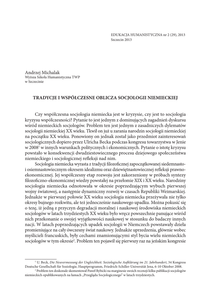 EDUKACJA HUMANISTYCZNA nr 2 (29), 2013 Szczecin 2013 Andrzej Michalak Wyższa Szkoła Humanistyczna TWP w Szczecinie TRADYCJE I WSPÓŁCZESNE OBLICZA SOCJOLOGII NIEMIECKIEJ Czy współczesna socjologia niemiecka jest w kryzysie, czy jest to socjologia kryzysu współczesności? Pytanie to jest jednym z dominujących zagadnień dyskursu wśród niemieckich socjologów. Problem ten jest jednym z zasadniczych dylematów socjologii niemieckiej XX wieku. Tkwił on już u zarania narodzin socjologii niemieckiej na początku XX wieku. Ponowiony on jednak został jako przedmiot zainteresowań socjologicznych dopiero przez Ulricha Becka podczas kongresu towarzystwa w Jenie w 20081 w innych warunkach politycznych i ekonomicznych. Pytanie o istotę kryzysu powstało w konsekwencji dwudziestowiecznego procesu dziejowego społeczeństwa niemieckiego i socjologicznej refleksji nad nim. Socjologia niemiecka wyrasta z tradycji filozoficznej zapoczątkowanej siedemnastoi osiemnastowiecznym okresem idealizmu oraz dziewiętnastowiecznej refleksji prawnoekonomicznej. Jej współczesny etap rozwoju jest zakorzeniony w próbach syntezy filozoficzno-ekonomicznej wiedzy powstałej na przełomie XIX i XX wieku. Narodziny socjologia niemiecka odnotowała w okresie poprzedzającym wybuch pierwszej wojny światowej, a następnie dynamiczny rozwój w czasach Republiki Weimarskiej. Jednakże w pierwszej połowie XX wieku socjologia niemiecka przeżywała nie tylko okresy bujnego rozkwitu, ale też jednocześnie naukowego upadku. Można pokusić się o tezę, iż jedną z przyczyn degradacji moralnej i naukowej środowiska niemieckich socjologów w latach trzydziestych XX wieku było wręcz powszechnie panujące wśród nich przekonanie o swojej wyjątkowości naukowej w stosunku do badaczy innych nacji. W latach poprzedzających upadek socjologii w Niemczech powstawały dzieła promieniujące na cały ówczesny świat naukowy. Jednakże uprzedzenia, głównie wobec myślicieli francuskich, były cechami znamionującymi styl bycia wielu niemieckich socjologów w tym okresie2. Problem ten pojawił się pierwszy raz na jeńskim kongresie 1 U. Beck, Die Neuvermessung der Ungleichheit. Soziologische Aufklärung im 21. Jahrhundert, 34 Kongress Deutsche Gesellschaft für Soziologie, Hauptprogramm, Friedrich-Schiller-Universität Jena, 6-10 Oktober 2008. 2 Problem ten doskonale skomentował Paweł Rybicki na marginesie swoich recenzji kilku publikacji socjologów niemieckich opublikowanych na łamach „Przeglądu Socjologicznego” w latach trzydziestych. 46 Andrzej Michalak Niemieckiego Towarzystwa Socjologicznego w 1922 roku3. Było to pierwsze po wojnie światowej spotkanie socjologów niemieckich i austriackich. Celem zasadniczym była ocena sytuacji społecznej w Niemczech i innych państwach ogarniętych kryzysem powojennym. W toku dyskusji podjęty został problem roli socjologów w zaistniałej sytuacji społecznej. Jednak nie było rozliczeń personalnych. Jedynie postawiona została pierwszy raz kwestia odpowiedzialności moralnej środowiska za wybuch wojny oraz jej konsekwencje. Powstał też problem nacjonalizmu niemieckiego, któremu uległa znaczna część socjologów w okresie poprzedzającym wybuch wojny i podczas jej trwania. Jedną z „ofiar” tego zjawiska był Georg Simmel, któremu w 1915 roku odmówiono zatrudnienia na stanowisku profesora zwyczajnego na uniwersytecie w Heidelbergu, motywując tę odmowę między innymi jego zbyt małym zaangażowaniem w sprawy krzewienia „ducha narodu” niemieckiego, co było pokłosiem jego francuskich i amerykańskich kontaktów naukowych. Do tej decyzji przyczyniły się też uprzedzenia rasowe panujące już w środowisku akademickim co do osób żydowskiego pochodzenia4. Obok idei nacjonalistycznych ważnym nurtem w życiu społecznym okresu międzywojennego był konserwatyzm polityczny. Problem ten został uwidoczniony już w trakcie dyskusji na kongresie w roku 1912 w Berlinie. Tematem przewodnim tego kongresu było dwie kwestie społeczne: Nation und Nationalität. W następnych latach zjawisko to rozwijało się dynamicznie w dwóch płaszczyznach ideowych: liberalnej oraz nacjonalistycznej. Czasy Republiki Weimarskiej to również rozwój idei konserwatywnych w socjologii. Najbardziej charakterystycznym przykładem tego zjawiska była ewolucja ideowa czołowego socjologa niemieckiego tego okresu, mianowicie Wernera Sombarta5. Zaczynał on swoją karierę naukowa jako krytyk kapitalizmu. Stworzył podstawy marksistowskiej socjologii. Był chwalony przez Fryderyka Engelsa za wkład w rozwój dialektycznego pojmowania społeczeństwa klasowego6. Prowadził badania nad gospodarką kapitalistyczną i społecznymi uwarunkowaniami jej funkcjonowania na przełomie XIX i XX wieku. W latach dwudziestych okresu międzywojennego przeszedł głęboką przemianę ideową. Stawał się stopniowo konserwatywnym nacjonalistą. Po roku 1933 akceptuje ideologię nazistowską. Jego książka Der deutsche Staat der Zukunft jest afirmacją narodowego socjalizmu7. Narastające podziały ideowe wśród niemieckich socjologów doprowadziły do kryzysu tego środowiska na początku lat trzydziestych ubiegłego wieku. Wielu socjologów odeszło z pracy na uczelniach lub zostali do tego zmuszeni, np. Alfred Weber, Alfred Vierkandt, Alfred von Martin, Leopold von Wiese. Wielu z nich musiało emigrować, np. Karl Mannheim, René Koenig, Franz Oppenheimer, Albert Salomon i inni. Zasadniczo emigrowały osoby o pochodzeniu żydowskim oraz o poglądach liberalnych i lewicowych, lecz nie było to regułą, np. Alfred Meussel. Verhandlungen des Dritten Deutschen Soziologentages am 24 und 25 September 1922 in Jena. Rede und Vorträge von Ferdinand Tönnies, Leopold v. Wiese, Ludo Moritz Hartmann und Debatten über Das Wesen der Revolution, Verlag von J.C.B. Mohr (Paul Siebeck), Tübingen 1923. 4 G. Simmel, Miszellen. Glossen. Stellungnahmen. Umfrageantworten. Lesebriefe. Diskussionsbeitr