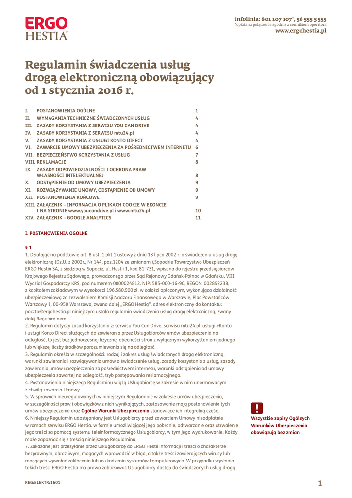 Infolinia: 801 107 107*, 58 555 5 555 *opłata za połączenie zgodnie z cennikiem operatora www.ergohestia.pl Regulamin świadczenia usług drogą elektroniczną obowiązujący od 1 stycznia 2016 r. I. POSTANOWIENIA OGÓLNE 1 II. WYMAGANIA TECHNICZNE ŚWIADCZONYCH USŁUG 4 III. ZASADY KORZYSTANIA Z SERWISU YOU CAN DRIVE 4 IV. ZASADY KORZYSTANIA Z SERWISU mtu24.pl 4 V. ZASADY KORZYSTANIA Z USŁUGI KONTO DIRECT 4 Vi. ZAWARCIE UMOWY UBEZPIECZENIA ZA POŚREDNICTWEM INTERNETU 6 ViI. BEZPIECZEŃSTWO KORZYSTANIA Z USŁUG 7 VIII. REKLAMACJE8 IX. ZASADY ODPOWIEDZIALNOŚCI I OCHRONA PRAW WŁASNOŚCI INTELEKTUALNEJ8 X. ODSTĄPIENIE OD UMOWY UBEZPIECZENIA 9 Xi. ROZWIĄZYWANIE UMOWY, ODSTĄPIENIE OD UMOWY 9 XIi. POSTANOWIENIA KOŃCOWE9 XIii. Załącznik – informacja o plikach cookie w ekoncie i na stronie www.youcandrive.pl i www.mtu24.pl10 XiV. załącznik – Google Analytics 11 I. POSTANOWIENIA OGÓLNE §1 1.Działając na podstawie art. 8 ust. 1 pkt 1 ustawy z dnia 18 lipca 2002 r. o świadczeniu usług drogą elektroniczną (Dz.U. z 2002r., Nr 144, poz.1204 ze zmianami),Sopockie Towarzystwo Ubezpieczeń ERGO Hestia SA, z siedzibą w Sopocie, ul. Hestii 1, kod 81-731, wpisana do rejestru przedsiębiorców Krajowego Rejestru Sądowego, prowadzonego przez Sąd Rejonowy Gdańsk-Północ w Gdańsku, VIII Wydział Gospodarczy KRS, pod numerem 0000024812, NIP: 585-000-16-90, REGON: 002892238, z kapitałem zakładowym w wysokości 196.580.900 zł. w całości opłaconym, wykonująca działalność ubezpieczeniową za zezwoleniem Komisji Nadzoru Finansowego w Warszawie, Plac Powstańców Warszawy 1, 00-950 Warszawa, zwana dalej „ERGO Hestią”, adres elektroniczny do kontaktu: [email protected] niniejszym ustala regulamin świadczenia usług drogą elektroniczną, zwany dalej Regulaminem. 2.Regulamin dotyczy zasad korzystania z: serwisu You Can Drive, serwisu mtu24.pl, usługi eKonto i usługi Konto Direct służących do zawierania przez Usługobiorców umów ubezpieczenia na odległość, to jest bez jednoczesnej fizycznej obecności stron z wyłącznym wykorzystaniem jednego lub większej liczby środków porozumiewania się na odległość. 3.Regulamin określa w szczególności: rodzaj i zakres usług świadczonych drogą elektroniczną, warunki zawierania i rozwiązywania umów o świadczenie usług, zasady korzystania z usług, zasady zawierania umów ubezpieczenia za pośrednictwem internetu, warunki odstąpienia od umowy ubezpieczenia zawartej na odległość, tryb postępowania reklamacyjnego. 4.Postanowienia niniejszego Regulaminu wiążą Usługobiorcę w zakresie w nim unormowanym z chwilą zawarcia Umowy. 5.W sprawach nieuregulowanych w niniejszym Regulaminie w zakresie umów ubezpieczenia, w szczególności praw i obowiązków z nich wynikających, zastosowanie mają postanowienia tych umów ubezpieczenia oraz Ogólne Warunki Ubezpieczenia stanowiące ich integralną cześć. 6.Niniejszy Regulamin udostępniany jest Usługobiorcy przed zawarciem Umowy nieodpłatnie w ramach serwisu ERGO Hestia, w formie umożliwiającej jego pobranie, odtwarzanie oraz utrwalenie jego treści za pomocą systemu teleinformatycznego Usługobiorcy, w tym jego wydrukowanie. Każdy może zapoznać się z treścią niniejszego Regulaminu. 7.Zakazane jest przesyłanie przez Usługobiorcę do ERGO Hestii informacji i treści o charakterze bezprawnym, obraźliwym, mogących wprowadzić w błąd, a także treści zawierających wirusy lub mogących wywołać zakłócenia lub uszkodzenia systemów komputerowych. W przypadku wysłania takich treści ERGO Hestia ma prawo zablokować Usługobiorcy dostęp do świadczonych usług drogą REG/ELEKTR/1601 Wszystkie zapisy Ogólnych Warunków Ubezpieczenia obowiązują bez zmian 1 Infolinia: 801 107 107*, 58 555 5 555 *opłata za połączenie zgodnie z cennikiem operatora www.ergohestia.pl elektroniczną oraz wystąpić na drogę prawną z roszczeniem odszkodowawczym. 8.Usługobiorca, będący równocześnie konsumentem, ma prawo żądać zmiany środka porozumiewania się na odległość, chyba że stosowanie takiego środka nie jest przewidziane w umowie lub nie odpowiada on charakterowi świadczonej usługi. §2 Użyte w niniejszym Regulaminie określenia otrzymują następujące znaczenie: 1)aktywacja eKonta – czynność polegająca na uaktywnieniu linka do usługi eKonto i zalogowaniu do eKonta, powodująca zawarcie Umowy o świadczenie usług drogą elektroniczną. 2)aktywacja Konta Direct – czynność polegająca na uaktywnieniu linka do usługi Konto Direct, powodująca zawarcie Umowy o świadczenie usług drogą elektroniczną. 3)Cookies – niewielkie informacje tekstowe, wysłane przez serwis ERGO Hestia i zapisywane na twardym dysku komputera Usługobiorcy, które serwis ERGO Hestia może odtworzyć przy każdym połączeniu się z tym serwisem przez komputer Usługobiorcy. 4)Dotpay – serwis internetowy, świadczony na podstawie odrębnej umowy przez spółkę Dotpay S.A. z siedzibą w Krakowie, przy ul. Wielickiej 72, 30-552 Kraków, NIP 6342661860, REGON 240770255, wpisana do rejestru przedsiębiorców pod numerem KRS 0000296790, prowadzonym przez Sąd Rejonowy Kraków-Śródmieście w Krakowie, Wydział XI Gospodarczy Krajowego Rejestru Sądowego, umożliwiający dokonywanie płatności związanych z zawartymi umowami ubezpieczenia w podanych i udostępnionych kanałach płatności. Adresem internetowym serwisu Dotpay jest www.dotpay.pl. 5)eKonto – serwis internetowy, udostępniany Usługobiorcy nieodpłatnie po wyrażeniu przez niego zgody na świadczenie usług drogą elektroniczną, prezentujący posiadane przez niego umowy ubezpieczenia i polisy oraz likwidowane z jego umowy ubezpieczenia szkody oraz umożliwiający Usługobiorcy kontakt z Grupą ERGO Hestia w zakresie wybranych procesów związanych z obsługą umów ubezpieczenia oraz obsługą szkód. 6)Hasło – ciąg znaków służących personalizacji Usługobiorcy , ustalanych w celu a