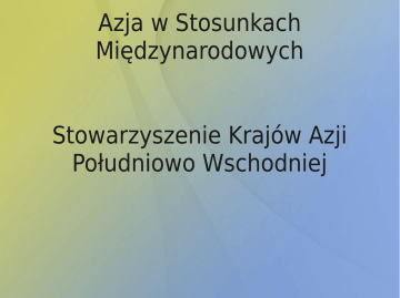 Azja w Stosunkach Międzynarodowych Stowarzyszenie Krajów Azji Południowo Wschodniej Logo i flaga ASEAN ASEAN ● Stowarzyszenie Krajów Azji Południowo – Wschodniej (ang. Association of Southeast Asian Nations – ASEAN) powstało na mocy Deklaracji z Bangkoku 8 Sierpnia 1967. Członkowie ASEAN ● ● ● ● ● Członkami założycielami były: Indonezja, Malezja, Tajlandia, Filipiny i Singapur. 8 I 1984 – Brunei Darussalam zostaje członkiem (niepodległe od 1 I 1984) 28 VII 1995 – przystąpienie Wietnamu – w latach 1980-tych najważniejszego lokalnego przeciwnika ugrupowania. 23 VII 1997 – przystąpienie Laosu i Myanmaru (Birmy) 30 IV 1999 – przystąpienie Kambodży (planowane na 1997r., ale opóźnione w wyniku zamachu stanu) Członkowie ASEAN ● ● 1976r. - Papua Nowa Gwinea zostaje obserwatorem ASEAN 2002 Timor Wschodni zostaje obserwatorem, w 2006 ogłasza chęć akcesji do ugrupowania. Członkowie ASEAN Geneza ASEAN ● ● ASEAN powstało w Azji Południowo Wschodniej w niespokojnym okresie lat 1960-tych. Początkowo głównymi celami organizacji (nieformalnie) było: ● ● z jednej strony zapewnienie niezależności członków od mocarstw kolonialnych oraz USA i ZSRR, Z drugiej powstrzymanie ekspansji komunizmu w regionie wspieranym przez ZSRR i ChRL. Geneza ASEAN ● Uwarunkowania ● ● Wojna w Wietnamie (II wojna indochińska) Działalność partyzantek komunistycznych w Malezji, Tajlandii, Filipinach ● Konfronatasi – konflikt malajsko-indonezyjski ● Separatyzmy w wielu prowincjach Separatyzmy i powstania w Azji Pd-Wsch Geneza ASEAN ● 1976r .Traktat o Przyjaźni i Współpracy w Azji Południowo Wschodniej (Treaty of Amity and Cooperation in Southeast Asia – TAC) ustanawia formalne reguły zachowania w organizacji. TAC ● Zasady zawarte w TAC: ● Wzajemne poszanowanie niepodległości, suwerenności, równości, integralności terytorialnej i tożsamości narodowej wszystkich narodów; ● Prawo każdego państwa do swobodnego istnienia w sposób wolny od zewnętrznej ingerencji, dywersji lub przymusu ● Nieinterwencje w wewnętrzne sprawy innego kraju; ● Rozstrzyganie sporów i waśni w pokojowy sposób ● Odrzucenie użycia siły lub jej groźby; ● Wzajemną skuteczną współpracę ASEAN Way ● Praktyką działalności ASEAN jest regulowana przez tzw ASEAN Way: ● Poszukiwanie kompromisu akceptowalnego dla wszystkich ● Zasada konsensusu ● Rozmowy nieoficjalne ● Szeroko zakrojone rozmowy wyjaśniające ze wszystkimi zainteresowanymi stronami przed formalnym zgłoszeniem inicjatywy ● Poczucie ducha wspólnoty ● Właściwe i skromne zachowanie ● Dążenie do ogólnego porozumienia, nawet jeżeli realizacja szczegółów nie jest ustalona Karta ASEAN ● ● W listopadzie 2007 podczas Szczytu ASEAN w Singapurze przyjęto Kartę ASEAN, która weszła w życie 14 XII 2008r. Karta formalizuje zasady działania ASEAN i być może stanie się początkiem większej instytucjonalizacji organizacji. Może też przyczynić się do zwiększenia jej skuteczności – jej artykuł 20 punkt 4 mówi: „W wypadku poważnego złamania Karty lub niepodporządkowania się kwestia zostanie przedłożona Szczytowi ASEAN do decyzji” Działania ASEAN ● Główne wyzwania przed 1989: ● Konflikt radziecko – chiński ● Ułożenie relacji z ChRL ● Wycofanie się USA z regionu po Wojnie Wietnamskiej ● Konflikt w Kambodży (III wojna indochińska) Działania ASEAN ● Zmiana po 1989 ● Brak zagrożenia ze strony ZSRR ● Współpraca z Wietnamem ● Rozszerzenie ASEAN ● ● 1995 – Southeast Asia Nuclear-Weapon-Free Zone Treaty (od 2001 obowiązuje) Kryzys Azjatycki 1997r. Wyzwania stojące przed ASEAN ● ● ● ● ● ● Dostosowanie się do rosnącej potęgi ChRL Zapewnienie suwerenności regionu bez utraty gwarancji bezpieczeństwa Zapewnienie zrównoważonego rozwoju Współpraca ekonomiczna w ramach ASEAN (AFTA, AFT), i na zewnątrz Dostosowanie się do procesów demokratyzacji w ramach autorytarnej ASEAN Way Rozwiązanie kwestii Birmańskiej – zagrożenia dla wiarygodności ASEAN i ASEAN Way Ocena ASEAN ● ASEAN jest organizacją będącą przedmiotem debaty pomiędzy badaczami stosunków międzynarodowych, dotyczącej jej roli w regionie: ● ● Zwolennicy teorii neorealistycznej uważają, że organizacja jest raczej nieskuteczna, stanowi swego rodzaju „klub dyskusyjny” Zwolennicy teorii konstruktywistycznej podkreślają istotną – pozytywną – rolę organizacji w zakresie kształtowania norm stosunków międzynarodowych. Sieć Organizacji ASEAN ● ● Charakterystyczną cechą ASEAN jest tworzenie różnorodnych struktur współpracy zewnętrznej pomiędzy organizacją a jej partnerami regionalnymi i globalnymi Organizacje te służą umocnieniu ASEAN na scenie międzynarodowej jako partnera, oraz promują wzorce zachowania pomiędzy uczestnikami w oparciu o TAC oraz wartości ASEAN Way. Sieć Organizacji ASEAN ● Forum Regionalne ASEAN (ASEAN Regional Forum – ARF) zrzeszające kraje ASEAN, Australię, Bangladesz, Chiny, Indie, kraje Unii Europejskiej, Japonię, Kanadę, Koreę Południową i Północną, Mongolię, Nową Zelandię, Pakistan, Papuę Nową Gwineę, Rosję, Sri Lankę, Stany Zjednoczone i Timor – Leste ● Powstało 24 VII 1994r. i stanowi jeden z głównych obszarów współpracy w zakresie bezpieczeństwa regionalnego w obszarze Pacyfiku Sieć Organizacji ASEAN ● ASEAN + 3 zrzeszające 10 krajów ASEAN oraz Chiny, Japonię i Koreę Południową ● ● ● Powołane w 1998r. Celem jest regionalna współpraca ekonomiczno – polityczna, m.in. zapobieżenie powtórki z kryzysu w 1997r. Szczyt Wschodnioazjatycki (East Asian Summit – EAS) zrzeszający kraje ASEAN + 3 oraz Indie, Australię i Nową Zelandię ● Powołany w XII 2005 – stanowi rozszerzenie ASEAN + 3 Sieć Organizacji ASEAN