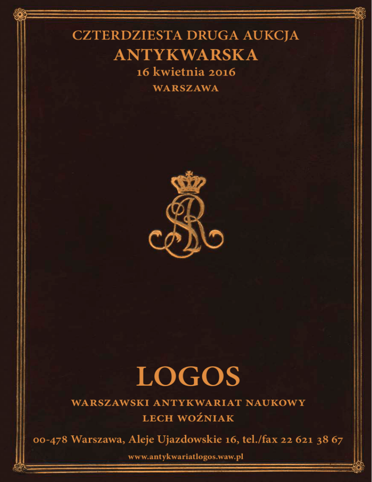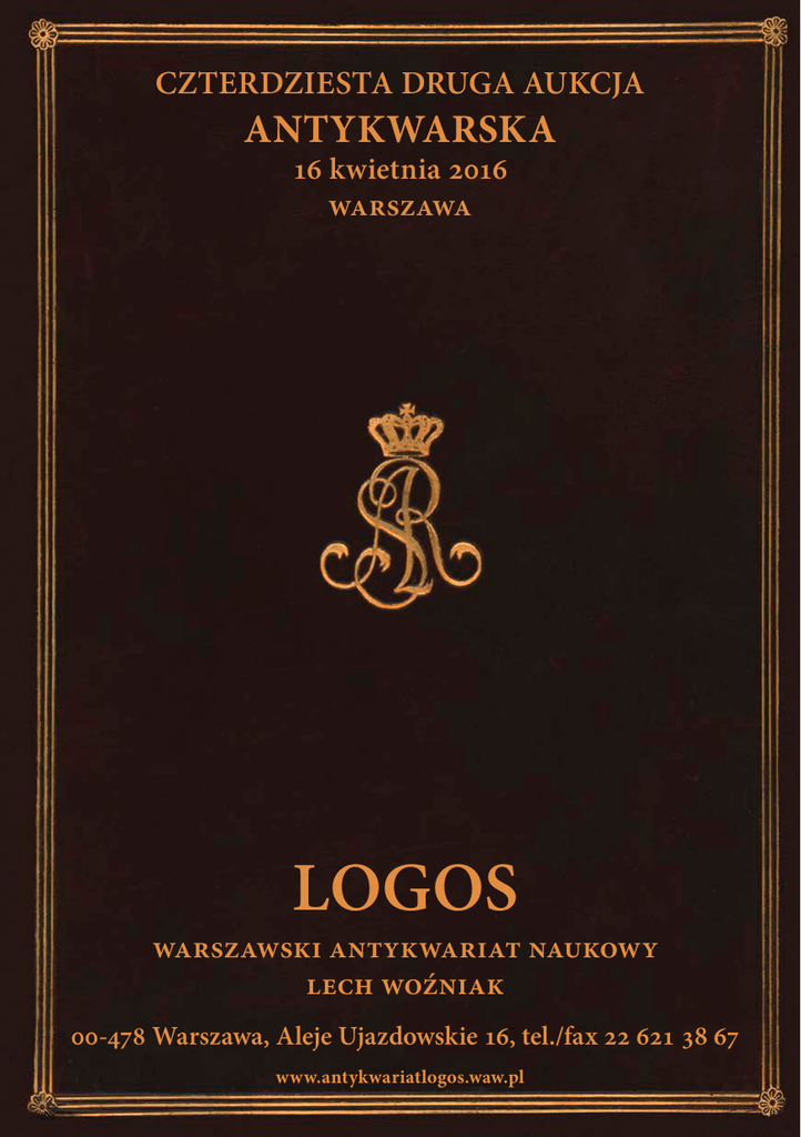CZTERDZIESTA DRUGA AUKCJA ANTYKWARSKA 16 kwietnia 2016 WARSZAWA LOGOS WARSZAWSKI ANTYKWARIAT NAUKOWY LECH WOŹNIAK 00-478 Warszawa, Aleje Ujazdowskie 16, tel./fax 22 621 38 67 www.antykwariatlogos.waw.pl LOGOS Warszawski Antykwariat Naukowy Lech Woźniak CZTERDZIESTA DRUGA AUKCJA ANTYKWARSKA KATALOG MIEJSCE AUKCJI Klub Księgarza w Warszawie Rynek St. Miasta 22 / 24, tel. 22 635 25 97 Początek aukcji: 16 kwietnia 2016, godz. 10:30 Wystawione obiekty można oglądać w dniu aukcji od godz. 8:30 warszawa 2016 Opracowanie katalogu Justyna i Lech Woźniak Współpraca Iwona Banaszkiewicz i Weronika Woźniak Grafika Woz Broz Typografia oudeis Okładka: przód poz. 26, s. ii poz. 112, s. iii poz. 193, s. iv poz. 60 i 61 Ilustracje w tekście: karta tyt. poz. 72; s. 3 poz. 436; s. 228 poz. 63 INFORMACJE W katalogu podane są ceny wywołania. W zamówieniach korespondencyjnych należy podać czytelnie numer katalogowy, nazwisko autora, pierwsze słowa tytułu oraz najwyższą zaoferowaną cenę (limit). Zlecenia instytucji państwowych i społecznych wykonujemy po nadesłaniu formalnego zamówienia, według wypełnionego załączonego wzoru. Prosimy zwrócić specjalną uwagę, aby zamówienia były koniecznie podpisane przez głównego księgowego oraz dyrektora (kierownika) placówki zamawiającej. Na sali aukcyjnej sprzedaż osobom prywatnym realizujemy tylko za gotówkę. Zamówienia korespondencyjne osobom prywatnym wykonujemy wyłącznie za pobraniem pocztowym. Zamówienia i wszelką korespondencję w sprawach dotyczących aukcji prosimy kierować na adres: LOGOS Warszawski Antykwariat Naukowy, Al. Ujazdowskie 16, 00–478 Warszawa. Konto bankowe: 63 1020 1097 0000 7002 0232 7633 Prosimy o przestrzeganie 7-dniowego terminu płatności od daty otrzymania rachunku za zakupione pozycje. Po tym terminie naliczane będą ustawowe odsetki. Płatników podatku VAT prosimy o wcześniejsze podanie numeru NIP i przekazanie upoważnienia umożliwiającego przesyłanie faktur VAT bez podpisu odbiorcy. Informujemy, że wg obowiązującej ustawy, do cen wylicytowanych będzie doliczony podatek VAT. katalog dostępny także w internecie pod adresem: www.antykwariatlogos.waw.pl e-mail: [email protected] tel. / fax (22) 621 38 67, kom. +48 501 306 404 Druk i oprawa: Wydawnictwa Przemysłowe WEMA Sp. z o.o., 02–729 Warszawa, ul. Rolna 191 / 193 tel. +48 (22) 828 62 78, fax +48 (22) 828 57 79, e-mail: [email protected]; www.wp-wema.pl isbn 978-83-934900-4-2 Spis treści sztuka • ARCHITEKTURA • RZEMIOSŁO (1–61) 5 Album widoków historycznych Polski (50–59)21 sowiecki plakat propagandowy 1920 (60–61)27 STARE DRUKI (62–79) 29 CYMELIA (80–113) 38 bilety wizytowe (80–86)38 funeralia (105–109) 50 fotografie (110–113) 53 LITERATURA (114–194) 58 REGIONALIA (195–272) 79 POCZTÓWKI (273–315) 103 WOJSKOWOŚĆ (316–412) 115 NAUKI POMOCNICZE HISTORII (413–427) 143 HISTORIA (428–553) 147 PRAWO (554–563) 178 JUDAICA (564–592) 181 GOSPODARSTWO (593–636) 189 ŁOWIECTWO (637–643) 204 SPORT (644–650) 207 VARIA (651–675) 210 Indeks218 GRAFIKA… poz. 12 sztuka • ARCHITEKTURA • RZEMIOSŁO 1. ALMANACH fotografiki wileńskiej. Wilno: Fotoklub Wileński, 1931. – 56, [2], 57–87, [1] s., [40] s. tabl., ozdobniki, 26 cm, opr. pł. Tyt. i informacje również w jęz. franc., ang. i niem. W części tekstowej m.in. historia i statut organizacji, bibliografia fotografiki polskiej, spis stowarzyszeń fotograficznych w Polsce i lista adresowa fotografików polskich. W części ilustracyjnej 40 zdjęć fotografików wileńskich, w tym Jana Bułhaka. Dział literacki Jan Bułhak; Dział ilustracyjny St. Turski; Okładka i układ graficzny Jan Kruszyński; Dział ogłoszeń Kazimierz Lelewicz. Zachowana okładka broszury. Egz. nosi nr 318. Stan b. dobry. 200. – 2. ALSTER Antoni: Antoni Alster 1903–1968. [Wystawa grafiki, Związek Polskich Artystów Plastyków, Warszawa, lipiec 1973]. Warszawa: PP Pracownie Sztu k Plast ycznych – DOG, 1973. – [28] s. w tym 12 s.il., 21 cm, brosz. wyd. Alster, przed wojną działacz ruchu robotniczego, wykonujący szereg prac graficznych dla wydawnictw KPP, po wojnie wiceminister Urzędu Bezpieczeństwa. Po latach wracający do artystycznych działań, w drzeworycie, linorycie i własnej technice termografii. Niewielki zaciek od strony grzbietu. 30. – 3. BOCHEŃSKI Zbigniew: Dwór obronny w Dębnie. Kraków: Ministerstwo Wyzn. Relig. Oświec. Publ., 1926. – [2], 54 s., il., [1] k. tabl., 30 cm, brosz. wyd. Pieczątka: Z księgozbioru Erazma i Neli Samotyhów. Okładka naddarta, blok czysty. 75. – 5 4. BUDOWA pomieszczeń dla Korpusu Ochrony Pogranicza i domów dla urzędników państwowych w województwach wschodnich. Zeszyt II. Warszawa: Ministerstwo Rob. Publ., 1925. – [4], 63, [9] s., il., [2] k. tabl. kol., 29 cm, brosz. wyd. Przykłady budynków wojskowych, urzędowych i mieszkalnych na Kresach. Całość składała się z 3 zeszytów. Proj. okł. Witold Czeczott. Niewielkie przebarwienie krawędzi 2 kart, poza tym stan b. dobry. 240. – 5. CYBULSKA Maja Elżbieta: Rozmowy ze Stanisławem Gliwą. Londyn: Pol. Fund. Kulturalna, 1990. – 202, [3] s., il., 21,5 cm, brosz. wyd. Rozmowy ze znkomitym typografem Stanisławem Gliwą, ozdobione bogatym materiałem graficznym, oraz kalendarium jego życia i twórczości. Stan b. dobry. 120. – 6. DEMENTJEW Pułkownik: Plotnicznoje iskusstwo s 212-ju risunkami. Izdanje wtoroje. S.-Petersburg: D.F. Fjedorow, 1870. – [2], III, 186 s., il., 23 cm, opr. płsk. z epoki. Prywatne pieczątki. Bogato ilustrowany podręcznik stolarki budowlanej. Stan b. dobry. 180. – 6 7. DOMANIEWSKI Czesław: Plan i kosztorys czworaków dla służby folwarcznej (11 tablic i kosztorys z wskazówkami technicznymi). Dodatek do Gazety Rolniczej. Warszawa: nakł. Gazety Rolniczej, 1912. – 6 s., 6 + 5 k. tabl. planów luz. 31 cm, teka, karton wyd. Teczka poprzecierana na krawędziach i narożnikach, podbrudzona, arkus