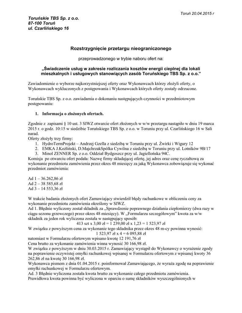 Toruń 20.04.2015 r Toruńskie TBS Sp. z o.o. 87-100 Toruń ul. Czarlińskiego 16 Rozstrzygnięcie przetargu nieograniczonego przeprowadzonego w trybie naboru ofert na: „Świadczenie usług w zakresie rozliczania kosztów energii cieplnej dla lokali mieszkalnych i usługowych stanowiących zasób Toruńskiego TBS Sp. z o.o.” Zawiadomienie o wyborze najkorzystniejszej oferty oraz Wykonawcach którzy złożyli oferty, o Wykonawcach wykluczonych z postępowania i Wykonawcach których oferty zostały odrzucone. Toruńskie TBS Sp. z o.o. zawiadamia o dokonaniu następujących czynności w przedmiotowym postępowaniu: 1. Informacja o złożonych ofertach. Zgodnie z zapisami § 10 ust. 3 SIWZ otwarcie ofert złożonych w w/w przetargu nastąpiło w dniu 19 marca 2015 r. o godz. 10:15 w siedzibie Toruńskiego TBS Sp. z o.o. w Toruniu przy ul. Czarlińskiego 16 w Sali narad. Oferty złożyły trzy firmy: 1. HydroTermProjekt – Andrzej Gzella z siedzibą w Toruniu przy ul. Żwirki i Wigury 12 2. EMKA J.Koźliński, D.MajchrzakSpólka Cywilna z siedzibą w Toruniu przy ul. Lotników 9B/17 3. Minol ZENNER Sp. z o.o. Oddział Bydgoszcz przy ul. Jagiellońska 94C. Komisja po otwarciu ofert podała: Nazwę firmy składającej ofertę, jej adres oraz cenę ryczałtową za wykonanie przedmiotu zamówienia przez okres 48 miesięcy za jaką Wykonawca zobowiązuje się wykonać przedmiot zamówienia: Ad 1 – 36.262,86 zł Ad 2 – 38 585,68 zł Ad 3 – 14 553,36 zł W trakcie badania złożonych ofert Zamawiający stwierdził błędy rachunkowe w obliczeniu ceny za wykonanie przedmiotu zamówienia określony w SIWZ. Ad 1. Błędnie wyliczony został składnik za „Sprawdzenie poprawnego działania ciepłomierzy (dwa razy w ciągu sezonu grzewczego) przez okres 48 miesięcy). W „Formularzu szczegółowym” kwota za w/w składnik za jeden rok wyliczona została w następujący sposób: 413 szt x 3,00 zł = 1 239,00 zł x 1,23 = 1 523,97 zł W związku z powyższym cena za wykonanie tego składnika przez okres 48 m-cy powinna wynosić: 1 523,97 zł x 4 = 6 095,88 zł natomiast w Formularzu ofertowym wpisano kwotę 12 191,76 zł Cena brutto za wykonanie zamówienia winna wynosić 30 166,98 zł. W związku z powyższym w dniu 30.03.2015 r. Zamawiający wystąpił do Wykonawcy o wyrażenie zgody na poprawienie oczywistej omyłki rachunkowej wpisanej w Formularzu ofertowym z wpisanej kwoty 36 262,86 zł na kwotę 30 166,98 zł. Wykonawca pismem z dnia 01.04.2015 r. poinformował Zamawiającego, że wyraża zgodę na poprawienie omyłki rachunkowej w Formularzu ofertowym. Ad. 3 Błędnie wyliczona została kwota brutto za wykonanie całego przedmiotu zamówienia. Prawidłowa kwota powinna być wyliczona w oparciu o sumę składników wyszczególnionych w Formularzu szczegółowym w następujący sposób: 14 553,36 + 6 095,88 + 12 598,15 = 33 247,39 zł W związku z powyższym w dniu 30.03.2015 r. Zamawiający wystąpił do Wykonawcy o wyrażenie zgody na poprawienie oczywistej omyłki rachunkowej wpisanej w Formularzu ofertowym z wpisanej kwoty 14 553,36 zł na kwotę 33 247,39 zł. Wykonawca pismem z dnia 10.04.2015 r. poinformował Zamawiającego, że wyraża zgodę na poprawienie omyłki rachunkowej wpisanej w Formularzu ofertowym. W związku z powyższym Zamawiający informuje, że za najkorzystniejszą uznana została oferta nr 1 złożona przez firmę HydroTermProjekt – Andrzej Gzella z siedzibą w Toruniu przy ul. Żwirki i Wigury 12 za cenę 30 166,98 zł. . Oferta jest ofertą najkorzystniejszą i spełnia wymagania Specyfikacji Istotnych Warunków Zamówienia 2. Informacja o Wykonawcach, których oferty zostały odrzucone w niniejszym postępowaniu W wyniku przeprowadzenia czynności związanych z badaniem i oceną złożonych ofert Zamawiający nie odrzucił żadnej oferty. 3. Informacja o Wykonawcach, którzy zostali wykluczeni z postępowania o udzielenie niniejszego zamówienia. W wyniku przeprowadzenia czynności związanych z badaniem i oceną złożonych ofert Zamawiający nie wykluczył żadnego Wykonawcy. 4. Informacja o terminie podpisania umowy. Zamawiający informuje, że o terminie podpisania umowy powiadomi Wykonawcę którego oferta była najkorzystniejsza odrębnym pismem. Beata Żółtowska - Prezes Zarządu