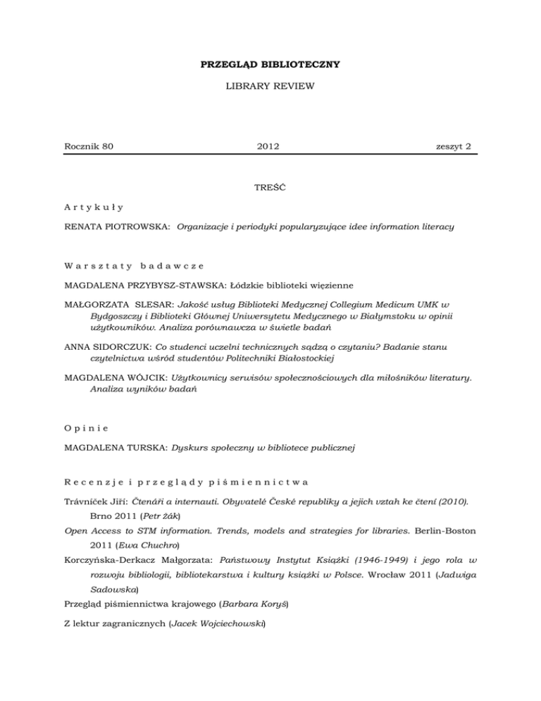 PRZEGLĄD BIBLIOTECZNY LIBRARY REVIEW Rocznik 80 2012 zeszyt 2 TREŚĆ Artykuły RENATA PIOTROWSKA: Organizacje i periodyki popularyzujące idee information literacy Warsztaty badawcze MAGDALENA PRZYBYSZ-STAWSKA: Łódzkie biblioteki więzienne MAŁGORZATA SLESAR: Jakość usług Biblioteki Medycznej Collegium Medicum UMK w Bydgoszczy i Biblioteki Głównej Uniwersytetu Medycznego w Białymstoku w opinii użytkowników. Analiza porównawcza w świetle badań ANNA SIDORCZUK: Co studenci uczelni technicznych sądzą o czytaniu? Badanie stanu czytelnictwa wśród studentów Politechniki Białostockiej MAGDALENA WÓJCIK: Użytkownicy serwisów społecznościowych dla miłośników literatury. Analiza wyników badań Opinie MAGDALENA TURSKA: Dyskurs społeczny w bibliotece publicznej Recenzje i przeglądy piśmiennictwa Trávníček Jiří: Čtenáři a internauti. Obyvatelé České republiky a jejich vztah ke čtení (2010). Brno 2011 (Petr Žák) Open Access to STM information. Trends, models and strategies for libraries. Berlin-Boston 2011 (Ewa Chuchro) Korczyńska-Derkacz Małgorzata: Państwowy Instytut Książki (1946-1949) i jego rola w rozwoju bibliologii, bibliotekarstwa i kultury książki w Polsce. Wrocław 2011 (Jadwiga Sadowska) Przegląd piśmiennictwa krajowego (Barbara Koryś) Z lektur zagranicznych (Jacek Wojciechowski) Z życia SBP Sprawozdanie z działalności Stowarzyszenia Bibliotekarzy Polskich za 2011 rok Nagroda Naukowa SBP im. A. Łysakowskiego za rok 2011 Z żałobnej karty Jan Szymański (1931-2011) (Maria Juda) Wskazówki dla autorów RENATA PIOTROWSKA Instytut Informacji Naukowej i Bibliotekoznawstwa Uniwersytet Wrocławski e-mail: [email protected] ORGANIZACJE I PERIODYKI POPULARYZUJĄCE IDEĘ INFORMATION LITERACY SŁOWA KLUCZOWE: Edukacja informacyjna. informacyjne. Organizacje, periodyki. Information literacy. Kompetencje ABSTRAKT: Teza/Cel artykułu – Celem artykułu jest prezentacja wybranych organizacji, instytucji i wydawnictw ciągłych, służących popularyzacji idei information literacy. W zestawieniu znalazły się inicjatywy realizowane na arenie międzynarodowej, a także lokalnie. Metody badań – Działalność tych organizacji i wydawnictw omówiona została na podstawie analizy różnych typów dokumentów. Wyniki i wnioski – Po blisko pięćdziesięciu latach od pojawienia się terminu information literacy możemy zaobserwować wyodrębnianie się ze struktur istniejących organizacji takich ich komórek, których działalność poświęcona jest propagowaniu idei information literacy. Powoływane są również nowe instytucje, którym przyświeca ten sam cel. Wzrost zainteresowania problematyką information literacy potwierdzają czasopisma, których zadaniem jest wymiana myśli pomiędzy teoretykami i praktykami z całego świata, prezentacja osiągnięć i wymiana doświadczeń w zakresie edukacji informacyjnej. MAGDALENA PRZYBYSZ-STAWSKA Uniwersytet Łódzki Katedra Bibliotekoznawstwa i Informacji Naukowej e-mail: [email protected] ŁÓDZKIE BIBLIOTEKI WIĘZIENNE SŁOWA KLUCZOWE Biblioteki więzienne. Łódź. Zakład Karny nr 1. Zakład Karny nr 2. Areszt Śledczy w Łodzi. ABSTRAKT: Teza/cel artykułu – Celem artykułu jest opis i ocena organizacji i funkcjonowania bibliotek więziennych, działających w ramach dwóch Zakładów Karnych i jednego Aresztu Śledczego w Łodzi. Przedstawiono strukturę organizacyjną i księgozbiory każdej z nich oraz sposoby korzystania z gromadzonego księgozbioru. Metody badań – Wykorzystane w opracowaniu dane uzyskane zostały na podstawie analizy dokumentacji działalności badanych jednostek oraz wywiadów przeprowadzonych w lipcu 2010 r. z wychowawcami zatrudnionymi w działach penitencjarnych ds. bibliotek w poszczególnych ośrodkach. Wyniki i wnioski – Przeprowadzona analiza pozwoliła stwierdzić, że poddane badaniu łódzkie biblioteki więzienne charakteryzuje słaba kondycja, szczególnie pod względem finansowym, ale również działalności promocyjnej czy kulturowej. Widoczny jest także brak świadomości znaczenia funkcji terapeutycznej książki w procesie resocjalizacji osadzonych. MAŁGORZATA SLESAR Biblioteka Medyczna Collegium Medicum UMK w Bydgoszczy e-mail: [email protected] JAKOŚĆ USŁUG BIBLIOTEKI MEDYCZNEJ COLLEGIUM MEDICUM UMK W BYDGOSZCZY I BIBLIOTEKI GŁÓWNEJ UNIWERSYTETU MEDYCZNEGO W BIAŁYMSTOKU W OPINII UŻYTKOWNIKÓW Analiza porównawcza w świetle badań SŁOWA KLUCZOWE: Usługi bibliotecznych. SERVQUAL. biblioteczne. Ocena jakości. Badanie jakości usług ABSTRAKT: Teza/cel artykułu – Artykuł prezentuje wyniki badań jakości usług bibliotecznych świadczonych przez Bibliotekę Medyczną Collegium Medicum w Bydgoszczy (BMCM w Bydgoszczy) i Bibliotekę Główną Uniwersytetu Medycznego w Białymstoku (BGUM w Białymstoku). Metody badań – Badania przeprowadzono w roku akademickim 2009/2010 wśród studentów BMCM w Bydgoszczy oraz BGUM w Białymstoku. W celu zmierzenia jakości usług bibliotecznych wykorzystano zmodyfikowany model SERVQUAL. Do obliczeń statystycznych zastosowano metodę Kruskala–Wallisa, pozwalającą sprawdzić rozkład odpowiedzi dla badanych grup studentów studiów dziennych, zaocznych i wieczorowych. Wyniki i wnioski – Z przeprowadzonych badań wynika, że użytkownicy obu bibliotek medycznych oceniają, że najważniejszy dla nich jest wymiar metody SERVQUAL zwany konkretyzacją, czyli dostęp do urządzeń, sprzętu, wyposażenia oraz materiałów informacyjnych. Najmniej ważny okazuje się być wymiar związany z empatią personelu bibliotecznego, czyli troska i dostosowanie do odpowiednich potrzeb użytkownika. Wyniki te są odmienne od dotychczas uzyskiwanych w badaniach bibliotek metodą SERVQUAL, gdzie jako najważniejsze wymiary związane z obsługą użytkownika podawano szybkość reakcji oraz niezawodność usług. ANNA SIDORCZUK Biblioteka Politechniki Białostockiej e-mail: [email protected] CO STUDENCI U