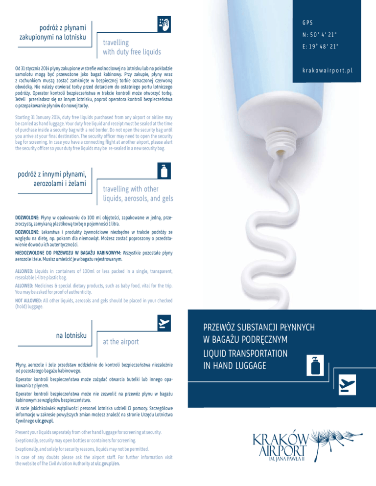 podróż z płynami zakupionymi na lotnisku GPS N: 50° 4' 21" travelling with duty free liquids Od 31 stycznia 2014 płyny zakupione w strefie wolnocłowej na lotnisku lub na pokładzie samolotu mogą być przewożone jako bagaż kabinowy. Przy zakupie, płyny wraz z rachunkiem muszą zostać zamknięte w bezpiecznej torbie oznaczonej czerwoną obwódką. Nie należy otwierać torby przed dotarciem do ostatniego portu lotniczego podróży. Operator kontroli bezpieczeństwa w trakcie kontroli może otworzyć torbę. Jeżeli przesiadasz się na innym lotnisku, poproś operatora kontroli bezpieczeństwa o przepakowanie płynów do nowej torby. E: 19° 48' 21" krakowairport.pl Starting 31 January 2014, duty free liquids purchased from any airport or airline may be carried as hand luggage. Your duty free liquid and receipt must be sealed at the time of purchase inside a security bag with a red border. Do not open the security bag until you arrive at your final destination. The security officer may need to open the security bag for screening. In case you have a connecting flight at another airport, please alert the security officer so your duty free liquids may be re-sealed in a new security bag. podróż z innymi płynami, aerozolami i żelami travelling with other liquids, aerosols, and gels DOZWOLONE: Płyny w opakowaniu do 100 ml objętości, zapakowane w jedną, przezroczystą, zamykaną plastikową torbę o pojemności 1 litra. DOZWOLONE: Lekarstwa i produkty żywnościowe niezbędne w trakcie podróży ze względu na dietę, np. pokarm dla niemowląt. Możesz zostać poproszony o przedstawienie dowodu ich autentyczności. NIEDOZWOLONE DO PRZEWOZU W BAGAŻU KABINOWYM: Wszystkie pozostałe płyny aerozole i żele. Musisz umieścić je w bagażu rejestrowanym. ALLOWED: Liquids in containers of 100ml or less packed in a single, transparent, resealable 1-litre plastic bag. ALLOWED: Medicines & special dietary products, such as baby food, vital for the trip. You may be asked for proof of authenticity. NOT ALLOWED: All other liquids, aerosols and gels should be placed in your checked (hold) luggage. na lotnisku at the airport Płyny, aerozole i żele przedstaw oddzielnie do kontroli bezpieczeństwa niezależnie od pozostałego bagażu kabinowego. Operator kontroli bezpieczeństwa może zażądać otwarcia butelki lub innego opakowania z płynem. Operator kontroli bezpieczeństwa może nie zezwolić na przewóz płynu w bagażu kabinowym ze względów bezpieczeństwa. W razie jakichkolwiek wątpliwości personel lotniska udzieli Ci pomocy. Szczegółowe informacje w zakresie powyższych zmian możesz znaleźć na stronie Urzędu Lotnictwa Cywilnego ulc.gov.pl. Present your liquids seperately from other hand luggage for screening at security. Exeptionally, security may open bottles or containers for screening. Exeptionally, and solely for security reasons, liquids may not be permitted. In case of any doubts please ask the airport staff. For further information visit the website of The Civil Aviation Authority at ulc.gov.pl/en. PRZEWÓZ SUBSTANCJI PŁYNNYCH W BAGAŻU PODRĘCZNYM LIQUID TRANSPORTATION IN HAND LUGGAGE jakie płyny mogę zabrać w bagażu kabinowym? which liquids can I take on my flight as hand luggage? szczegółowe informacje dot. przewózu płynów, aerozoli i żeli further information on liquids, aerosols and gels Jedynie niektóre kategorie substancji płynnych mogą być przewożone jako bagaż kabinowy. Należy przedstawić je do kontroli bezpieczeństwa. Only certain liquids may be carried as hand luggage and they must be presented at security. Definicja substancji płynnych obejmuje: The definition of Liquids includes: - wodę i inne napoje, zupy, syropy, dżemy, - perfumy, - żele (np. do włosów, kąpieli), - pasty (w tym pasty do zębów), - kosmetyki w płynnej formie (błyszczyk, podkład, tusz do rzęs), - kremy, balsamy, - spraye, - substancje płynne pod ciśnieniem (np. żele do golenia, dezodoranty), - inne substancje o podobnej konsystencji. - water and other drinks, soups, syrups, jams, - perfumes, - gels (e.g. hair gel, bath gel), - pastes (including toothpaste), - cosmetics (lip gloss, foundation, mascara), - cremes, lotions, - sprays, - aerosols (shaving foams, deodorants), - other items of similar consistency. można zabrać na pokład you can take State: Manufacturer: Leki i inne produkty przeznaczone do użycia w trakcie podróży do celów leczniczych lub ze względu na specjalne wymogi w zakresie diety z uwzględnieniem żywności dla niemowląt. nie można zabrać na pokład Pozostałe płyny, aerozole i żele nie mogą zostać zabrane na pokład. Należy umieścić je w bagażu rejestrowanym. Do not open until nal destination Contents may be conscated if bag is tampered with DO NOT OPEN - or N ame of the Airport -o any other continous messa g e or d sign e r max. 100 ml max. 100 ml max. 100 ml max. 100 ml max. 100 ml max. 100 ml max. 100 ml Płyny w opakowaniach do 100 ml objętości, w jednej przezroczystej, zamykanej torbie o pojemności nie przekraczającej 1 litra (torebki są dostępne w punkcie informacji lotniskowej lub na stanowiskach kontroli bezpieczeństwa). Każdy pasażer może zabrać tylko jedną litrową plastikową torebkę. Receipt place (inside bag) DO NOT OPEN - or the name of th e airport or any other continous message or design over the edge of bag max. 100 ml ba g max. 100 ml max. 100 ml airport or any other continous message or design over the edge of ba g max. 100 ml Od 31 stycznia 2014 roku Płyny zakupione w strefie wolnocłowej na lotnisku lub na pokładzie przewoźnika, zapakowane w specjalną torbę (STEB) szczelnie zamkniętą (pakowania dokonuje sprzedawca) z widocznym dowodem zakupu lub identyfikatorem miejsca zakupu. DO NOT OPEN - or the name of the airport or any other continous message or design over the edge of Do not open until nal destination Contents may be conscated if bag is tampered with DO NOT OPEN - or N a