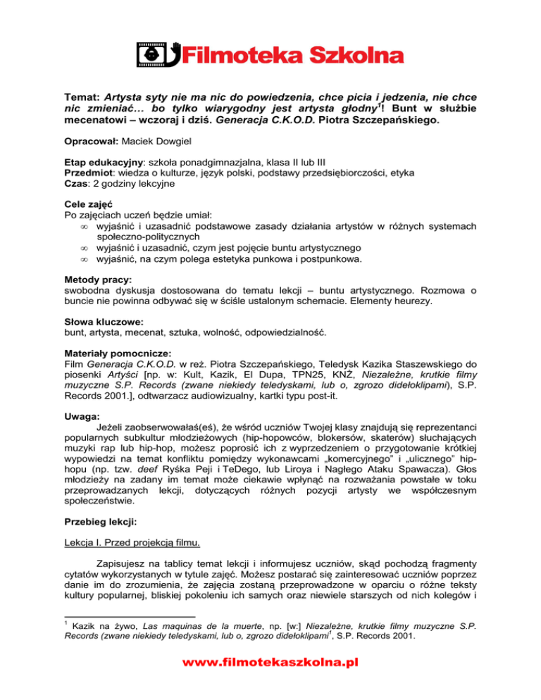 Temat: Artysta syty nie ma nic do powiedzenia, chce picia i jedzenia, nie chce nic zmieniać… bo tylko wiarygodny jest artysta głodny1! Bunt w służbie mecenatowi – wczoraj i dziś. Generacja C.K.O.D. Piotra Szczepańskiego. Opracował: Maciek Dowgiel Etap edukacyjny: szkoła ponadgimnazjalna, klasa II lub III Przedmiot: wiedza o kulturze, język polski, podstawy przedsiębiorczości, etyka Czas: 2 godziny lekcyjne Cele zajęć Po zajęciach uczeń będzie umiał: • wyjaśnić i uzasadnić podstawowe zasady działania artystów w różnych systemach społeczno-politycznych • wyjaśnić i uzasadnić, czym jest pojęcie buntu artystycznego • wyjaśnić, na czym polega estetyka punkowa i postpunkowa. Metody pracy: swobodna dyskusja dostosowana do tematu lekcji – buntu artystycznego. Rozmowa o buncie nie powinna odbywać się w ściśle ustalonym schemacie. Elementy heurezy. Słowa kluczowe: bunt, artysta, mecenat, sztuka, wolność, odpowiedzialność. Materiały pomocnicze: Film Generacja C.K.O.D. w reż. Piotra Szczepańskiego, Teledysk Kazika Staszewskiego do piosenki Artyści [np. w: Kult, Kazik, El Dupa, TPN25, KNŻ, Niezależne, krutkie filmy muzyczne S.P. Records (zwane niekiedy teledyskami, lub o, zgrozo didełoklipami), S.P. Records 2001.], odtwarzacz audiowizualny, kartki typu post-it. Uwaga: Jeżeli zaobserwowałaś(eś), że wśród uczniów Twojej klasy znajdują się reprezentanci popularnych subkultur młodzieżowych (hip-hopowców, blokersów, skaterów) słuchających muzyki rap lub hip-hop, możesz poprosić ich z wyprzedzeniem o przygotowanie krótkiej wypowiedzi na temat konfliktu pomiędzy wykonawcami „komercyjnego” i „ulicznego” hiphopu (np. tzw. deef Ryśka Peji i TeDego, lub Liroya i Nagłego Ataku Spawacza). Głos młodzieży na zadany im temat może ciekawie wpłynąć na rozważania powstałe w toku przeprowadzanych lekcji, dotyczących różnych pozycji artysty we współczesnym społeczeństwie. Przebieg lekcji: Lekcja I. Przed projekcją filmu. Zapisujesz na tablicy temat lekcji i informujesz uczniów, skąd pochodzą fragmenty cytatów wykorzystanych w tytule zajęć. Możesz postarać się zainteresować uczniów poprzez danie im do zrozumienia, że zajęcia zostaną przeprowadzone w oparciu o różne teksty kultury popularnej, bliskiej pokoleniu ich samych oraz niewiele starszych od nich kolegów i 1 Kazik na żywo, Las maquinas de la muerte, np. [w:] Niezależne, krutkie filmy muzyczne S.P. 1 Records (zwane niekiedy teledyskami, lub o, zgrozo didełoklipami , S.P. Records 2001. www.filmotekaszkolna.pl koleżanek. Następnie pytasz, czy zgadzają się z powyższym stwierdzeniem i prosisz o rozwinięcie podanych myśli i skojarzeń. W celu wywołania dyskusji możesz zadać pytania pomocnicze: Kim, zdaniem uczniów, jest artysta? Co to znaczy być artystą? Czy artysta to zawód czy misja? Czyim głosem mówią współcześni artyści? Co znaczy powiedzenie, że artysta jest sumieniem narodu? Czym się różni artysta od celebryty? Uczniowie starają się uzasadnić odpowiedzi, odwołując się do przykładów z kultury elitarnej i kultury popularnej. Jeżeli wśród głosów uczniów pojawią się ciekawe spostrzeżenia, które Twoim zdaniem, mogą okazać się przydatne w dalszej części lekcji, warto wynotować je na tablicy. Ostatnie pomocnicze pytanie, moderujące dyskusję, powinno dotyczyć form sponsorowania artystów przez państwo lub producentów płytowych. Warto tak prowadzić dyskusję, aby w wypowiedziach uczniów pojawiły się sformułowania: (odnoszące się do przeszłości) mecenat państwa, cenzura, kolaudacja oraz (do teraźniejszości) show-biznes, wolność słowa, komercjalizacja kultury. Jeżeli w wypowiedziach uczniów nie pojawiają się w/w pojęcia – tłumaczysz je odwołując się do znanych Ci przykładów. Po zakończeniu dyskusji i wyciągnięciu wniosków końcowych prosisz uczniów o krótkie wnioski podsumowujące oraz zapowiadasz projekcję teledysku Kazika Staszewskiego pt. Artyści (załącznik I). Projekcja teledysku. Pogadankę po projekcji otwierasz pytaniem do uczniów: czy wiecie, dlaczego właśnie ten teledysk został wybrany do pracy na dzisiejszych zajęciach? W dalszej części dyskusji możesz posługiwać się pytaniami pomocniczymi: co uczniowie zrozumieli z przedstawionego im materiału? Kim, zdaniem Kazika, jest artysta, komu służy? Czy piosenka Kazika nosi znamiona autotematyzmu? Czy ostra krytyka polskich artystów jest uzasadniona? Jakie gwiazdy polskiego ekranu uczniowie rozpoznali podczas projekcji krótkiego filmu oraz którzy politycy wręczają im odznaczenia i publicznie się z nimi „bratają” – uwaga ze względu na różnice pokoleniowe młodzi ludzie mogę nie rozpoznać wizerunków polityków i aktorów. W tym celu można wykorzystać zdjęcia opatrzone odpowiednim komentarzem zawarte w załączniku II. Dyskusja powinna zawierać wypowiedzi odnoszące się do roli artysty w czasach PRL-u, tworzenia na pograniczu cenzury lub w kooperacji z nią oraz zależności pomiędzy polskimi artystami, a peerelowskimi władzami. W toku omawiania teledysku zwracasz uwagę na postpunkową stylistykę teledysku, może to okazać się przydatne przy omówieniu wizualnej warstwy filmu Generacja C.K.O.D. na kolejnych zajęciach. Na zakończenie wprowadzasz pojęcie buntu pokoleniowego, obecnego wśród polskich artystów. Swą wypowiedź egzemplifikujesz znanymi Ci przykładami. Wykład kończysz refleksją na temat Pokolenia NIC (najlepiej z wykorzystaniem artykułu Kuby Wandachowicza – Generacja Nic, „Gazeta Wyborcza”, 5 września 2002). Prosisz, aby uczniowie na kolejne zajęcia przeczytali wywiad z Kubą Wandachowiczem [załącznik 2] oraz zastanowili się, jakie obowiązki ma artysta wobec społeczeństwa, wobec własnej rodziny oraz wobec samego siebie. www.filmotekaszkolna.pl Lekcja II. Po projekcji filmu. Rozpoczynasz rozmową o filmie od omówienia retrospektywnej