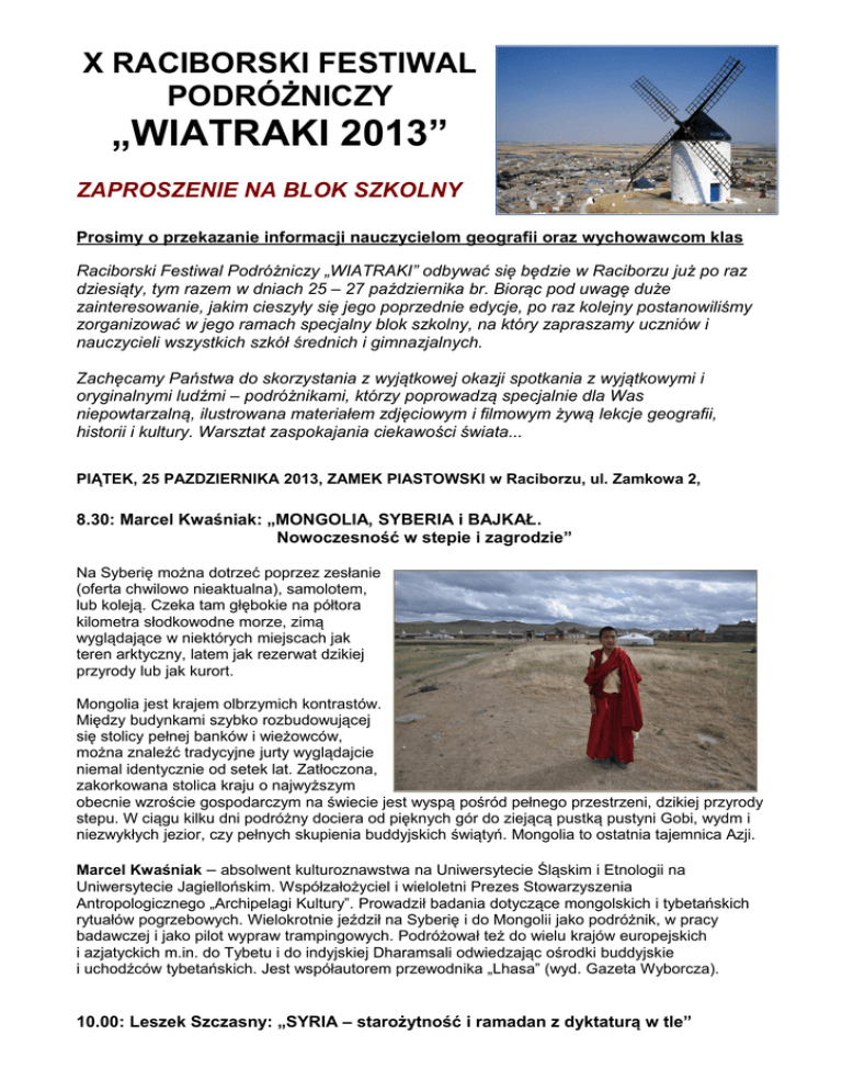 X RACIBORSKI FESTIWAL PODRÓŻNICZY „WIATRAKI 2013” ZAPROSZENIE NA BLOK SZKOLNY Prosimy o przekazanie informacji nauczycielom geografii oraz wychowawcom klas Raciborski Festiwal Podróżniczy „WIATRAKI” odbywać się będzie w Raciborzu już po raz dziesiąty, tym razem w dniach 25 – 27 października br. Biorąc pod uwagę duże zainteresowanie, jakim cieszyły się jego poprzednie edycje, po raz kolejny postanowiliśmy zorganizować w jego ramach specjalny blok szkolny, na który zapraszamy uczniów i nauczycieli wszystkich szkół średnich i gimnazjalnych. Zachęcamy Państwa do skorzystania z wyjątkowej okazji spotkania z wyjątkowymi i oryginalnymi ludźmi – podróżnikami, którzy poprowadzą specjalnie dla Was niepowtarzalną, ilustrowana materiałem zdjęciowym i filmowym żywą lekcje geografii, historii i kultury. Warsztat zaspokajania ciekawości świata... PIĄTEK, 25 PAZDZIERNIKA 2013, ZAMEK PIASTOWSKI w Raciborzu, ul. Zamkowa 2, 8.30: Marcel Kwaśniak: „MONGOLIA, SYBERIA i BAJKAŁ. Nowoczesność w stepie i zagrodzie” Na Syberię można dotrzeć poprzez zesłanie (oferta chwilowo nieaktualna), samolotem, lub koleją. Czeka tam głębokie na półtora kilometra słodkowodne morze, zimą wyglądające w niektórych miejscach jak teren arktyczny, latem jak rezerwat dzikiej przyrody lub jak kurort. Mongolia jest krajem olbrzymich kontrastów. Między budynkami szybko rozbudowującej się stolicy pełnej banków i wieżowców, można znaleźć tradycyjne jurty wyglądajcie niemal identycznie od setek lat. Zatłoczona, zakorkowana stolica kraju o najwyższym obecnie wzroście gospodarczym na świecie jest wyspą pośród pełnego przestrzeni, dzikiej przyrody stepu. W ciągu kilku dni podróżny dociera od pięknych gór do ziejącą pustką pustyni Gobi, wydm i niezwykłych jezior, czy pełnych skupienia buddyjskich świątyń. Mongolia to ostatnia tajemnica Azji. Marcel Kwaśniak – absolwent kulturoznawstwa na Uniwersytecie Śląskim i Etnologii na Uniwersytecie Jagiellońskim. Współzałożyciel i wieloletni Prezes Stowarzyszenia Antropologicznego „Archipelagi Kultury”. Prowadził badania dotyczące mongolskich i tybetańskich rytuałów pogrzebowych. Wielokrotnie jeździł na Syberię i do Mongolii jako podróżnik, w pracy badawczej i jako pilot wypraw trampingowych. Podróżował też do wielu krajów europejskich i azjatyckich m.in. do Tybetu i do indyjskiej Dharamsali odwiedzając ośrodki buddyjskie i uchodźców tybetańskich. Jest współautorem przewodnika „Lhasa” (wyd. Gazeta Wyborcza). 10.00: Leszek Szczasny: „SYRIA – starożytność i ramadan z dyktaturą w tle” „Zaczynam od przeczekiwania burzy pyłowej w najbardziej zacofanych regionach Syrii wschodniej. Przy samej granicy z Irakiem w jednej z wiosek służę miejscowym jako telewizor. Zaraz potem nad Eufratem rozwikłuję biblijną legendę. Później mam już czas na odkrywanie zagubionych oaz i słynnych miejsc starożytnych (np. Palmyra, Apamea, Bosra). Współczuję wielbłądom i żałuję, że dżalabija nie jest bawełniana. Bez większego entuzjazmu oglądam zamki krzyżowców i tzw. umarłe miasta. Natomiast zaurocza mnie Maluula wciąż mówiąca językiem aramejskim oraz Hama z kunsztownymi noriami. Nie mogę też nie zajrzeć do dwóch syryjskich metropolii Aleppo i Damaszku, nie stroniąc przy tym od komentarzy dotyczących smutnej rzeczywistości tego zniewolonego kraju. W tle zaś widać Syrię jako skansen starych samochodów - 40-letnich mercedesów, volvo i fordów... Mówię o najstarszym alfabecie świata z Ugarit i o przeszkodach we współczesnym języku arabskim. Wielką atrakcją pokazu są ponadto bardzo bezpośrednie szczegóły ramadanu - przez cały czas mojej obecności w Syrii trwał bowiem muzułmański post...” Leszek Szczasny – jest raciborzaninem (ur. 1975), z wykształcenia politologiem i filozofem (UJ), a z zamiłowania społecznikiem, fotografem i niezależnym globtroterem. Ma mnóstwo energii, zmysł obserwacji i swoje zdanie. Ponieważ podróżuje naprawdę za grosze, jest żywym dowodem na to, że „chcieć to móc”. Wydał książkę pt. „Świat na wyciągnięcie ręki”. 11.30: Arun Milcarz: „M. jak MADAGASKAR” „Air France zgubił mój plecak. 2500 km przebyłem w klapkach, kąpielówkach i koszulce. Miał być król Julian i pingwin Kowalski. Szybko zrozumiałem, że film Madagaskar… nie jest oparty na faktach” Podczas spotkania zdobędziemy odpowiedź na wiele pytań ;) - Co ma wspólnego olej palmowy z irokezem? - Co malgasze zabierają do pracy? - Jak żandarm może dorobić na boku? - Czy można zwulkanizować kurę? - Co kobiety lubią najbardziej? Arun Milcarz – jest experymentatorem. Od wielu lat podróżuje z kamerą próbując dowiedzieć się jak rzeczy mają się naprawdę. Działa w pojedynkę, dzięki czemu wnika w życie ludzi. Wie, że tylko przez doświadczenie pracy i wspólnego jedzenia można wejść w szczerą relację z drugim, odległym nam kulturowo człowiekiem. Poprzez pracę i mieszkanie z tubylcami poznaje ich rodziny i rytuały. Rozgłos przyniosła mu samotna wyprawa „Afryka Maraton”, za którą w 2005 roku otrzymał statuetkę KOLOSA w kategorii „podróże”. Jako prelegent utworzył własny styl „kabaret podróżniczy” Na blok szkolny zapraszamy grupy, po wcześniejszym dokonaniu rezerwacji – 502 557 238 Bilet na jedno spotkanie w bloku szkolnym: 8 zł / pokaz (wystawiamy faktury VAT) Zapraszam serdecznie: Dawid Wacławczyk – dyrektor festiwalu