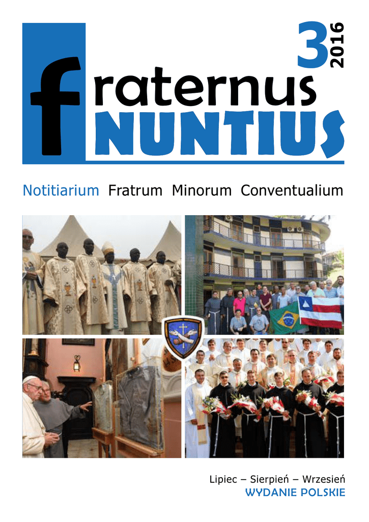 2016 f 3 raternus NUNTIUS Notitiarium Fratrum Minorum Conventualium Lipiec – Sierpień – Wrzesień WYDANIE POLSKIE 2 SPIS TREŚCI QQ URZĘDY GENERALNE SGF Wydarzenia w SGF ......................................................................... Afryka: formacja gwardianów .................................................... SGAM Jednoczyć się w misji .................................................................... Bruksela: kurs dla nowych misjonarzy .................................... GPSC Montreal: Światowe Forum Społeczne ................................... MI Prezes międzynarodowy MI w Brazylii ................................... MI na ŚDM ......................................................................................... OFS Nowy asystent generalny FZŚ ................................................... 10 10 11 12 13 14 14 15 EKONOMAT Tablica solidarności ....................................................................... 16 QQ KONFERENCJE/FEDERACJE AFCOF Kenia: święcenia kapłańskie ........................................................ 17 Ghana: najnowsze wydarzenia ................................................... 17 Tanzania: najnowsze wydarzenia .............................................. 18 Zambia: najnowsze wydarzenia ................................................. 19 Uganda: rok niespodzianek ......................................................... 20 Burkina Faso: jubileusz misji ........................................................ 21 Afryka: spotkanie ekonomów ..................................................... 22 Kenia: śluby wieczyste ................................................................... 22 Spotkanie AFCOF z Centrum Misyjnym .................................. 23 Zambia i Malawi na pielgrzymce................................................ 23 CEO Prowincjałowie franciszkańscy do młodzieży na ŚDM 2016 ..................................................................................... 24 CEF Fryburg: poświęcenie klasztoru ................................................. 25 CFF Wspólny postulat dla CFF ............................................................. 26 Nowicjat CFF: otwarcie i pierwsza profesja ............................ 27 Spotkanie dwóch prowincjałów ................................................ 28 FALC Brazylia: wydarzenia prowincjalne ........................................... 29 Brazylia: zgromadzenie plenarne FALC ................................... 29 Brazylia: święcenia kapłańskie .................................................... 30 Minister generalny w Brazylii ...................................................... 31 Drugi nowicjat na Kubie ............................................................... 31 Chile: tydzień formacyjny ............................................................. 32 FAMC Indonezja: wydarzenia formacyjne ......................................... 33 Wietnam: ze wspólnego nowicjatu FAMC .............................. 34 Japonia: 75-lecie męczeństwa św. Maksymiliana ................ 34 Filipiny: pierwsza profesja zakonna .......................................... 35 Wietnam: wydarzenia formacyjne ............................................ 35 FIMP Kilka słów o fr. Quirico Pignalberim .......................................... 37 Spotkanie wychowawców FIMP ................................................ 38 Drugi nowicjat FIMP........................................................................ 38 Franciszkańska misja nad Tybrem ............................................. 39 Rumunia: nowi profesi .................................................................. 40 Wędrowanie na „ruta jacobea” .................................................... 40 QQ KAPITUŁY Kenia: kapituła zwyczajna – cz. II ............................................... 41 Hiszpania: kapituła zwyczajna – cz. II ....................................... 41 Ghana: kapituła nadzwyczajna .................................................. 42 Zambia: kapituła zwyczajna – cz. II ........................................... 43 QQ DANE STATYSTYCZNE Śluby – święcenia ........................................................................... 44 Odeszli do Pana ............................................................................... 45 n FRATERNUS NUNTIUS: Notitiarium Fratrum Minorum Conventualium [3/2016] n wydawca: Sekretariat generalny 00187 Roma, Piazza Ss. Apostoli, 51; tel. (+39) 06.69957319; fax (+39) 06.69957321 n www.ofmconv.net n [email protected] n redaktor prowadzący i DTP – fr. Ryszard Wróbel OFMConv n tłumaczenia (z wyjątkiem podpisanych inaczej) – fr. Ryszard Wróbel OFMConv n numer został zamknięty 30 września 2016 r. FraternusNuntius 3/2016 KALENDARIUM MINISTRA GENERALNEGO ............................. 3 QQ AKTA DEFINITORIUM Sesja 27 czerwca – 2 lipca i 7 sierpnia 2016 r. .......................... 3 Sesja 12-17 września 2016 r. .......................................................... 5 QQ WYDARZENIA Ameryka Łacińska i Karaiby: 70 lat obecności OFMConv .... 7 Generałowie franciszkańscy do młodzieży ............................... 8 Nowy tłumacz na język polski........................................................ 9 Rozdział III Konstytucji w klasztorach.......................................... 9 3 MINISTER GENERALNY Fr. Marco TASCA KALENDARIUM MINISTRA GENERALNEGO LIPIEC 27/06-2/07: 11-17: 26-31: Rzym: sesja Definitorium generalnego Rio de Janeiro (Brazylia): kongres FALC Kraków (Polska): Światowe Dni Młodzieży SIERPIEŃ 4: 15-20: 22-28: Asyż-sanktuarium Matki Bożej Anielskiej: spotkanie z papieżem Franciszkiem Brazylia-Bahia: wizyta braterska i spotkanie z ministrami prowincjalnymi Chile: wizyta braterska WRZESIEŃ 2-9: 12-17: 18-24: Pielgrzymka do Ziemi Świętej i Jordanii Rzym: sesja Definitorium generalnego Rzym-Asyż: spotkanie z ministrami, kustoszami i delegatami prowincjalny