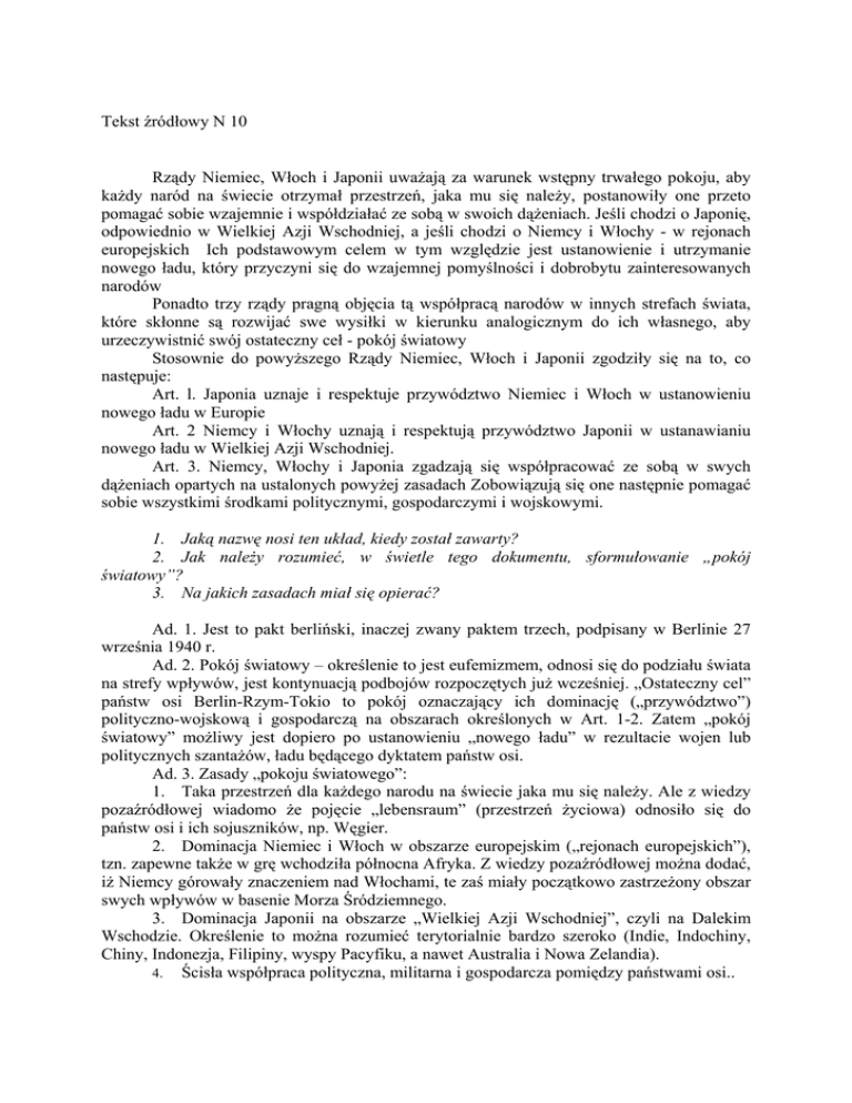 Tekst źródłowy N 10 Rządy Niemiec, Włoch i Japonii uważają za warunek wstępny trwałego pokoju, aby każdy naród na świecie otrzymał przestrzeń, jaka mu się należy, postanowiły one przeto pomagać sobie wzajemnie i współdziałać ze sobą w swoich dążeniach. Jeśli chodzi o Japonię, odpowiednio w Wielkiej Azji Wschodniej, a jeśli chodzi o Niemcy i Włochy - w rejonach europejskich Ich podstawowym celem w tym względzie jest ustanowienie i utrzymanie nowego ładu, który przyczyni się do wzajemnej pomyślności i dobrobytu zainteresowanych narodów Ponadto trzy rządy pragną objęcia tą współpracą narodów w innych strefach świata, które skłonne są rozwijać swe wysiłki w kierunku analogicznym do ich własnego, aby urzeczywistnić swój ostateczny ceł - pokój światowy Stosownie do powyższego Rządy Niemiec, Włoch i Japonii zgodziły się na to, co następuje: Art. l. Japonia uznaje i respektuje przywództwo Niemiec i Włoch w ustanowieniu nowego ładu w Europie Art. 2 Niemcy i Włochy uznają i respektują przywództwo Japonii w ustanawianiu nowego ładu w Wielkiej Azji Wschodniej. Art. 3. Niemcy, Włochy i Japonia zgadzają się współpracować ze sobą w swych dążeniach opartych na ustalonych powyżej zasadach Zobowiązują się one następnie pomagać sobie wszystkimi środkami politycznymi, gospodarczymi i wojskowymi. 1. Jaką nazwę nosi ten układ, kiedy został zawarty? 2. Jak należy rozumieć, w świetle tego dokumentu, sformułowanie „pokój światowy”? 3. Na jakich zasadach miał się opierać? Ad. 1. Jest to pakt berliński, inaczej zwany paktem trzech, podpisany w Berlinie 27 września 1940 r. Ad. 2. Pokój światowy – określenie to jest eufemizmem, odnosi się do podziału świata na strefy wpływów, jest kontynuacją podbojów rozpoczętych już wcześniej. „Ostateczny cel” państw osi Berlin-Rzym-Tokio to pokój oznaczający ich dominację („przywództwo”) polityczno-wojskową i gospodarczą na obszarach określonych w Art. 1-2. Zatem „pokój światowy” możliwy jest dopiero po ustanowieniu „nowego ładu” w rezultacie wojen lub politycznych szantażów, ładu będącego dyktatem państw osi. Ad. 3. Zasady „pokoju światowego”: 1. Taka przestrzeń dla każdego narodu na świecie jaka mu się należy. Ale z wiedzy pozaźródłowej wiadomo że pojęcie „lebensraum” (przestrzeń życiowa) odnosiło się do państw osi i ich sojuszników, np. Węgier. 2. Dominacja Niemiec i Włoch w obszarze europejskim („rejonach europejskich”), tzn. zapewne także w grę wchodziła północna Afryka. Z wiedzy pozaźródłowej można dodać, iż Niemcy górowały znaczeniem nad Włochami, te zaś miały początkowo zastrzeżony obszar swych wpływów w basenie Morza Śródziemnego. 3. Dominacja Japonii na obszarze „Wielkiej Azji Wschodniej”, czyli na Dalekim Wschodzie. Określenie to można rozumieć terytorialnie bardzo szeroko (Indie, Indochiny, Chiny, Indonezja, Filipiny, wyspy Pacyfiku, a nawet Australia i Nowa Zelandia). 4. Ścisła współpraca polityczna, militarna i gospodarcza pomiędzy państwami osi..