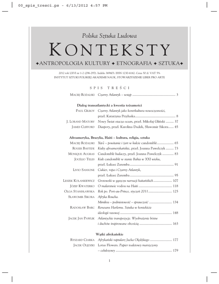 00_spis_tresci.ps - 6/13/2012 4:57 PM Polska Sztuka Ludowa KONTEKSTY F ANTROPOLOGIA KULTURY F ETNOGRAFIA F SZTUKAF 2012 rok LXVI nr 1-2 (296-297). Indeks 369403. ISSN 1230-6142. Cena 50 zł. VAT 5% INSTYTUT SZTUKI POLSKIEJ AKADEMII NAUK, STOWARZYSZENIE LIBER PRO ARTE S P I S MACIEJ ROŻALSKI T R E Ś C I Czarny Atlantyk – wstęp ................................................. 3 Dialog transatlantycki a kwestia tożsamości PAUL GILROY Czarny Atlantyk jako kontrkultura nowoczesności, przeł. Katarzyna Przyłuska.............................................. 8 J. LORAND MATORY Nowy Świat otacza ocean, przeł. Mikołaj Gliński ......... 37 JAMES CLIFFORD Diaspory, przeł. Karolina Dudek, Sławomir Sikora...... 45 Afroameryka, Brazylia, Haiti – kultura, religia, sztuka MACIEJ ROŻALSKI e – powitanie i żart w kulcie candomblé................... 65 Xir^ ROGER BASTIDE Kulty afroamerykańskie, przeł. Joanna Pawelczyk ......... 73 MONIQUE AUGRAS Candomblé badaczy, przeł. Joanna Pawelczyk ............. 83 JOCÉLIO TELES Kult candomblé w stanie Bahia w XXI wieku, przeł. Łukasz Zaremba .................................................. 91 LIVIO SANSONE Cukier, ropa i Czarny Atlantyk, przeł. Łukasz Zaremba .................................................. 95 LESZEK KOLANKIEWICZ Grotowski w gąszczu narracji haitańskich ..................... 107 JÓZEF KWATERKO O malarstwie vodou na Haiti ...................................... 118 OLGA STANISŁAWSKA Rok po. Port-au-Prince, styczeń 2011........................... 125 SŁAWOMIR SIKORA Afryka Roucha. Mimikra – podmiotowość – sprawczość .......................... 134 RADOSŁAW BARC Renesans Harlemu. Sztuka w kontekście ideologii rasowej ........................................................... 148 JACEK JAN PAWLIK Atlantyckie transpozycje. Wyobrażenie bóstw i duchów inspirowane obcością ..................................... 163 Wątki afrykańskie RYSZARD CIARKA JACEK OLĘDZKI Afrykański raptularz Jacka Olędzkiego ......................... 177 Lotus Flowers. Papier toaletowy marszczony – celulozowy ................................................................ 179 1 00_spis_tresci.ps - 6/13/2012 4:57 PM ADAM RYBIŃSKI, MACIEJ ZĄBEK Obrazy Afryki i Afrykanów w oczach europejskich podróżników z końca XIX stulecia ................................ 197 ADAM RYBIŃSKI Ręka w rękę, czyli rzecz o tuareskim dążeniu do jedności i własnego państwa....................................................... 205 MAJAN GARLINSKI KAROLINA MARCINKOWSKA Obrazki z wystawy, przeł. Dorota Kulikiewicz ........... 225 Świat „tych o prześwitujących oczach” widziany przez króla Dadilahy Buta ............................................ 231 ŁUKASZ KAMIŃSKI „Kyendi” – kim jestem? ................................................ 238 Egzotyka – reminiscencje TOMASZ SZERSZEŃ „Documents”, czyli maszyna do deklasyfikacji: Problem podtytułu; Bezformie ....................................... 244 MARTA SKWARA „Dzicy” Witkacego – przemyślana odpowiedź na doświadczenie egzotyki? ........................................... 251 JOANNA RACZKOWSKA „W stronę światła Południa…” czyli Mirosława Żuławskiego odkrywanie Afryki ........... 265 Aporia? Cliché verre? Zwielokrotnione wizerunki MAŁGORZATA KITOWSKA-ŁYSIAK Światło-czułość. Czy Xięga bałwochwalcza Brunona Schulza mogłaby powstać bez cliché verre?....... 275 IRENA KOSSOWSKA Aporia: zwielokrotnione wizerunki, sparafrazowane obrazy ................................................. 285 O nihilizmie DARIUSZ CZAJA Noc ciemna. Nihilologia i wiara ................................... 298 Słyszalny krajobraz KRZYSZTOF LIPKA Ptasie uniwersum (ptaki artystycznie rozśpiewane)........ 313 Miejsca dzieła ANDRZEJ PIEŃKOS Samotnia romantycznego poety. Lamartine wśród winnic.. 327 Historia jednego obrazu w Studium Teatralnym Piotra Borowskiego na Lubelskiej ANTONI ZIEMBA Neapol i Luca Giordano (Luca Giordano, Trzej Królowie)................................ 334 BOGUSŁAW (SŁAWOMIR) BOBULA O obrazie Luca Giordano i kolekcji Stanisława Wydżgi ..... 339 ELŻBIETA FICOWSKA Jerzy Ficowski – urodziny poety .................................... 349 KRZYSZTOF CZYŻEWSKI Spojrzenie prosto w oczy. O obrazie Jerzego Ficowskiego... 353 Amulety i definicje, czyli szkic do portretu Jerzego Ficowskiego. Fragmenty listy dialogowej z filmu Pawła Woldana...... 355 Noty o autorach........................................................ 363 Summaries................................................................. 367 Contents .................................................................... 373 2