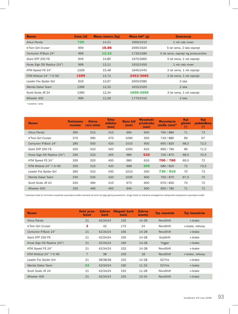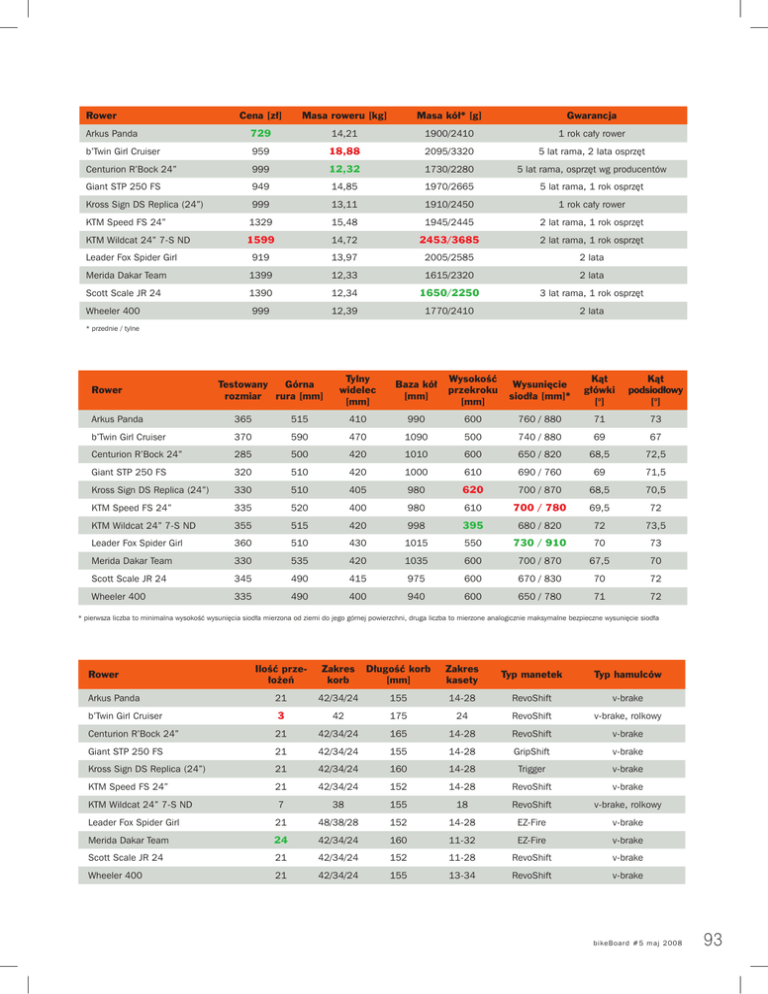 Rower Cena [zł] Masa roweru [kg] Masa kół* [g] Gwarancja Arkus Panda 729 14,21 1900/2410 1 rok cały rower b’Twin Girl Cruiser 959 18,88 2095/3320 5 lat rama, 2 lata osprzęt Centurion R’Bock 24” 999 12,32 1730/2280 5 lat rama, osprzęt wg producentów Giant STP 250 FS 949 14,85 1970/2665 5 lat rama, 1 rok osprzęt Kross Sign DS Replica (24”) 999 13,11 1910/2450 1 rok cały rower KTM Speed FS 24” 1329 15,48 1945/2445 2 lat rama, 1 rok osprzęt KTM Wildcat 24” 7-S ND 1599 14,72 2453/3685 2 lat rama, 1 rok osprzęt Leader Fox Spider Girl 919 13,97 2005/2585 2 lata Merida Dakar Team 1399 12,33 1615/2320 2 lata Scott Scale JR 24 1390 12,34 1650/2250 3 lat rama, 1 rok osprzęt 999 12,39 1770/2410 2 lata Wheeler 400 * przednie / tylne Rower Testowany Górna rozmiar rura [mm] Tylny widelec [mm] Baza kół [mm] Wysokość przekroku [mm] Wysunięcie siodła [mm]* Kąt główki [°] Kąt podsiodłowy [°] Arkus Panda 365 515 410 990 600 760 / 880 71 73 b’Twin Girl Cruiser 370 590 470 1090 500 740 / 880 69 67 Centurion R’Bock 24” 285 500 420 1010 600 650 / 820 68,5 72,5 Giant STP 250 FS 320 510 420 1000 610 690 / 760 69 71,5 Kross Sign DS Replica (24”) 330 510 405 980 620 700 / 870 68,5 70,5 KTM Speed FS 24” 335 520 400 980 610 700 / 780 69,5 72 KTM Wildcat 24” 7-S ND 355 515 420 998 395 680 / 820 72 73,5 Leader Fox Spider Girl 360 510 430 1015 550 730 / 910 70 73 Merida Dakar Team 330 535 420 1035 600 700 / 870 67,5 70 Scott Scale JR 24 345 490 415 975 600 670 / 830 70 72 Wheeler 400 335 490 400 940 600 650 / 780 71 72 * pierwsza liczba to minimalna wysokość wysunięcia siodła mierzona od ziemi do jego górnej powierzchni, druga liczba to mierzone analogicznie maksymalne bezpieczne wysunięcie siodła Ilość przełożeń Zakres korb Długość korb [mm] Zakres kasety Typ manetek Typ hamulców Arkus Panda 21 42/34/24 155 14-28 RevoShift v-brake b’Twin Girl Cruiser 3 42 175 24 RevoShift v-brake, rolkowy Centurion R’Bock 24” 21 42/34/24 165 14-28 RevoShift v-brake Giant STP 250 FS 21 42/34/24 155 14-28 GripShift v-brake Kross Sign DS Replica (24”) 21 42/34/24 160 14-28 Trigger v-brake KTM Speed FS 24” 21 42/34/24 152 14-28 RevoShift v-brake 7 38 155 18 RevoShift v-brake, rolkowy Leader Fox Spider Girl 21 48/38/28 152 14-28 EZ-Fire v-brake Merida Dakar Team 24 42/34/24 160 11-32 EZ-Fire v-brake Scott Scale JR 24 21 42/34/24 152 11-28 RevoShift v-brake Wheeler 400 21 42/34/24 155 13-34 RevoShift v-brake Rower KTM Wildcat 24” 7-S ND bi k e B o a r d # 5 m a j 2 0 0 8 93